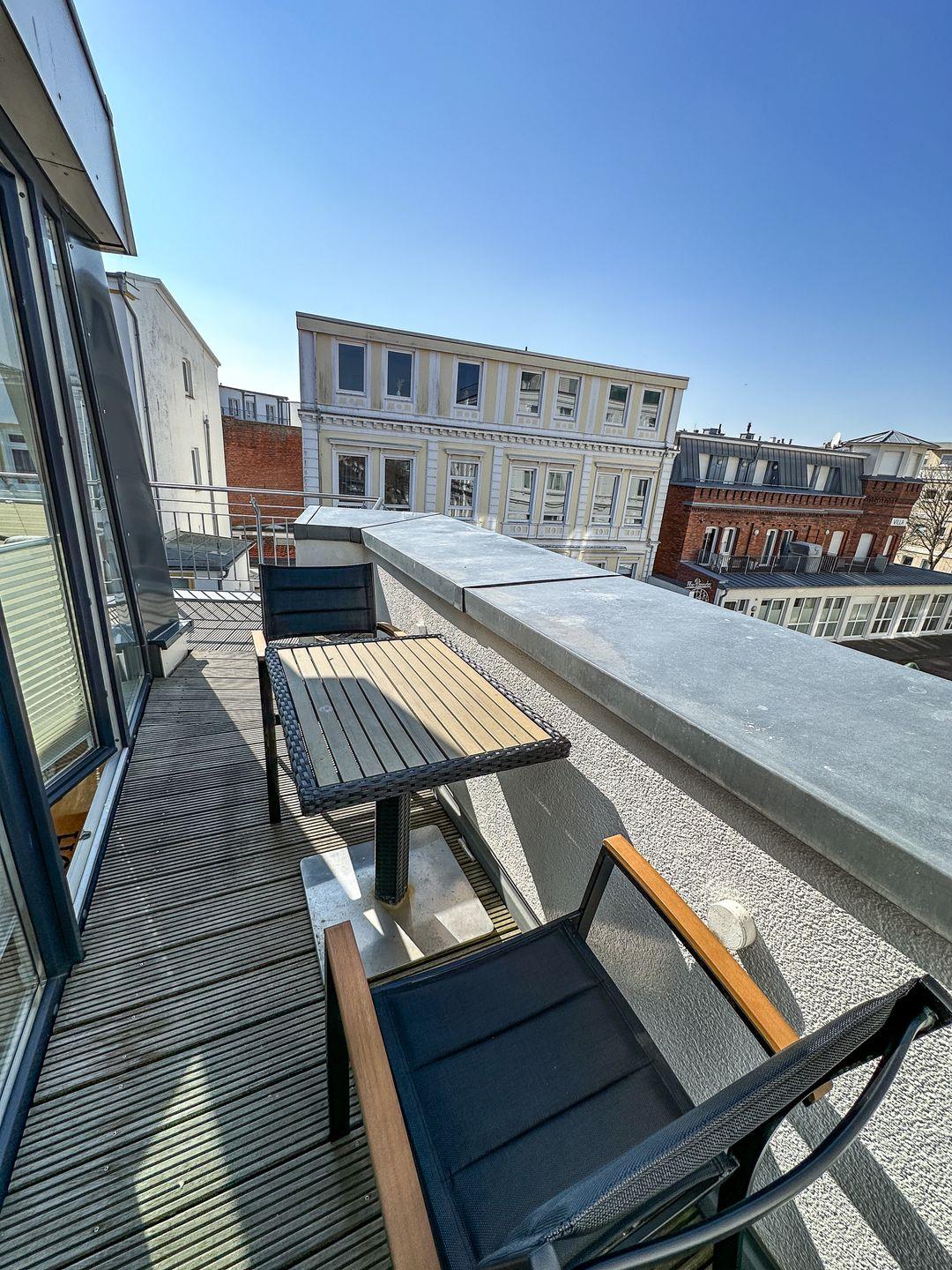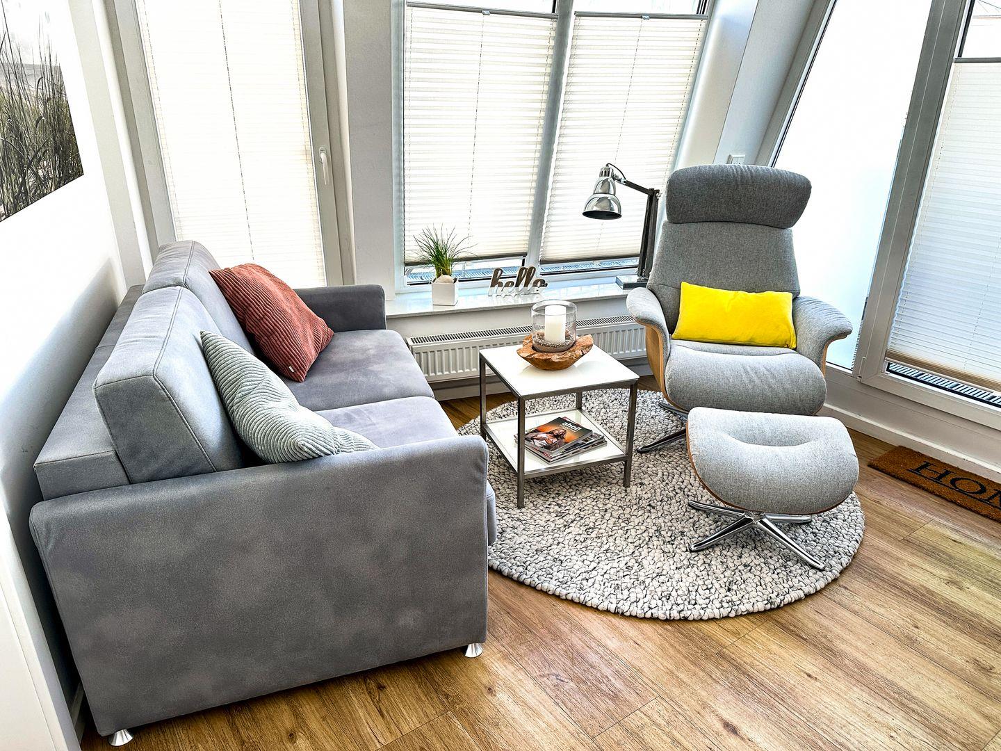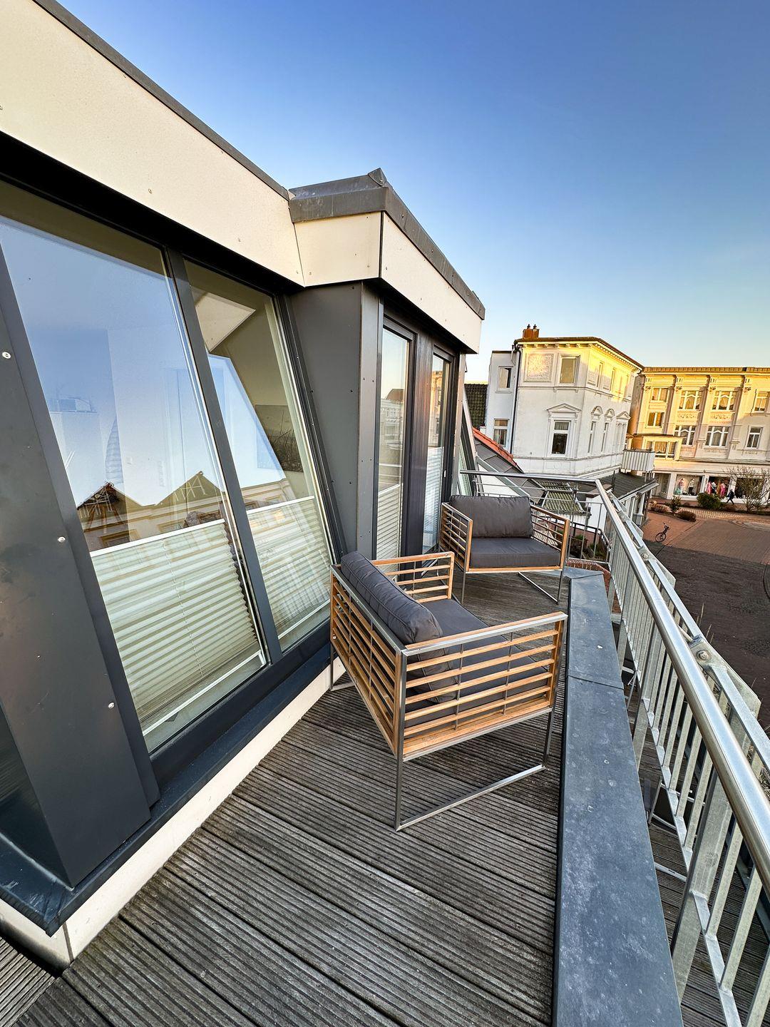 das Wohnzimmer mit Sofa und Essecke wird umrandet von einem Balkon, von dem aus Sie das Meer "die Heinrichstraße rauf" sehen können. Die vollausgestattete Küchenzeile befindet sich in einer Nische. Tageslichtbad mit Dusche/WC. Das separate Schlafzimmer mit Doppelbett verfügt über ein zusätzliches TV-Gerät. In der Seebox befinden sich 5 weitere Ferienwohnungen.