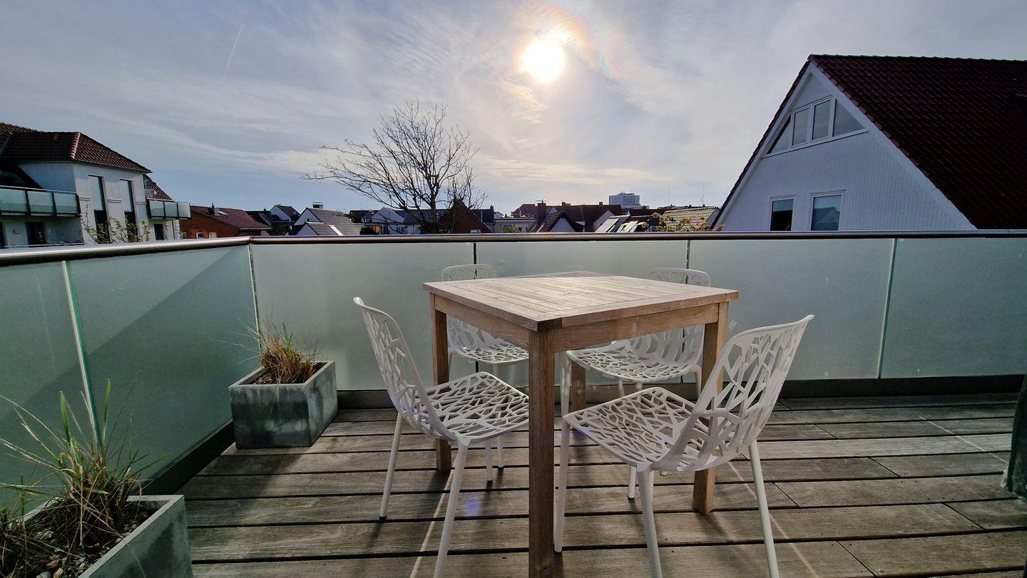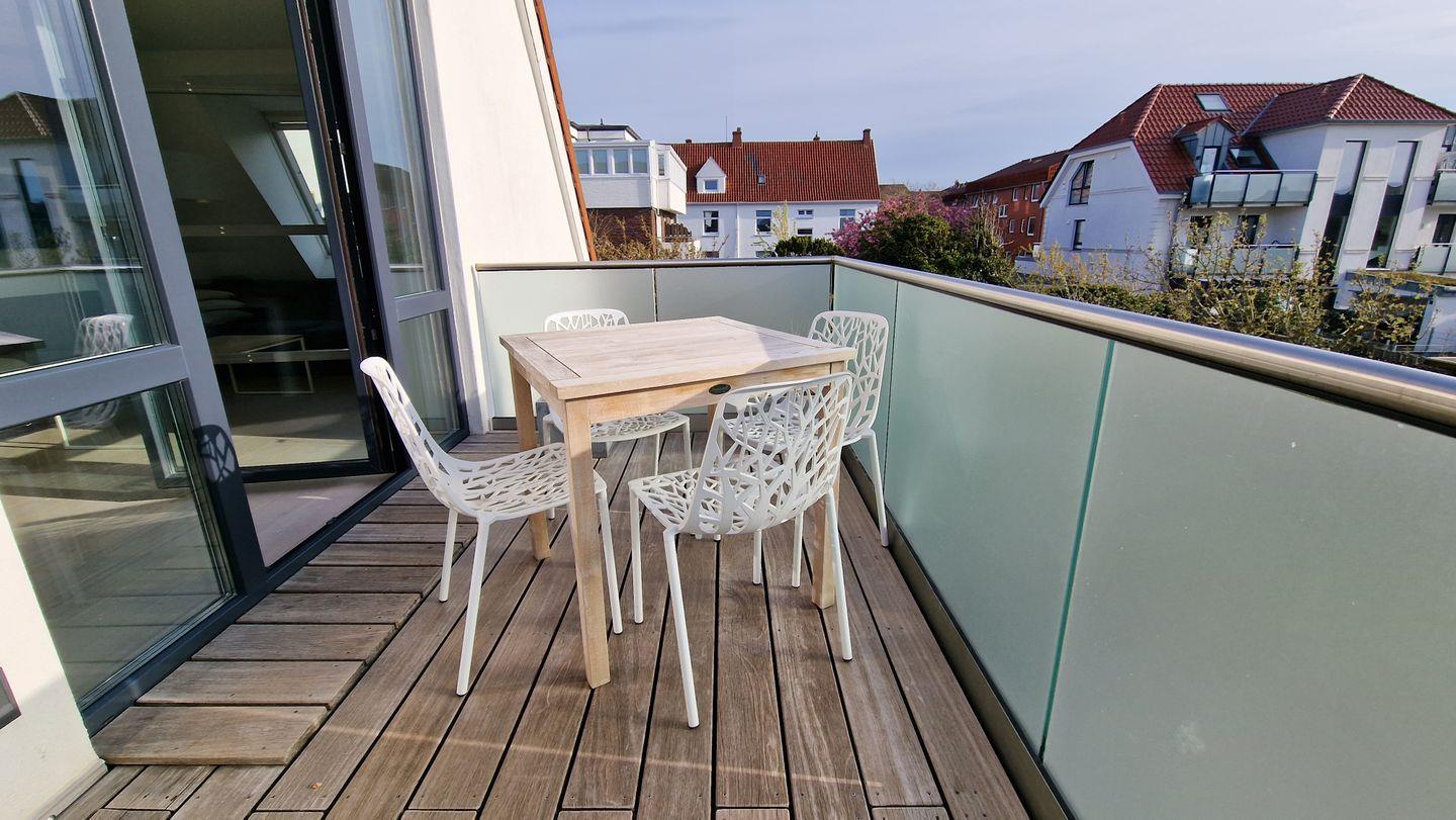 in der 1. Etage befindet sich eines der beiden Schlafzimmer mit Doppelbett (+TV), Tageslichtbad mit XXL-Dusche/WC und der helle Wohnraum mit moderner Küchenzeile. Der Balkon liegt Richtung Westen. Über eine Wendeltreppe erreichen Sie das 2. Schlafzimmer mit Doppelbett (+TV) im Dachgiebel und das 2. Tageslichtbad mit Dusche/WC. Auch ein kleiner Schreibtisch findet dort Platz.