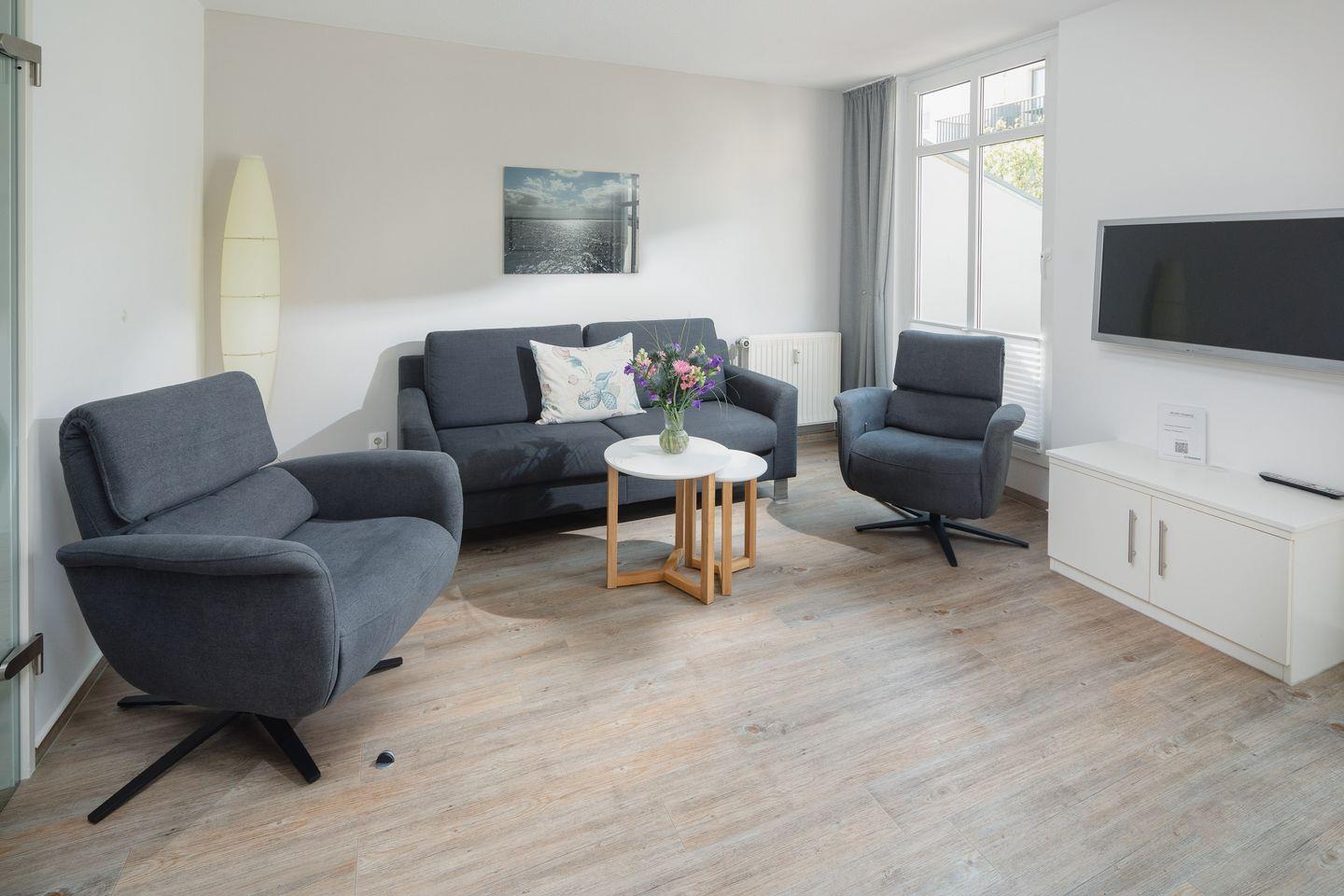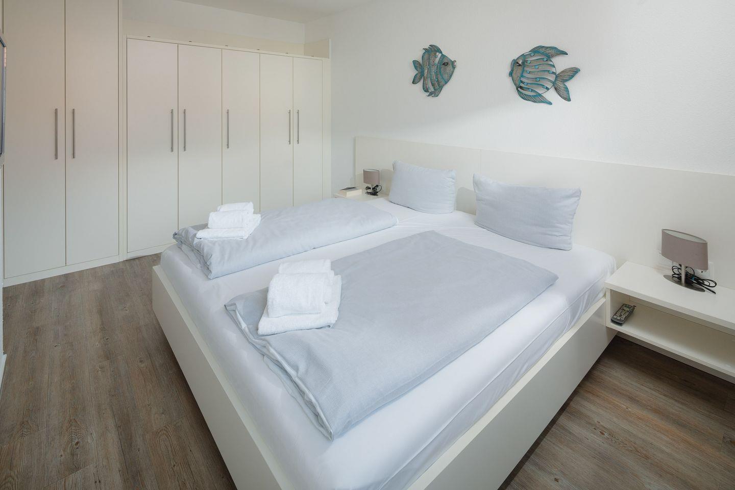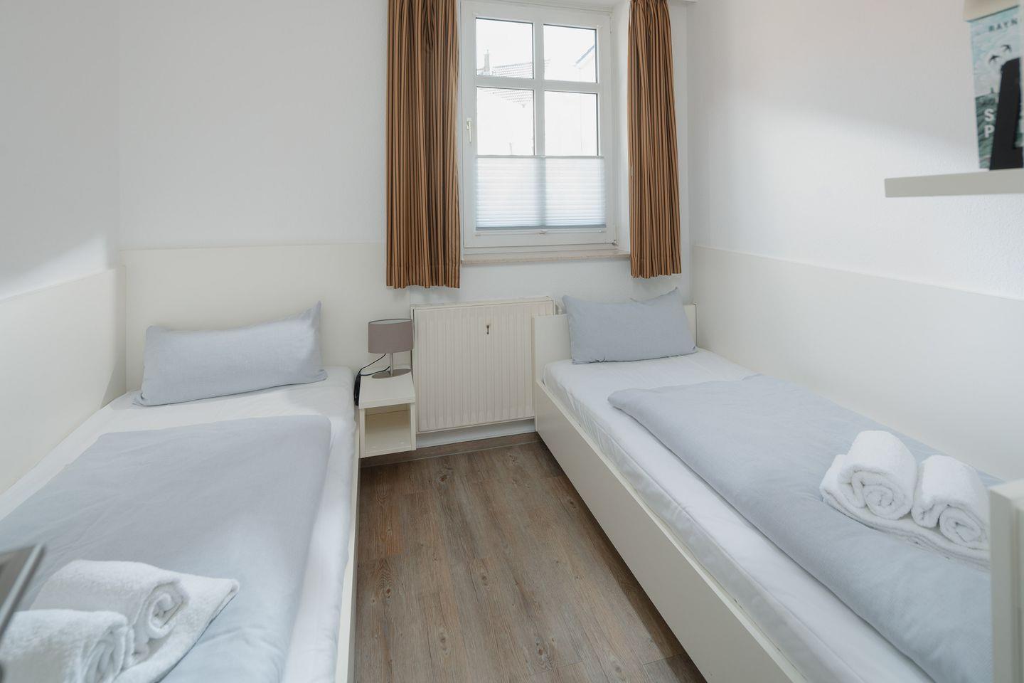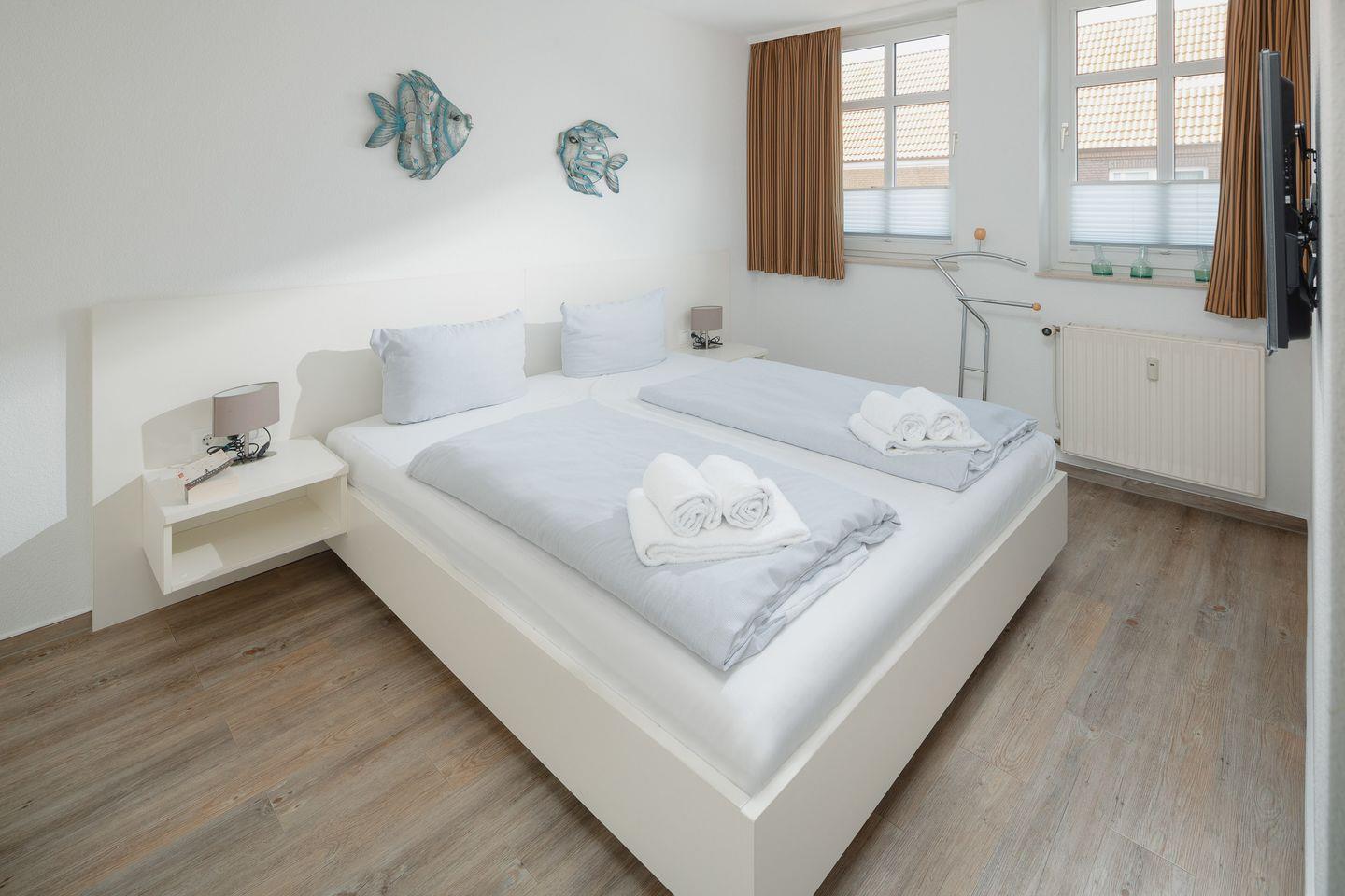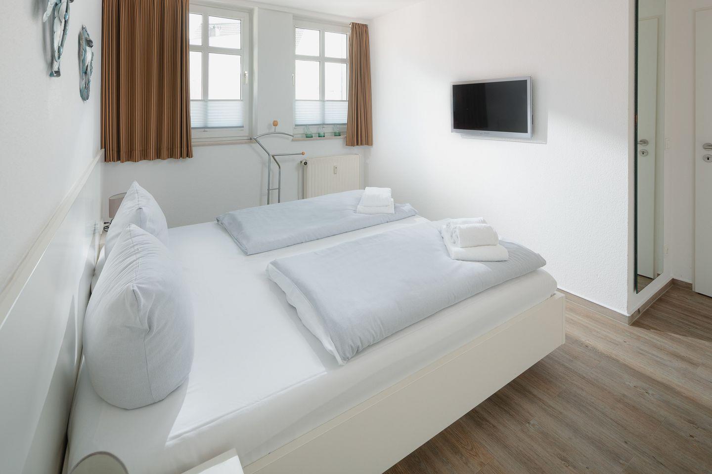 das moderne Appartement im 1. OG verfügt über zwei separate Schlafzimmer. Eines mit Doppelbett (zusätzliches TV) und eines mit zwei Einzelbetten. Über den Wohnraum mit Küchenzeile, Essecke und gemütlicher Sofaecke haben Sie Zugang zum großen Süd-Westbalkon. Das Badezimmer hat eine Dusche und WC.