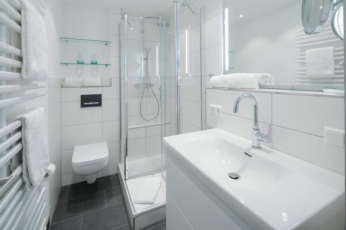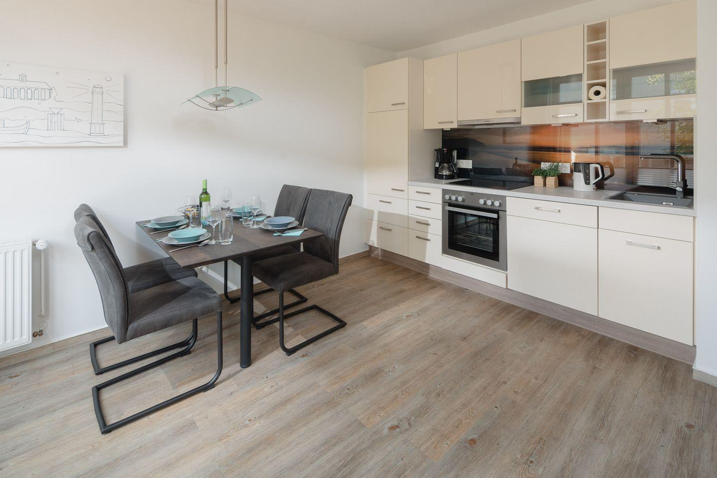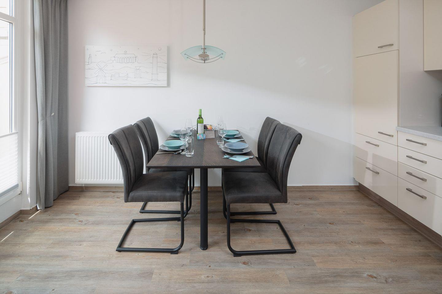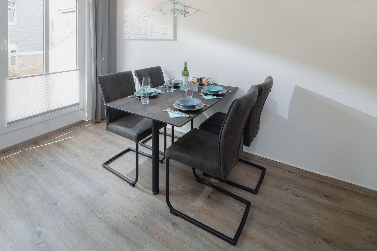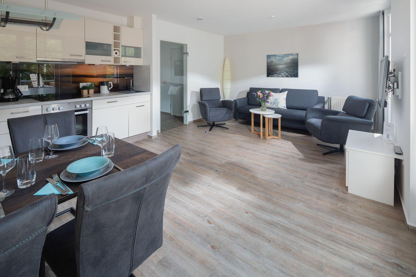 das moderne Appartement im 1. OG verfügt über zwei separate Schlafzimmer. Eines mit Doppelbett (zusätzliches TV) und eines mit zwei Einzelbetten. Über den Wohnraum mit Küchenzeile, Essecke und gemütlicher Sofaecke haben Sie Zugang zum großen Süd-Westbalkon. Das Badezimmer hat eine Dusche und WC.