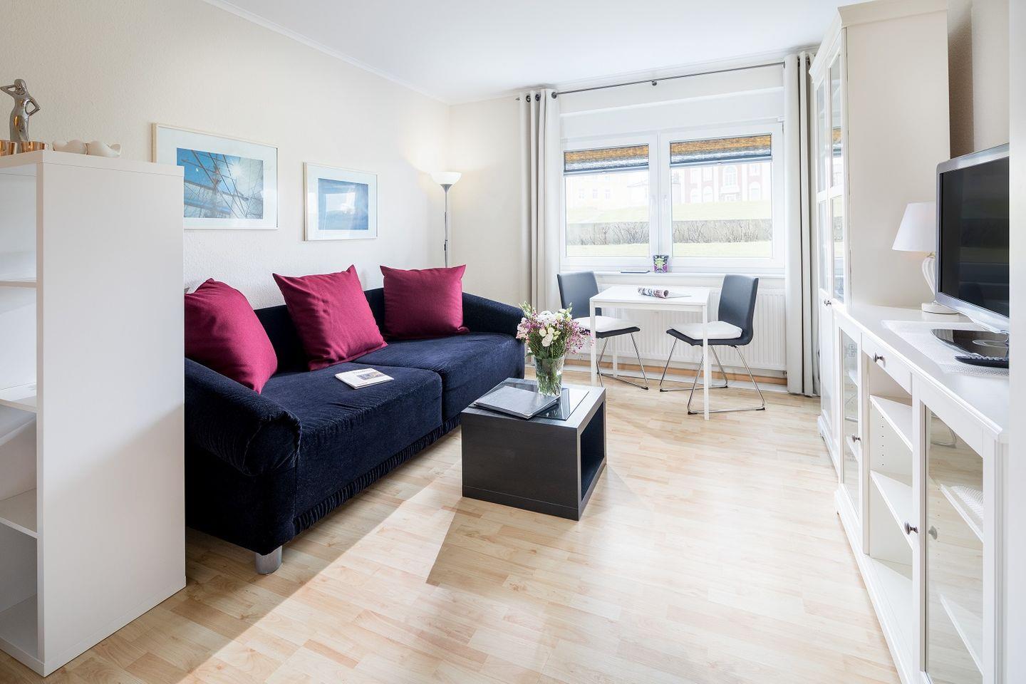 der Wohnbereich mit Sofa und Essecke am Fenster ist durch einen Raumteiler vom Schlafbereich getrennt. Die Küchenzeile befindet sich in der Diele. Badezimmer mit Dusche/WC. Das Appartement liegt zur Viktoriastraße. Durch die Erdgeschosslage richtet sich der Ausblick auf den Deichweg und einen Teil der Villa Contessa. Bäcker, Lebensmittelgeschäfte und die Strandpromenade sind um die Ecke auf der Strandstraße fußläufig leicht zu erreichen.