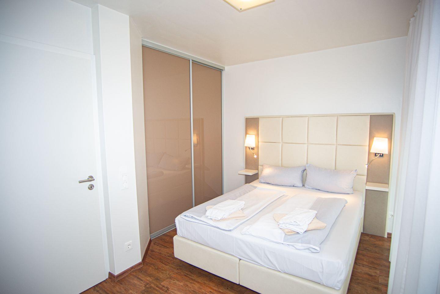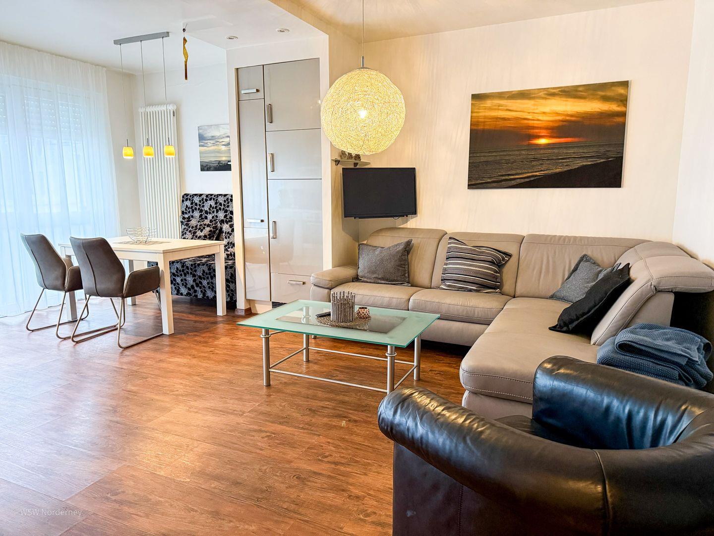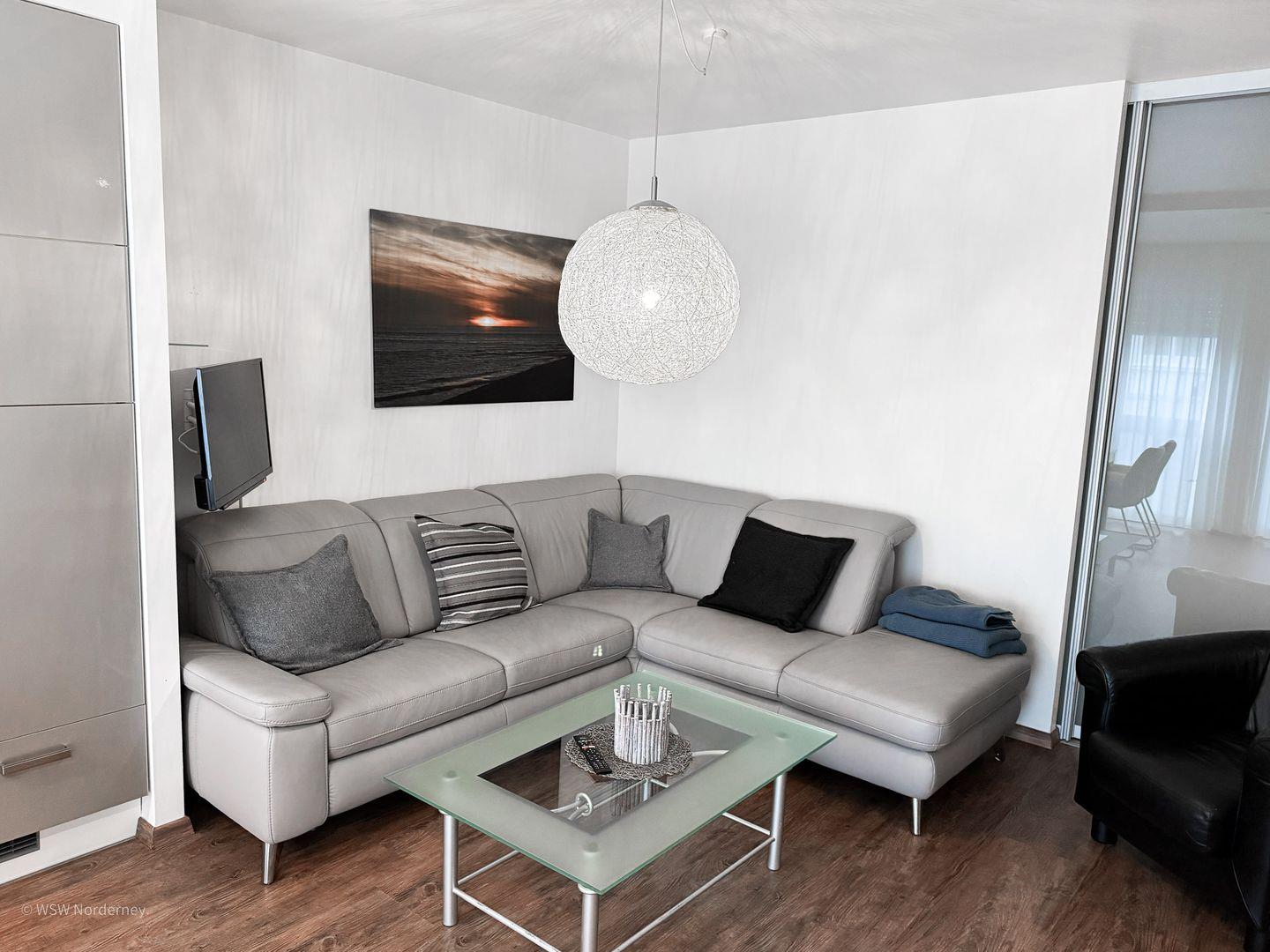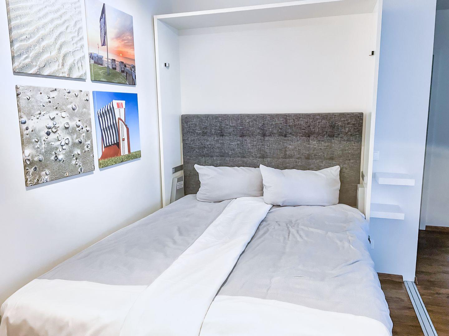 neben einem geräumigen Schlafzimmer mit Doppelbett und TV punktet die Wohnung mit einer zusätzlichen Schlafnische mit modernem Doppelschrankbett ( Breite: 1,60m ), das sich abends leicht mit einem Griff über das Sofa klappen lässt. Die Nische ist bei Bedarf durch eine Milchglas-Schiebetür vom Wohnzimmer abzutrennen. Im großzügigen Wohnraum mit vollausgestatteter Küchenzeile finden sowohl eine Sofalandschaft als auch eine Essecke vor der Fensterfront Platz. Das Badezimmer hat Dusche/WC.