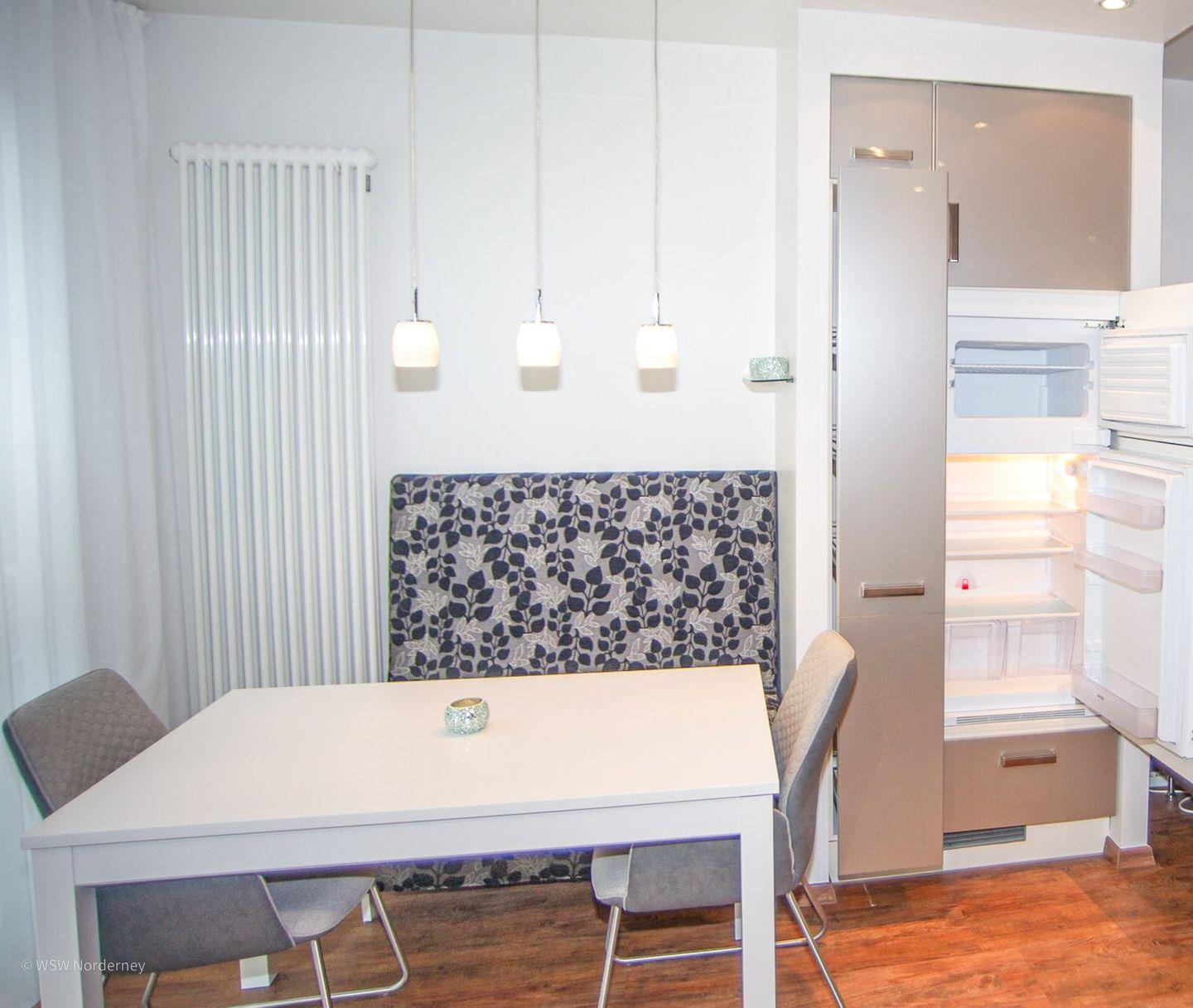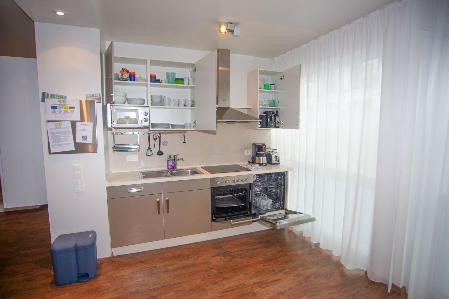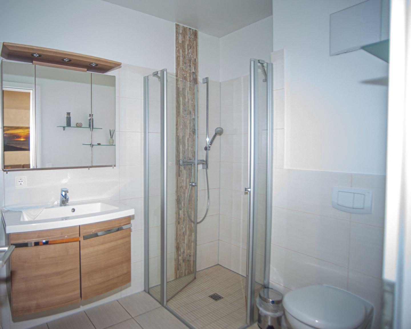 neben einem geräumigen Schlafzimmer mit Doppelbett und TV punktet die Wohnung mit einer zusätzlichen Schlafnische mit modernem Doppelschrankbett ( Breite: 1,60m ), das sich abends leicht mit einem Griff über das Sofa klappen lässt. Die Nische ist bei Bedarf durch eine Milchglas-Schiebetür vom Wohnzimmer abzutrennen. Im großzügigen Wohnraum mit vollausgestatteter Küchenzeile finden sowohl eine Sofalandschaft als auch eine Essecke vor der Fensterfront Platz. Das Badezimmer hat Dusche/WC.