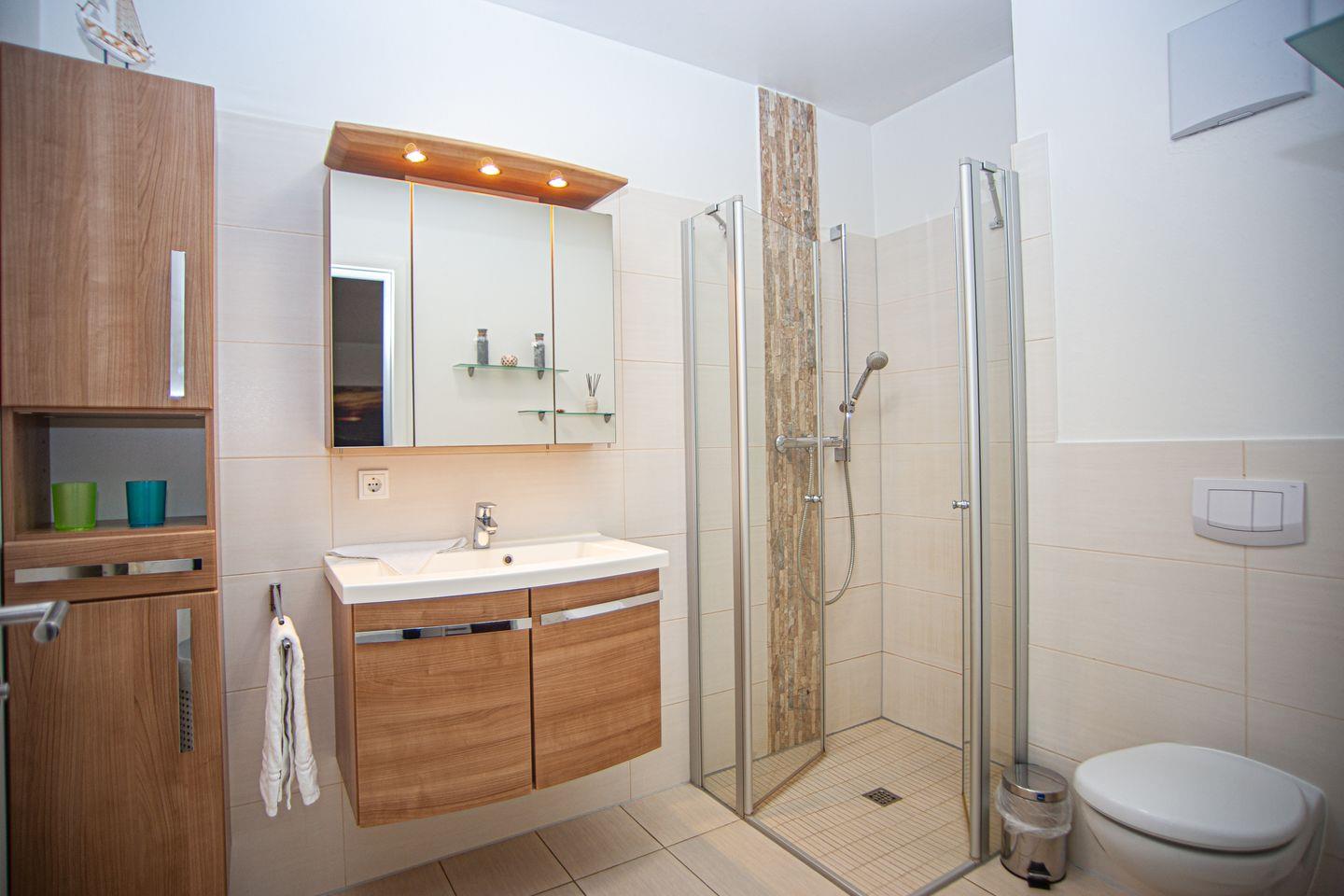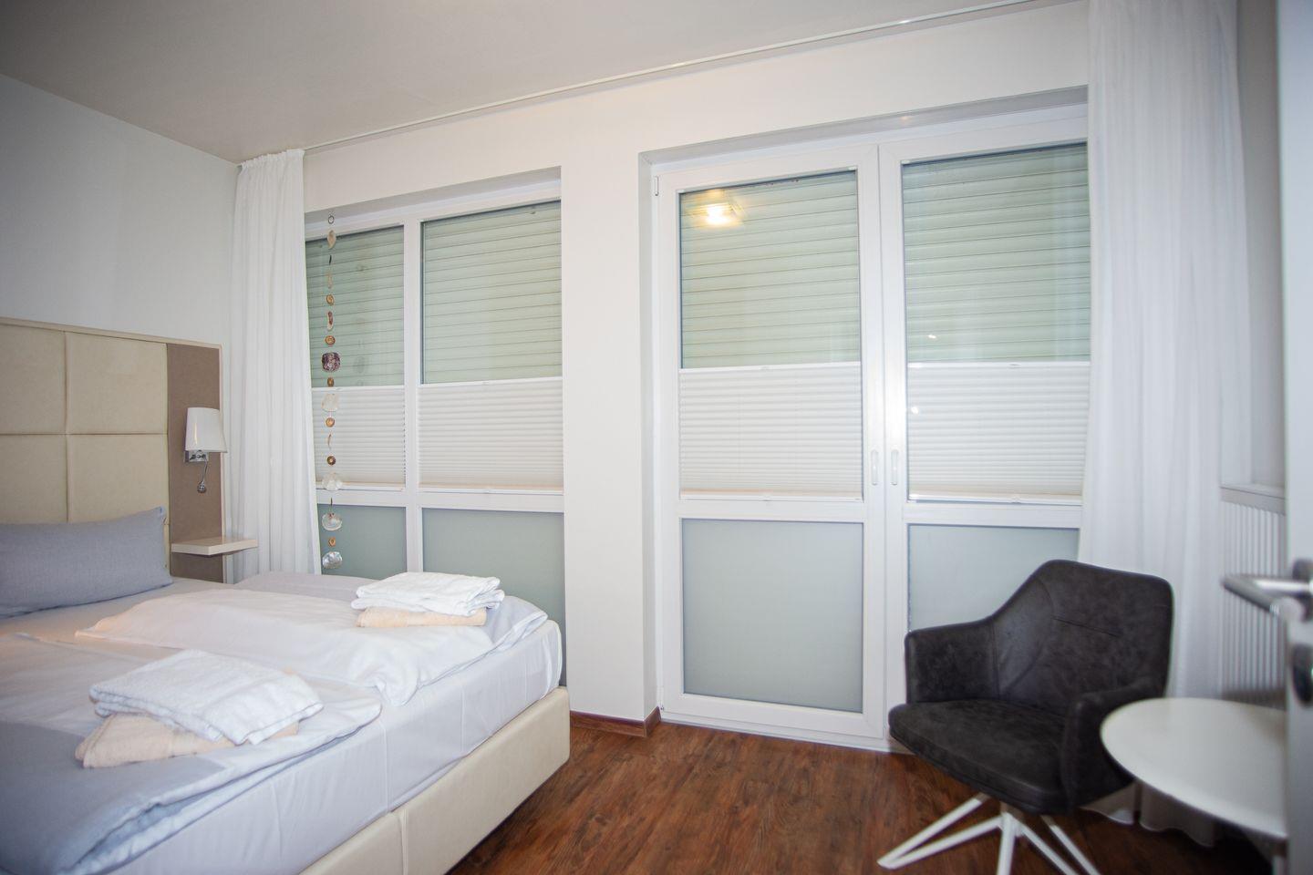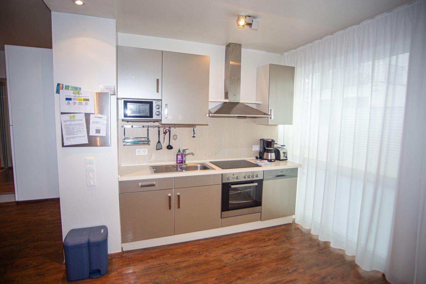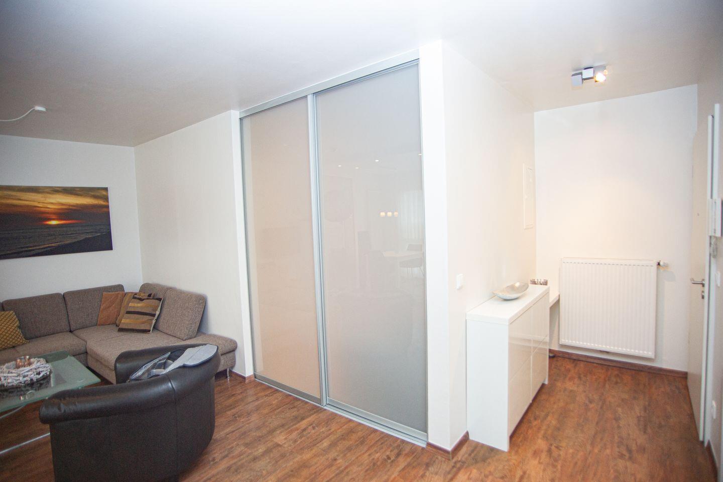 neben einem geräumigen Schlafzimmer mit Doppelbett und TV punktet die Wohnung mit einer zusätzlichen Schlafnische mit modernem Doppelschrankbett ( Breite: 1,60m ), das sich abends leicht mit einem Griff über das Sofa klappen lässt. Die Nische ist bei Bedarf durch eine Milchglas-Schiebetür vom Wohnzimmer abzutrennen. Im großzügigen Wohnraum mit vollausgestatteter Küchenzeile finden sowohl eine Sofalandschaft als auch eine Essecke vor der Fensterfront Platz. Das Badezimmer hat Dusche/WC.
