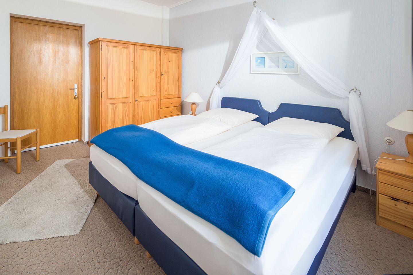 die zweckmäßig eingerichtete Ferienwohnung verfügt über zwei separate Schlafzimmer (eines mit Ehebett, eines mit zwei hintereinanderstehenden Einzelbetten) sowie Bad mit Dusche/WC. Der Wohnbereich mit Essecke bietet Platz für 4 Personen. In einer kleinen Nische im Wohnzimmer befindet sich die Küchenzeile.