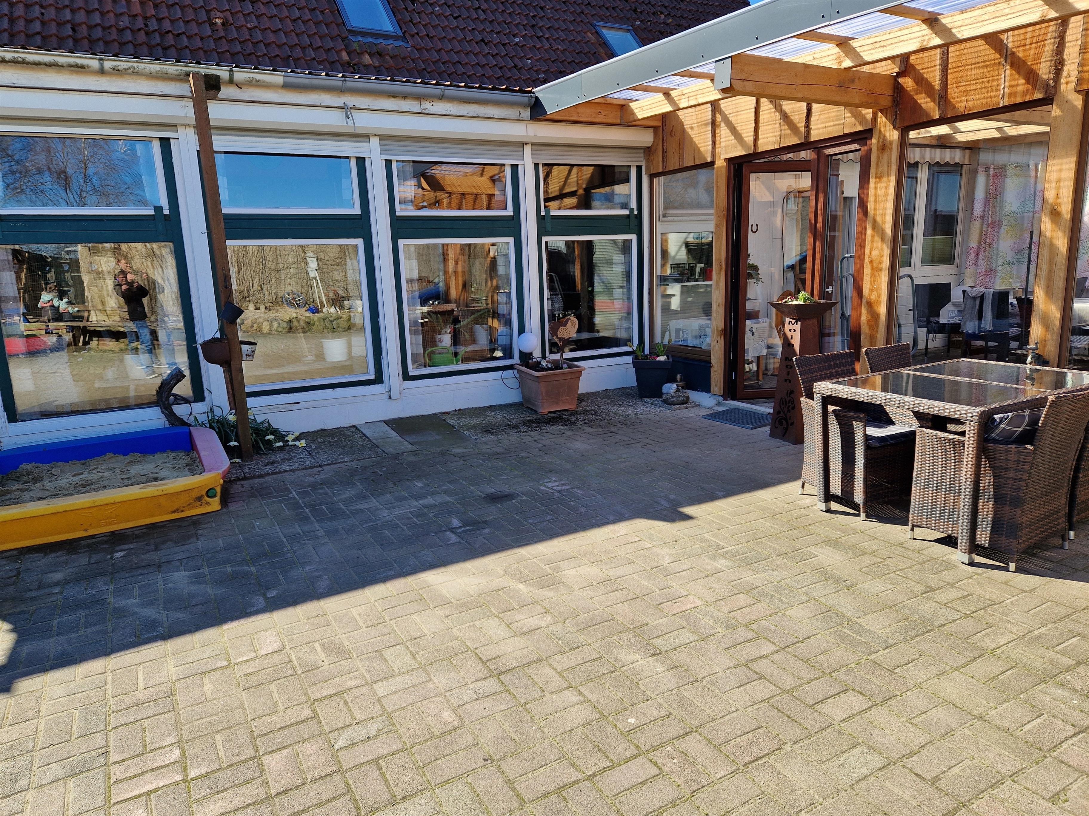 Vom rustikalen Wintergarten( der durch eine Jalousie zur Wohnung getrennt ist) geht aus geht es nach draußen. Dort lädt die überdachte Terrasse mit Tisch und Stühlen, Strandkorb und Grill, zum Verweilen ein. Sandkiste mit Spielzeug und einige Fahrzeuge stehen für die kleinen Gäste bereit