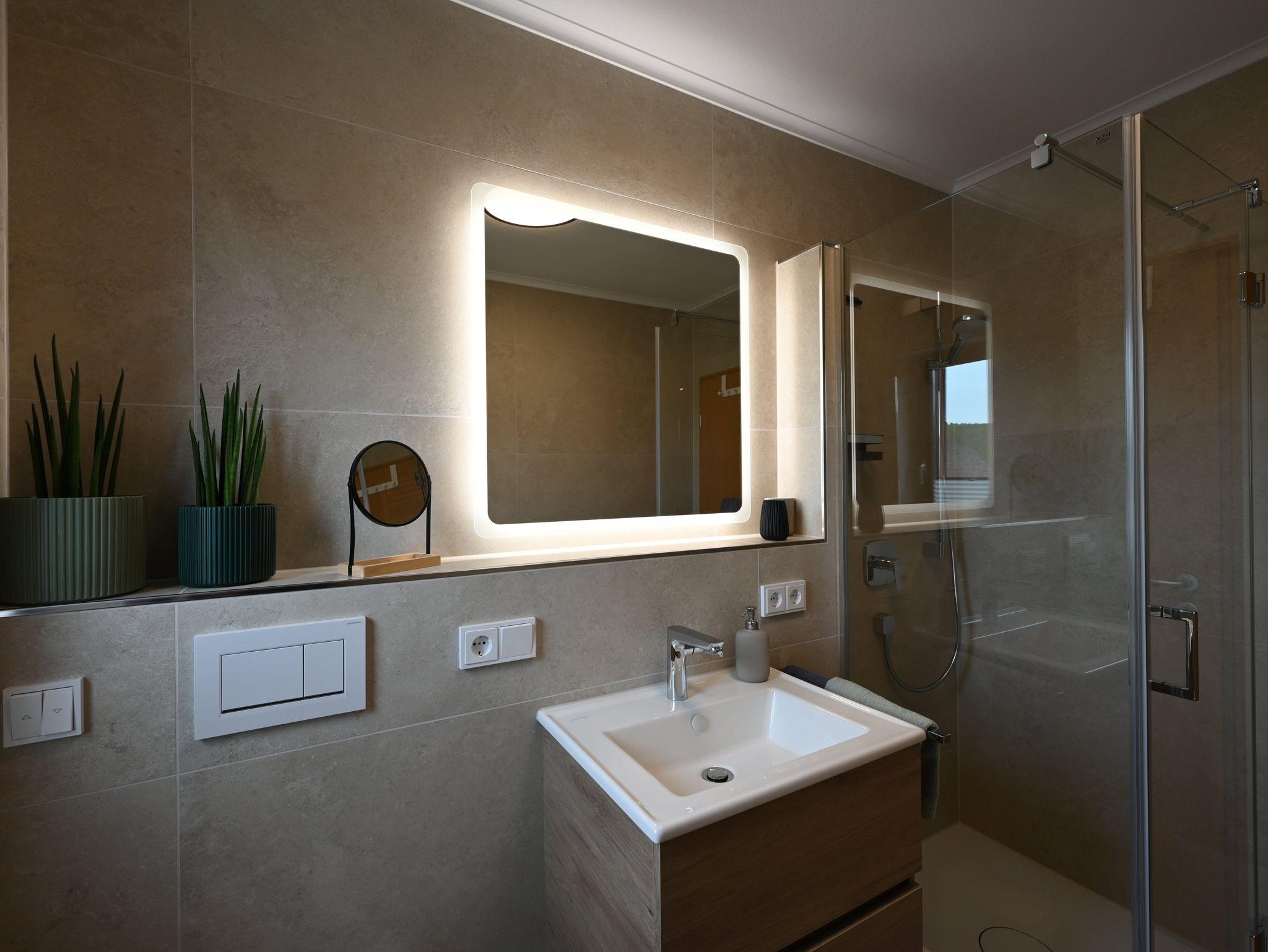 Geräumiges 1-Zimmer-Appartment (ca. 45 qm) mit Ku¨che. Helles Bad mit Dusche, WC und Fön. Schlafcouch im Wohnbereich Sowie TV.