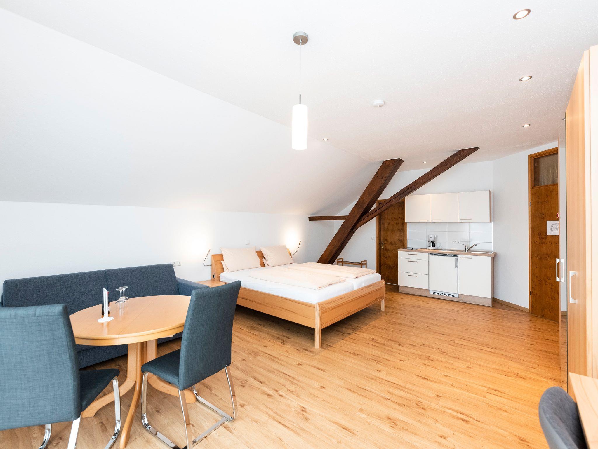 Unsere Apartments sind Doppelzimmer mit einer Wohn- und Schlafkombination. Daneben beinhaltet jedes Apartment eine Küchenzeile. Eine Schlafcouch ermöglicht auch die Unterbringung von bis zu 3 Personen. Auch diese Zimmer sind alle mit Dusche/WC ausgestattet.