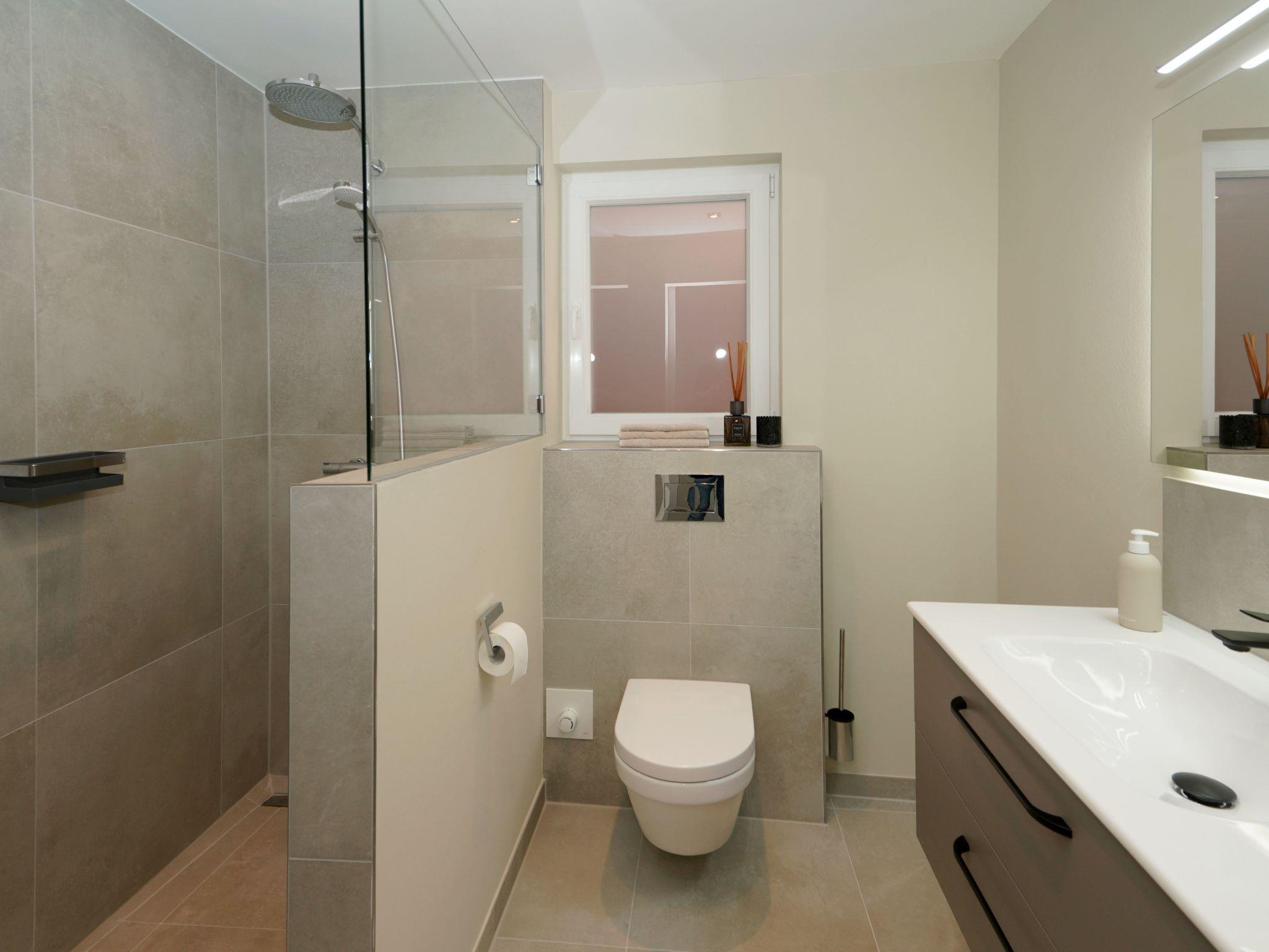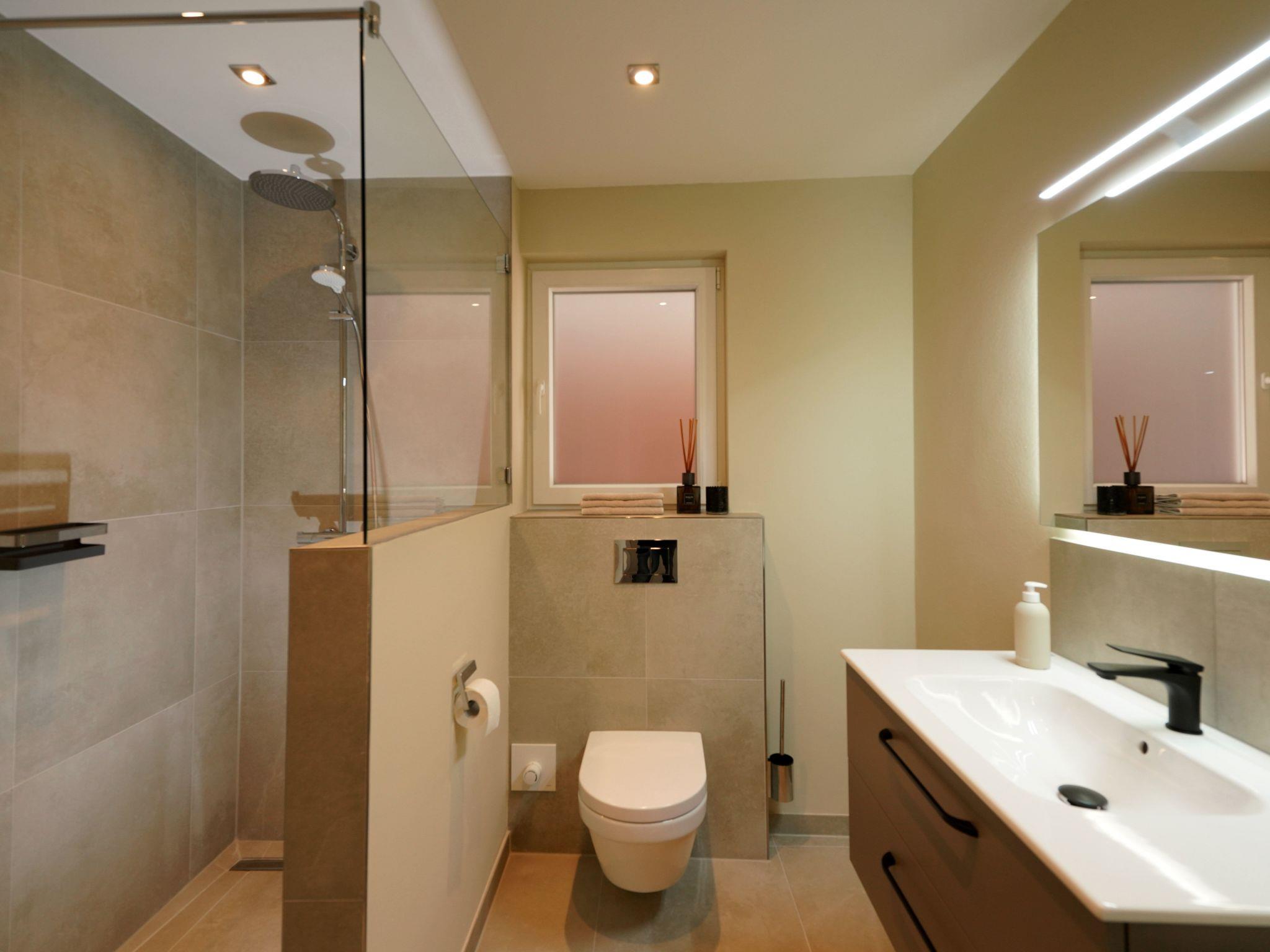 The bathroom with open walk-in shower is equipped with an integrated rain shower, toilet, beautiful washing facilities and of course a hairdryer and towels.