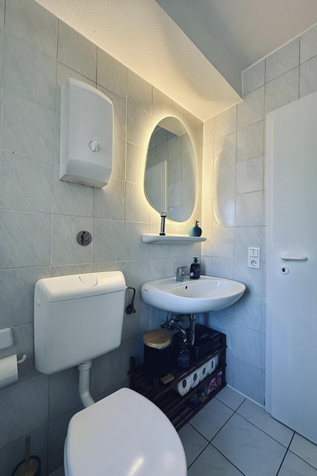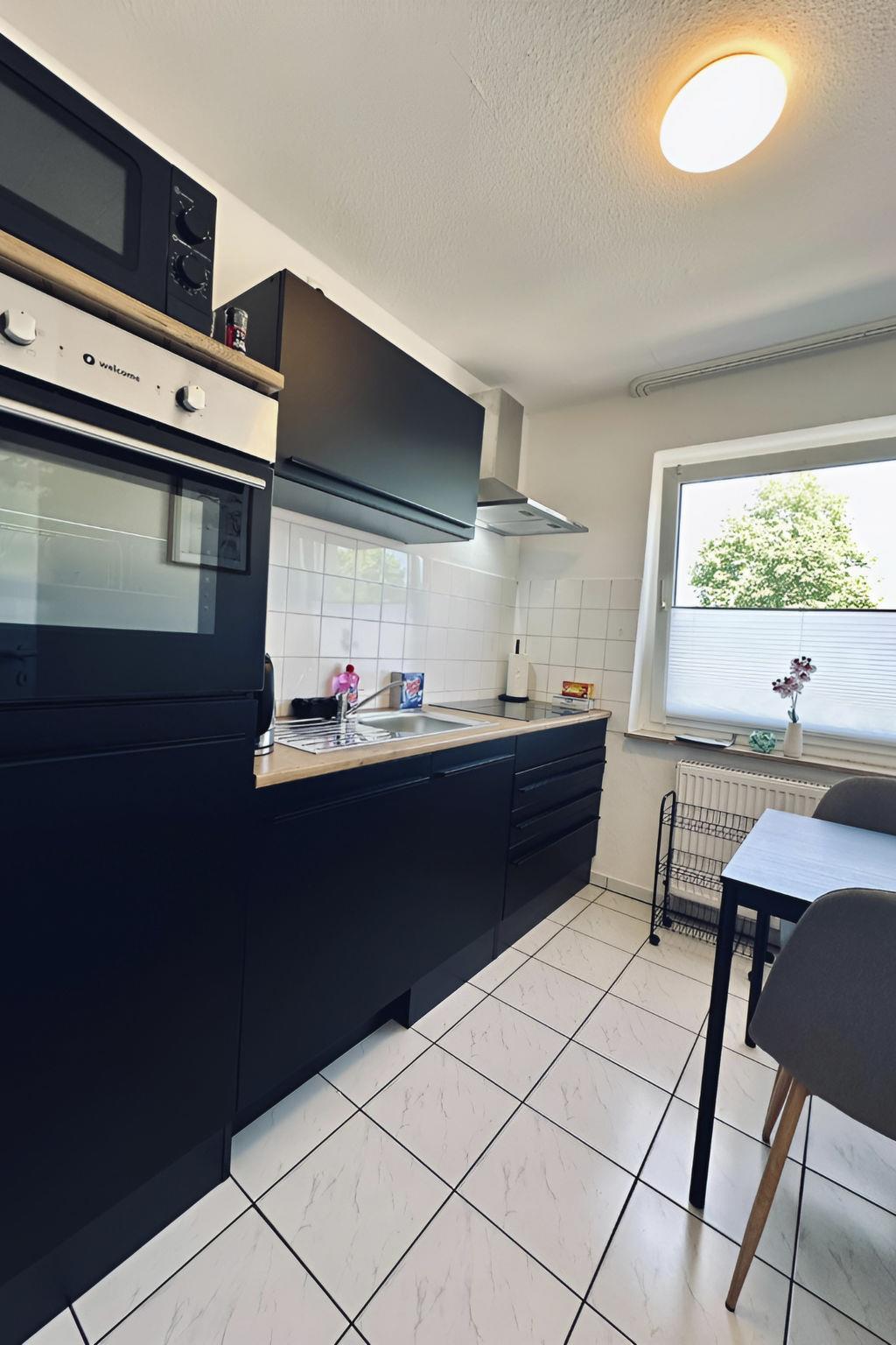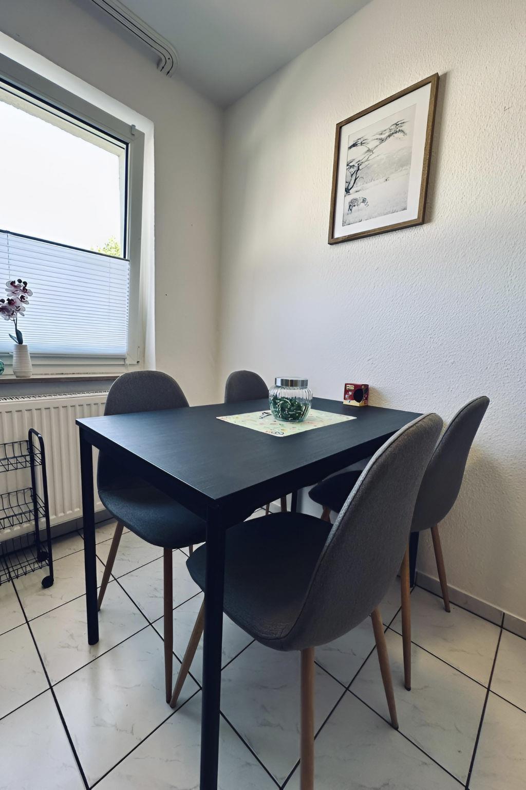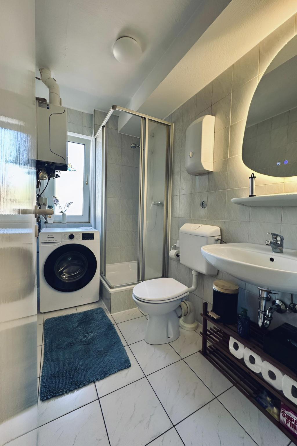 Inside, the flat impresses with its bright and elegant furnishings. It includes a cosy kitchen with dining area that invites you to linger, as well as a modern kitchen equipped with everything your heart desires, including a kettle for relaxed coffee moments. The bathroom is equipped with a practical shower. Furthermore, amenities such as a washing machine and tumble dryer, both for communal use in the building, as well as a fan provide additional comfort during your stay.