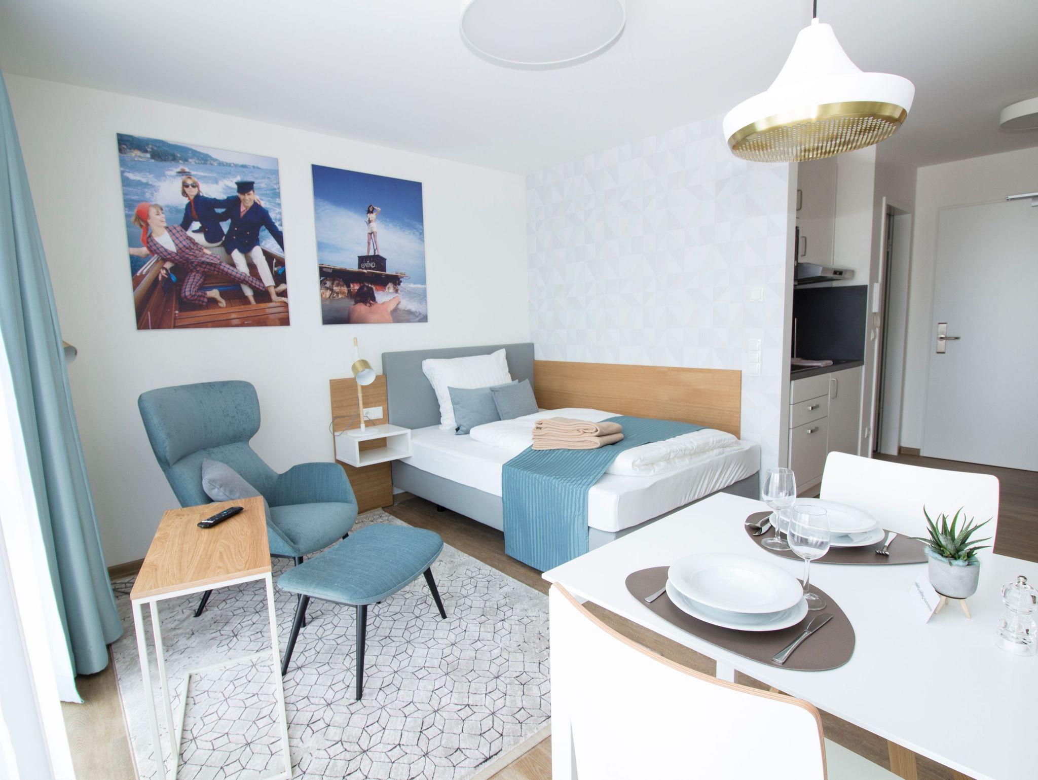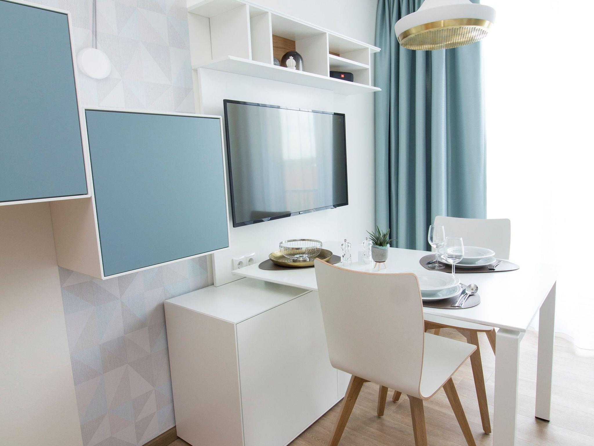 Der Tisch im Essbereich mit 2 Stühlen ist multifunktional und kann durch seine technische Ausstattung auch als Schreibtisch genutzt werden. Ganz selbstverständlich verfügen die Apartments über einen kostenfreien Internetanschluss, einen internetfähigen Smart-TV und ein Bluetooth-Radio.