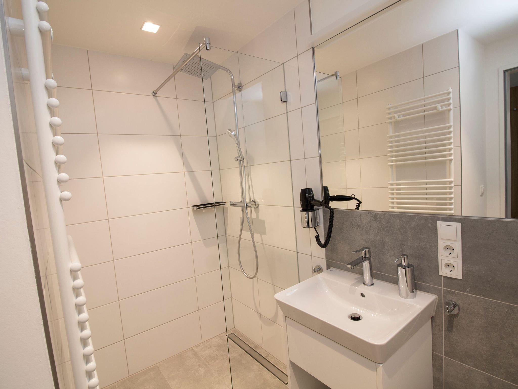 Dieses funktionale, elegante Design wird im Badezimmer durch eine bodengleiche Dusche fortgesetzt. Waschtischunterschrank, Spiegel, Föhn und Seifenspender gehören ebenfalls zur Standardeinrichtung.