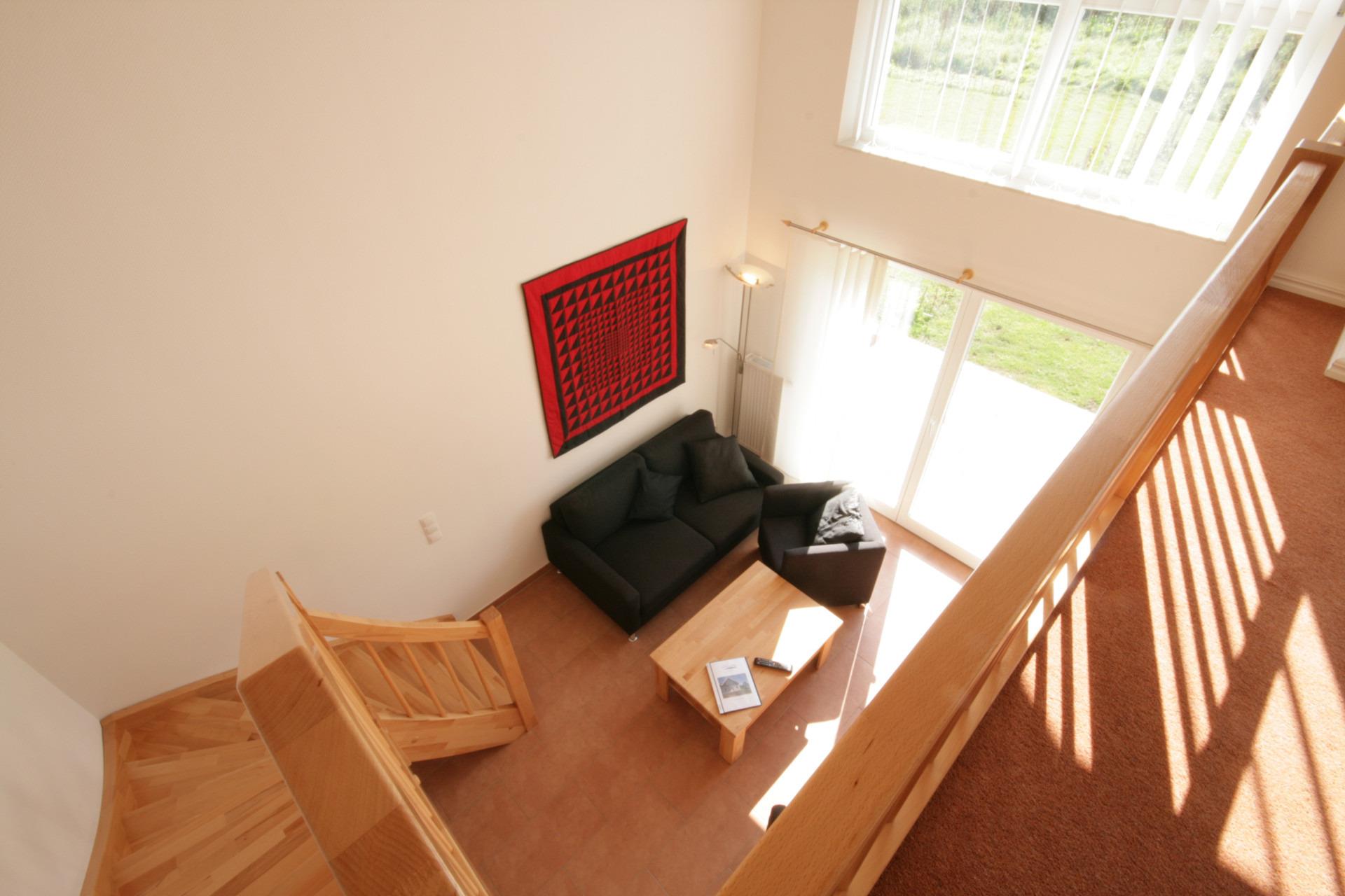 Erdgeschoss: Wohnbereich mit Sitzecke, Kaminofen, Fernseher, Stereo-Anlage