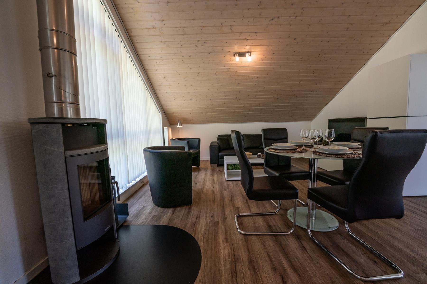 Lassen sie den Abend romantisch vor dem Kaminofen im Wohnzimmer ausklingen und genießen Sie den herrlichen Ausblick aus dem Wohnbereich auf den idyllisch gelegenen Kanal.