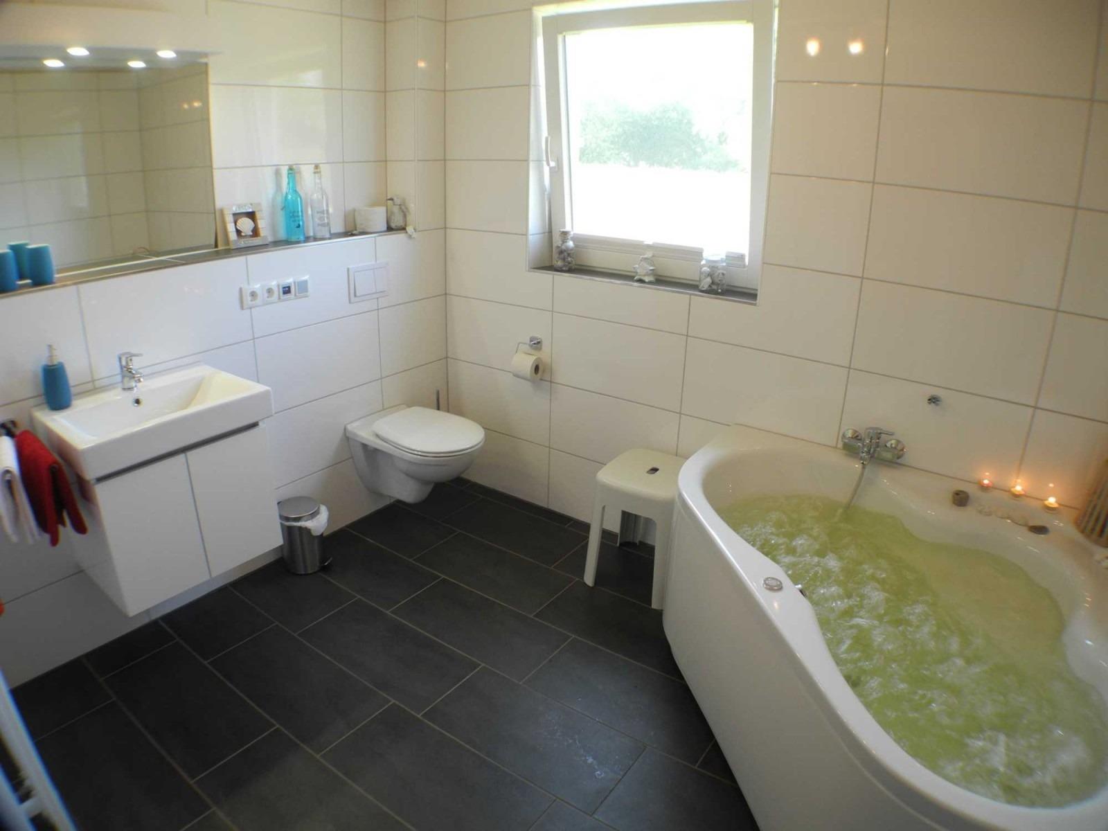 Das Wellnessbad verwöhnt Sie mit einer bodentiefen Dusche, Sauna und Whirlpool. Hier können Sie einmal so richtig die Seele baumeln lassen.