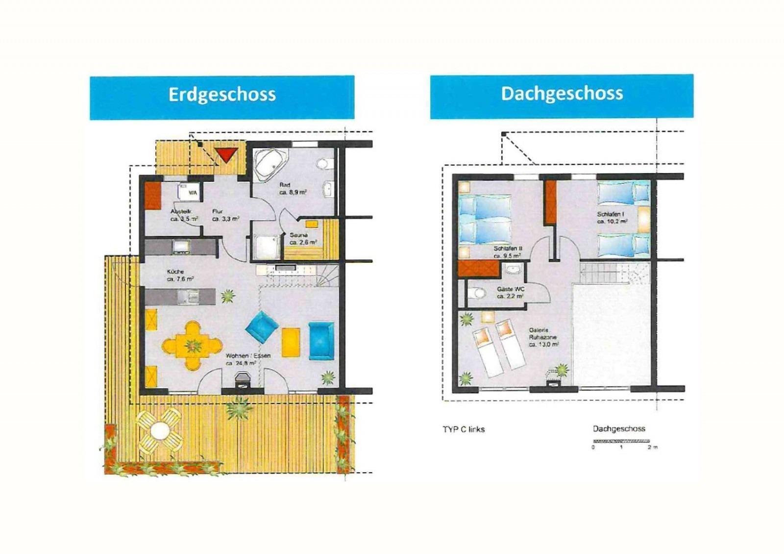Im Obergeschoss befinden sich zwei Schlafzimmer mit jeweils einem Doppelbett, eine Galerie zum Relaxen und ein Gäste-WC.