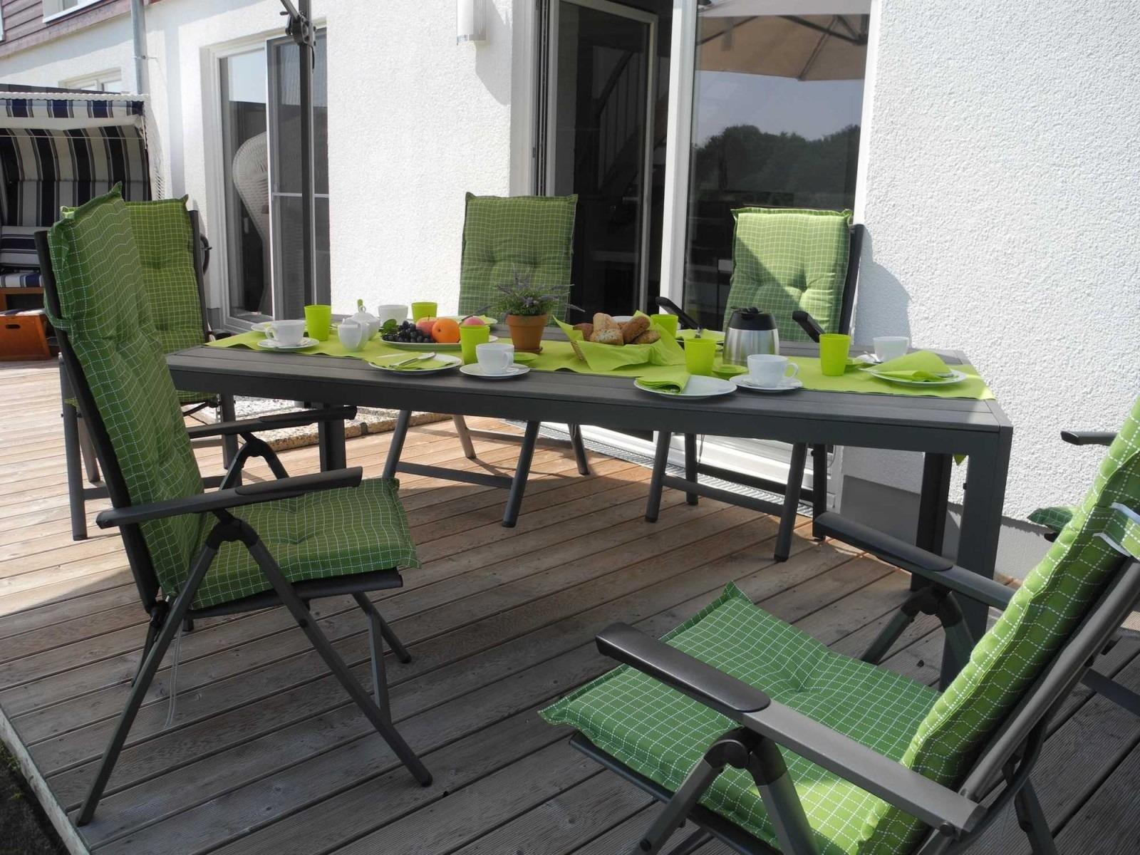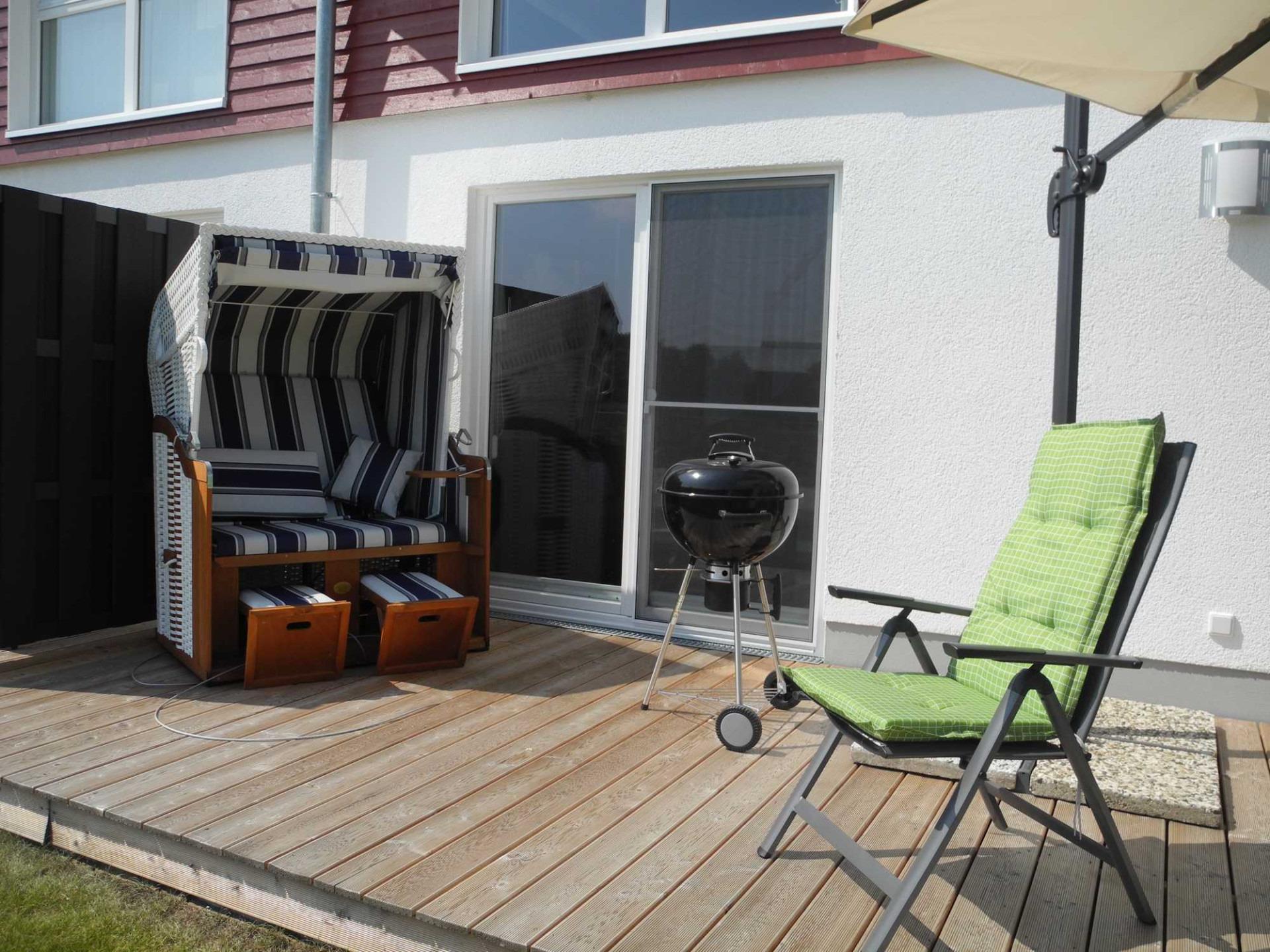 Die Terrasse ist nach Süd-Westen ausgerichtet. Bequeme Terrassenmöbel, ein Sonnenschirm und ein Kugelgrill stehen Ihnen hier zur Verfügung. Selbstverständlich genießen Sie auch von hier den traumhaften Ausblick auf den Seepark und die malerische Natur.