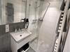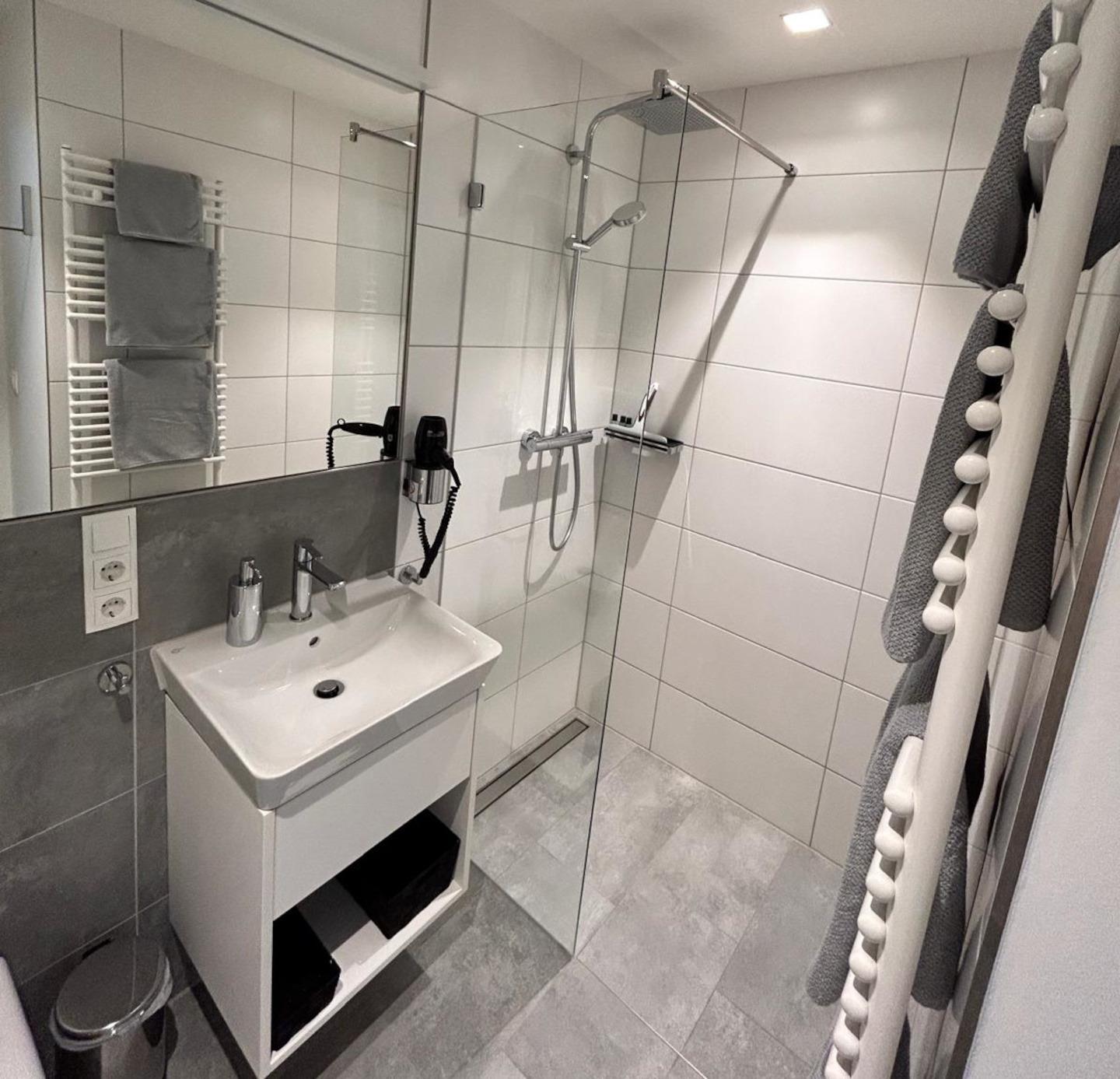 Dieses funktionale, elegante Design wird im Badezimmer durch eine bodengleiche Dusche fortgesetzt. Waschtischunterschrank, Spiegel, Föhn und Seifenspender gehören ebenfalls zur Standardeinrichtung.