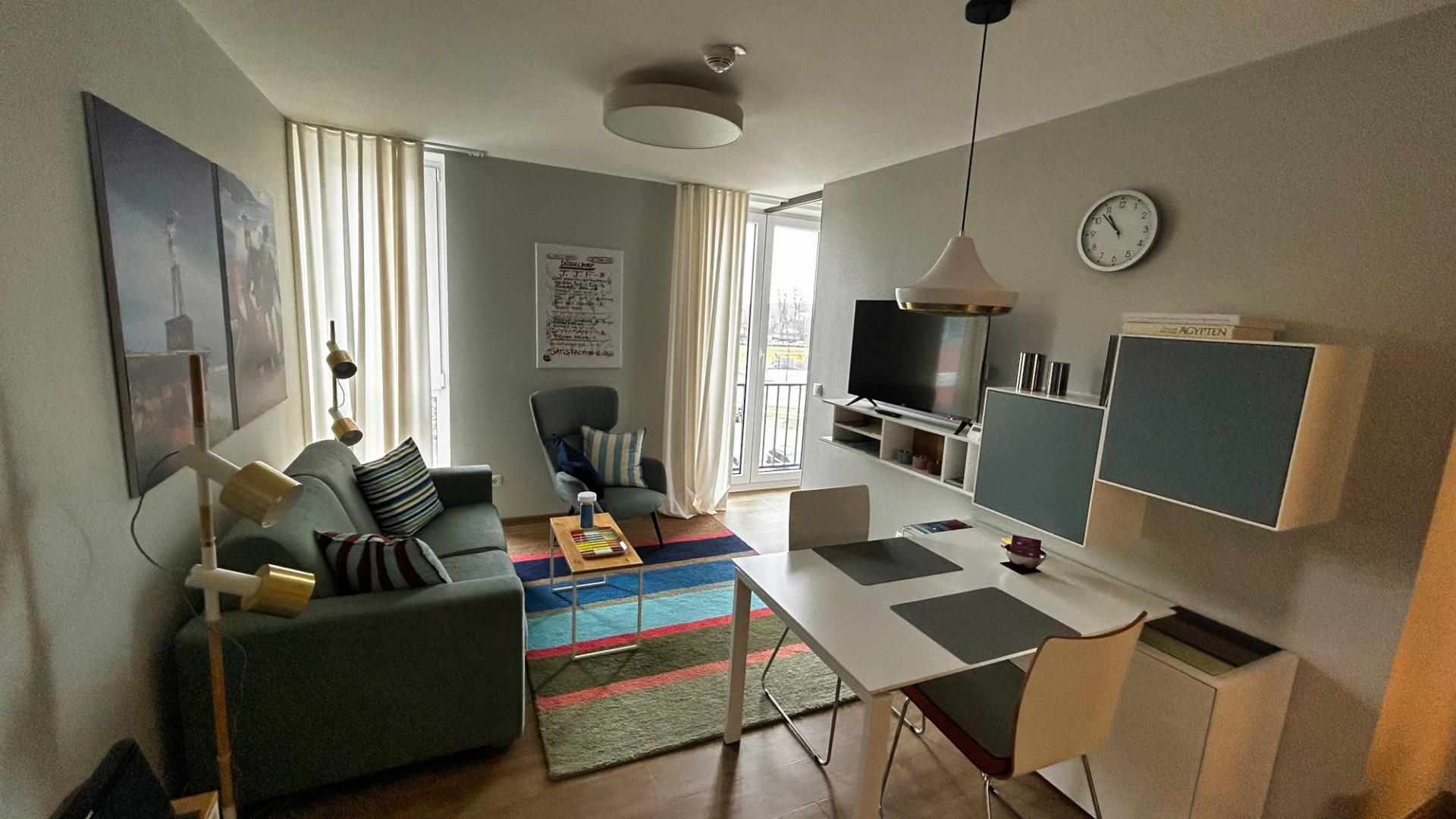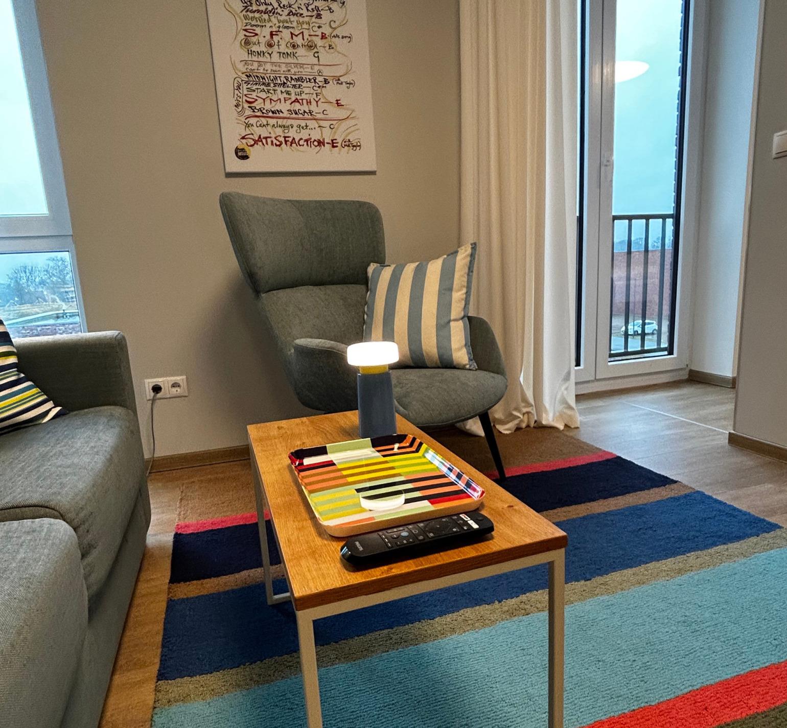 Der Tisch im Essbereich mit 2 Stühlen ist multifunktional und kann durch seine technische Ausstattung auch als Schreibtisch genutzt werden. Ganz selbstverständlich verfügt das Apartment über einen kostenfreien Internetanschluss, einen internetfähigen Smart-TV und ein Bluetooth-Radio.