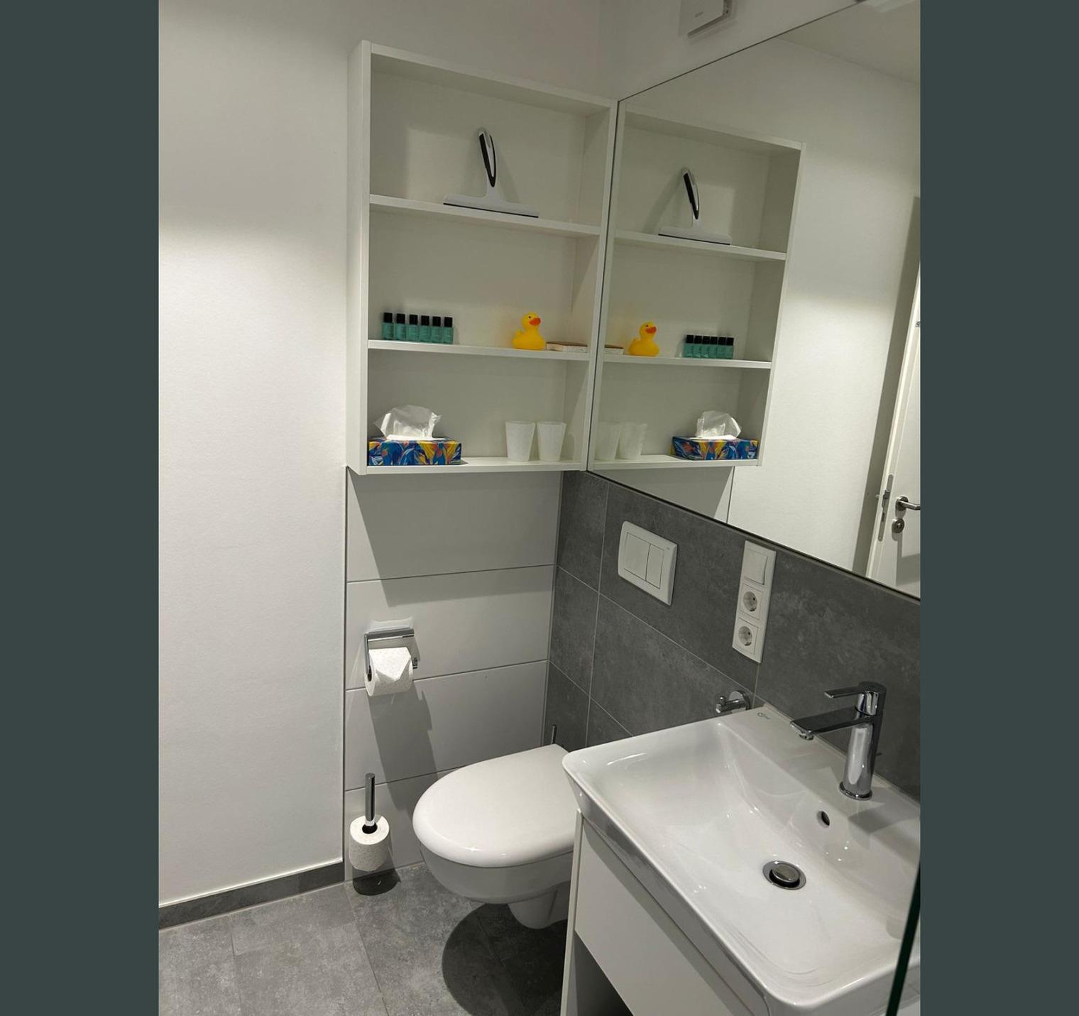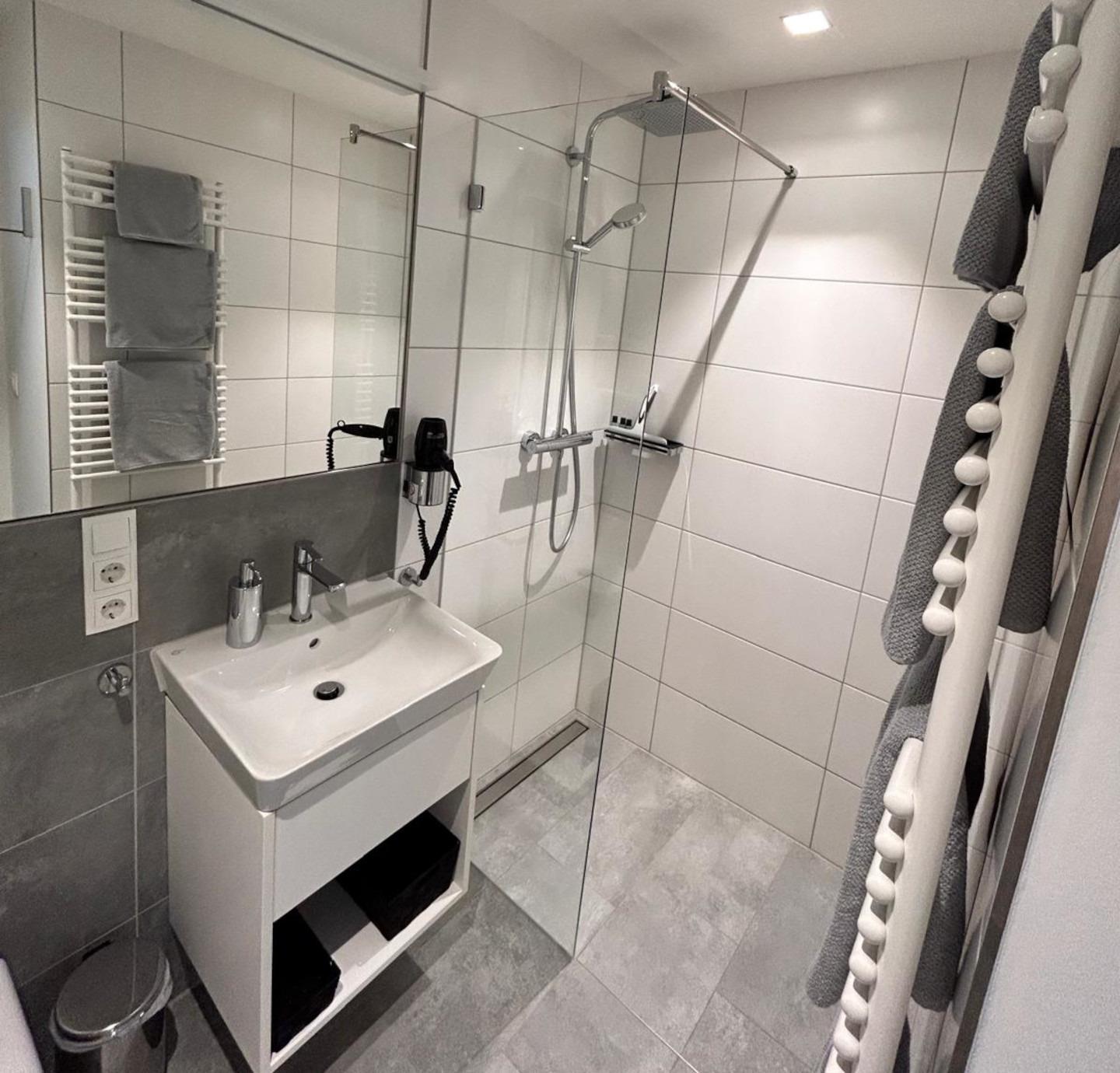 Dieses funktionale, elegante Design wird im Badezimmer durch eine bodengleiche Dusche fortgesetzt. Waschtischunterschrank, Spiegel, Föhn und Seifenspender gehören ebenfalls zur Standardeinrichtung.