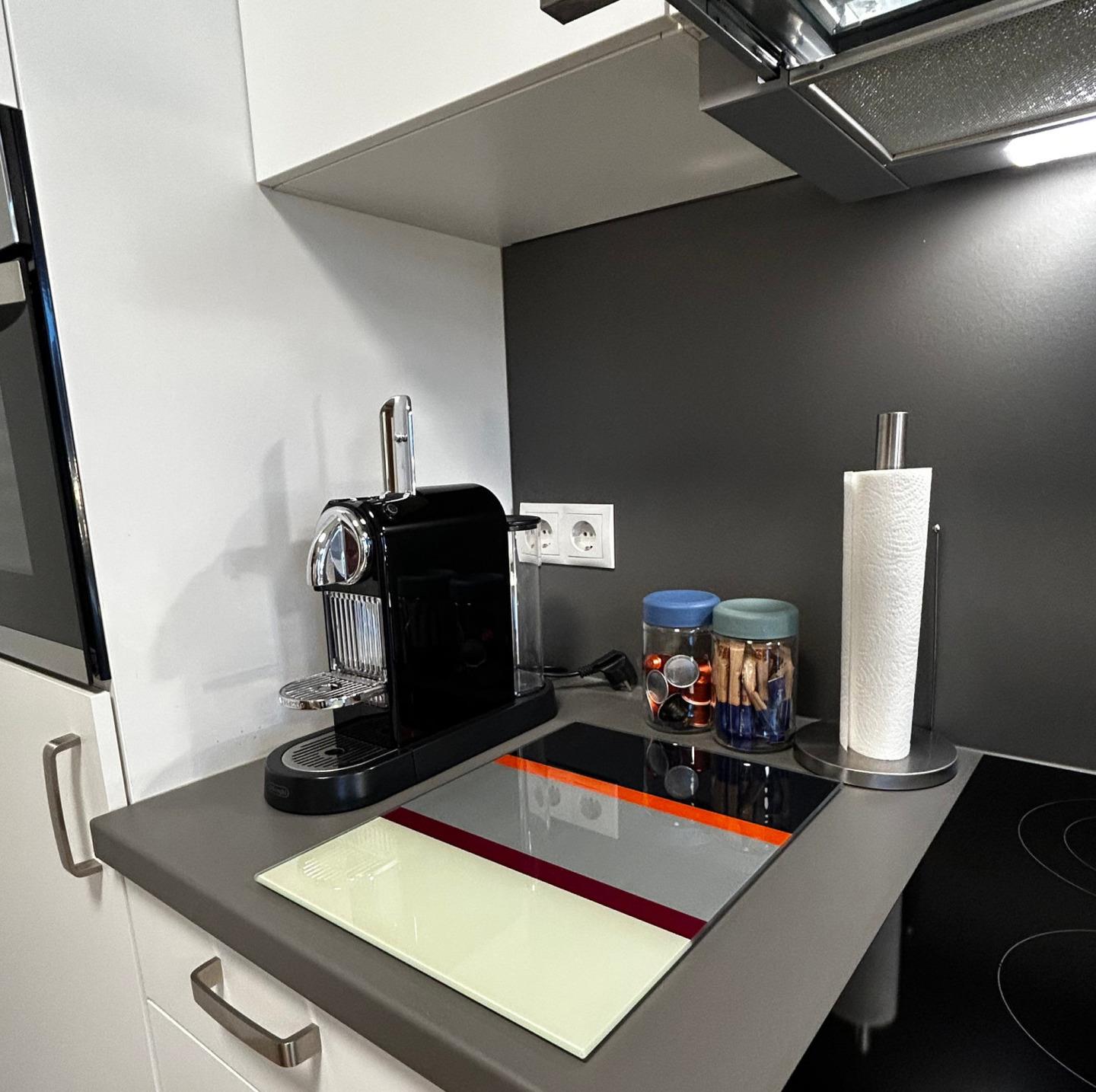 Auf 40 m² verfügt es über eine Pantry-Küche mit Cerankochfeld, Kühlschrank mit Gefrierfach, Spülmaschine, Mikrowelle mit Grill- und Backfunktion, Kaffeemaschine, Mixstab und ausreichend Kochutensilien, um sich vom Frühstück über einen Mittags-Snack bis zum Abendessen selbst versorgen zu können.