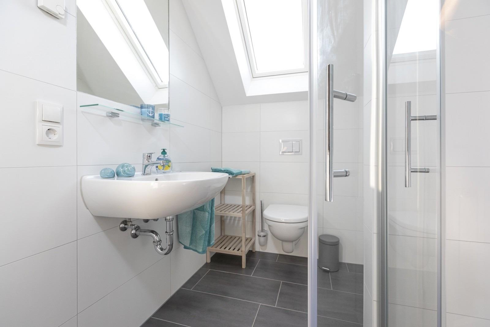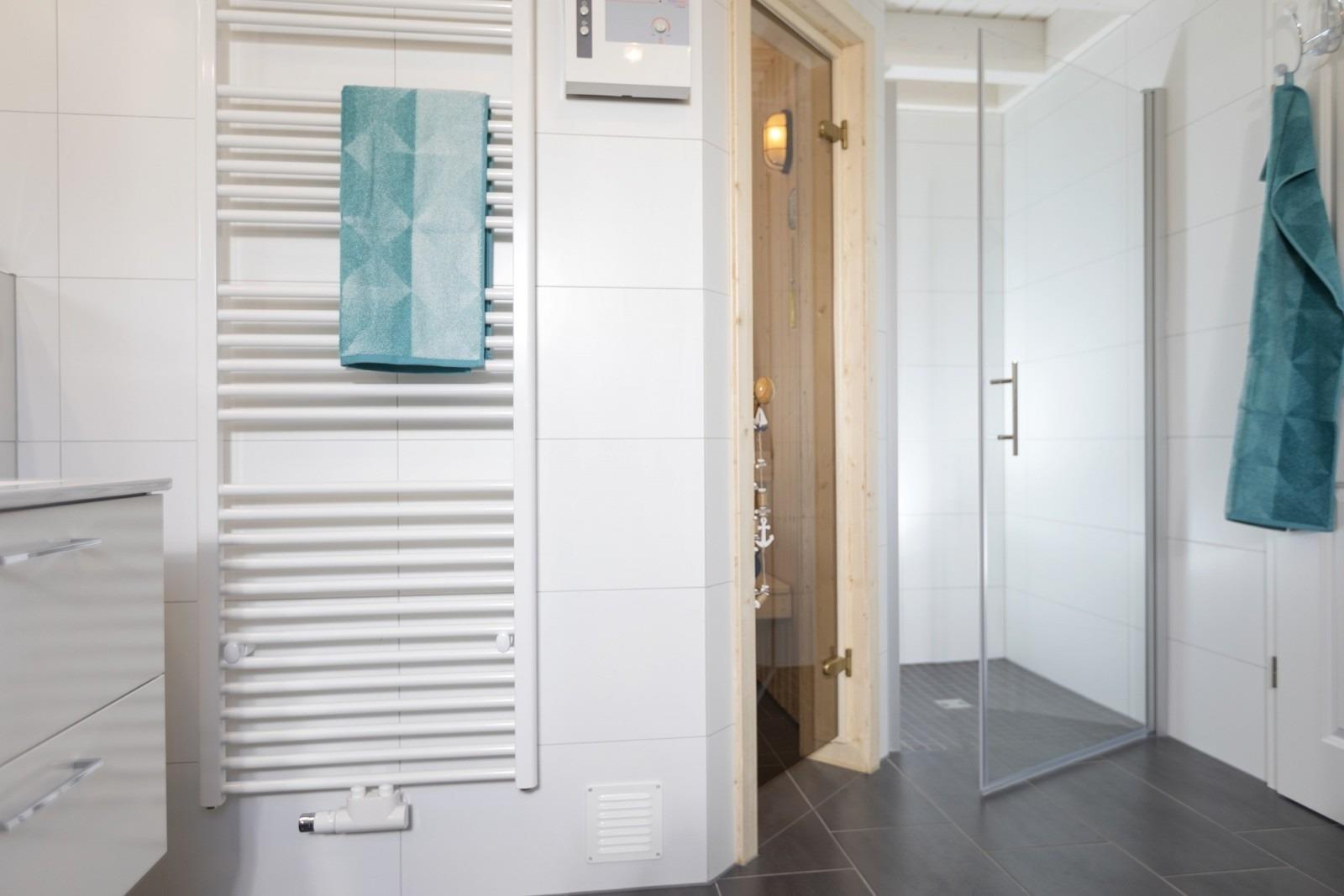 Entspannung finden Sie auch in unserem Wellnessbad mit Sauna und Whirlpool und einer bodengleichen, großzügigen Dusche. Im Haus gibt es ein 2. Badezimmer mit bodengleicher Dusche und WC.