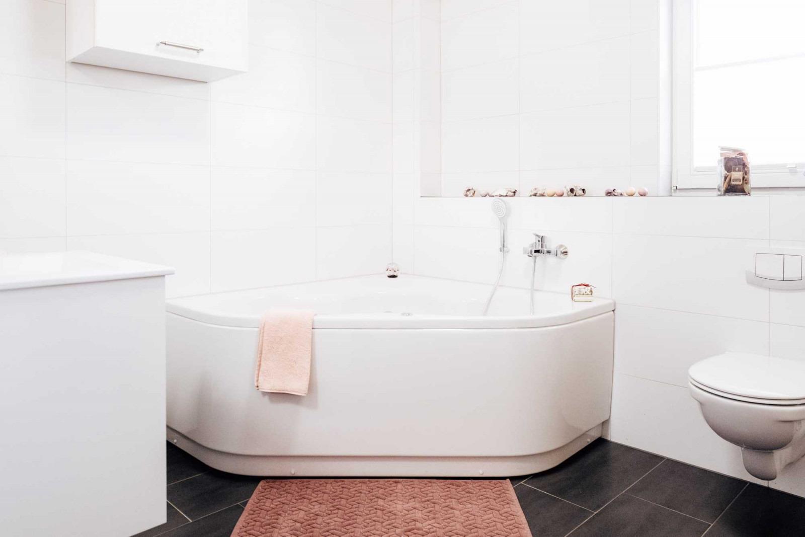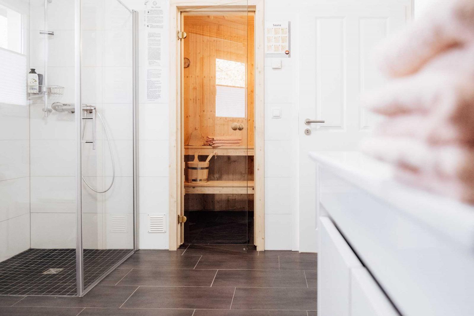 Lassen Sie im Wellnessbad mit Sauna, Whirlpool und bodengleicher Dusche nach einem ereignisreichen Tag die Seele baumeln. Das moderne Badezimmer verspricht Entspannung pur!