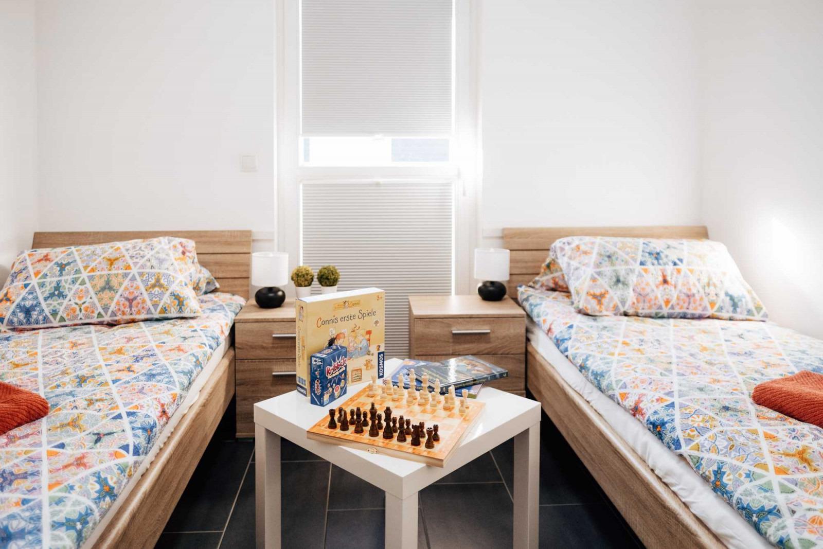 Erholsamen Schlaf finden Sie in den zwei Schlafzimmern, beide verfügen über geräumige Kleiderschränke und zusätzliche Fernseher. Eines der Schlafzimmer ist mit einem Doppelbett mit getrennten Matratzen ausgestattet, das andere Schlafzimmer ist mit zwei Einzelbetten und gemütlicher Spielecke ausgestattet. Ein Babyreisebett und Kinderhochstuhl stehen für die kleinsten Urlaubsgäste zur Verfügung.