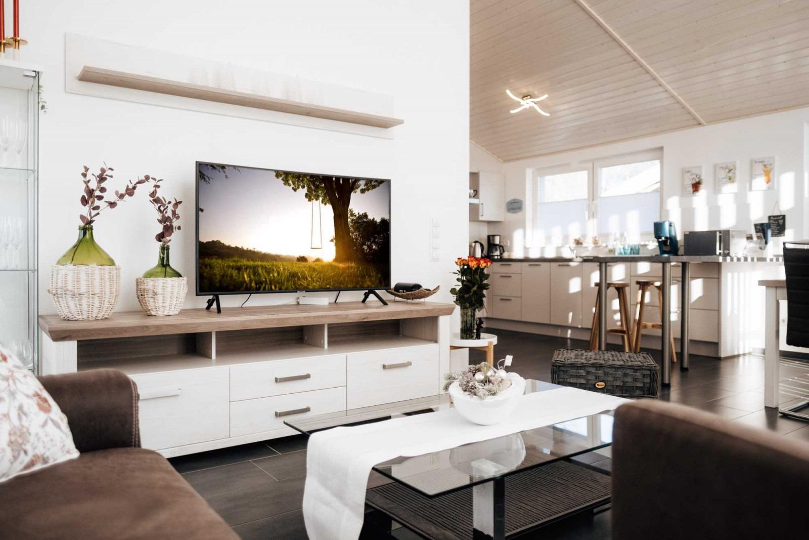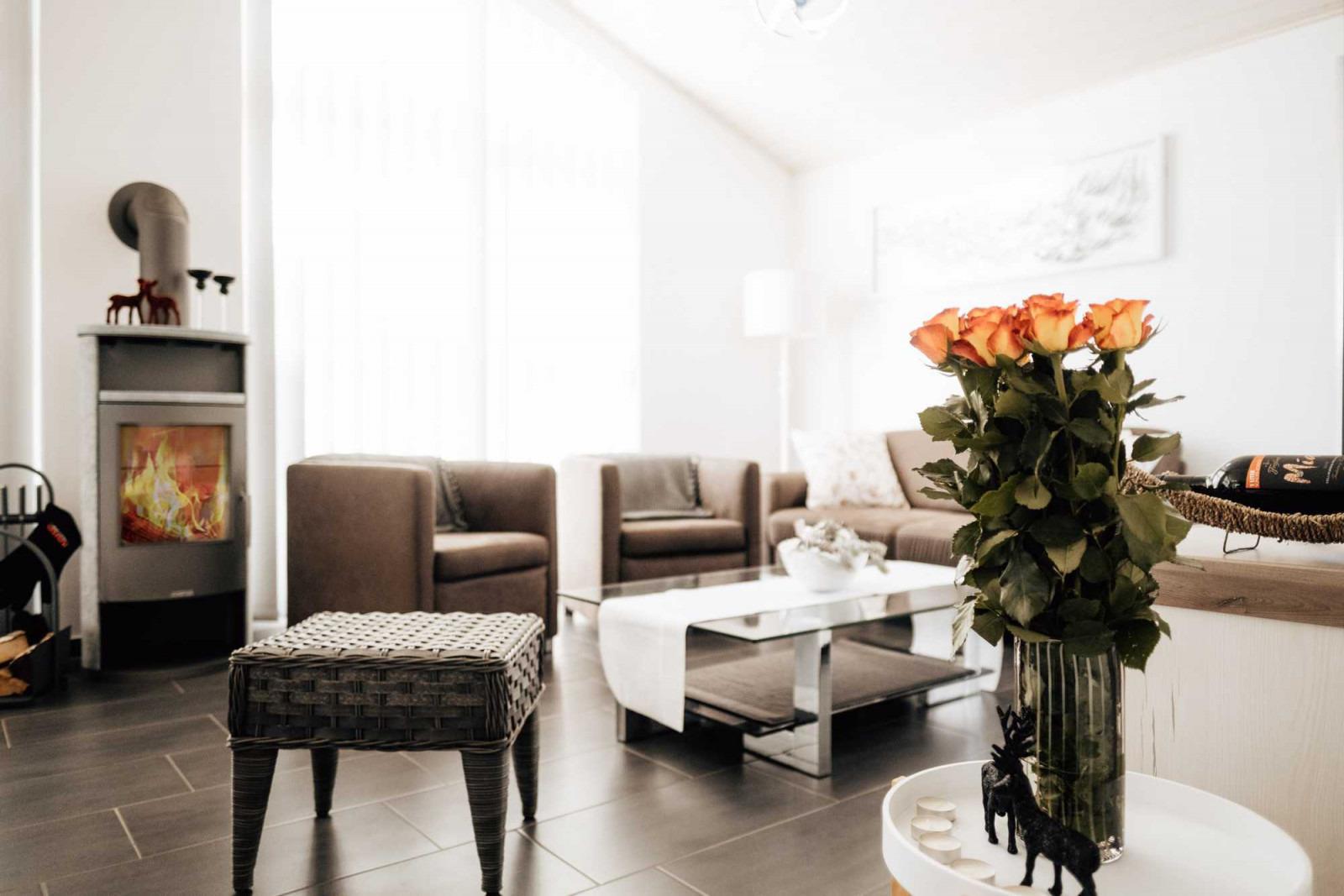 Der großzügige Wohnbereich ist ideal, um nach einem langen Urlaubstag die Abende vor einem prasselnden Kaminfeuer ausklingen zu lassen. Ein Flachbild-TV und kostenfreies WLAN stehen Ihnen selbstverständlich zur Verfügung.