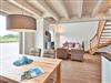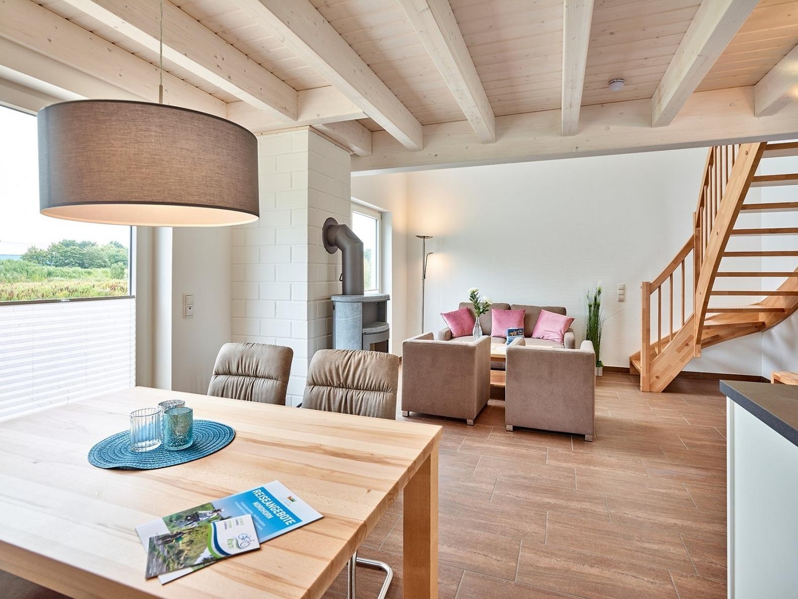 Das Wohnzimmer sorgt mit seinem gemütlichen Sofa und Sesseln, dem Kaminofen sowie Fußbodenheizung für Behaglichkeit. Die offene Küche ist großzügig ausgestatteten mit allen neuzeitlichen Marken-Geräten. Die beiden Schlafzimmer sind mit TV Geräten ausgestattet. Eine weitere Person kann auf der gemütlichen Galerie auf dem Schlafsofa übernachten.