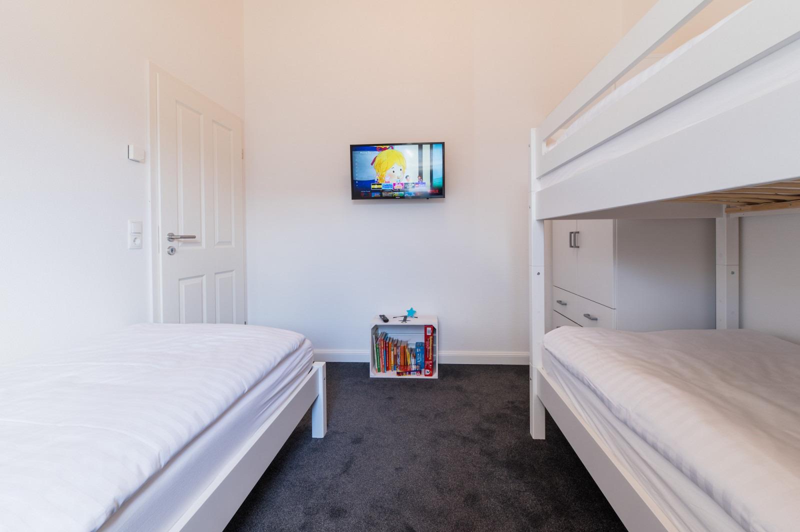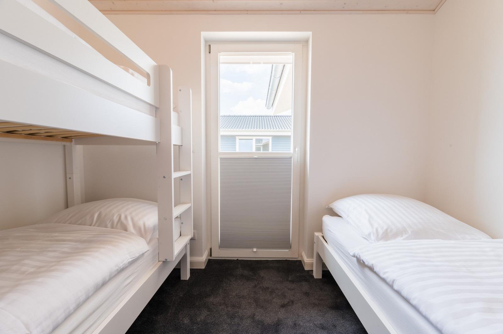 Lassen Sie Ihren Urlaubstag in den beiden gemütlichen Schlafzimmern ausklingen. Das erste Schlafzimmer ist mit einem Doppelbett (180 x 200 cm) ausgestattet. Zudem gibt es hier ein Babyreisebett. Im zweiten Schlafzimmer befindet sich neben dem Etagenbett auch ein Einzelbett (alle 90 x 200 cm) sowie ein zusätzlicher Fernseher.