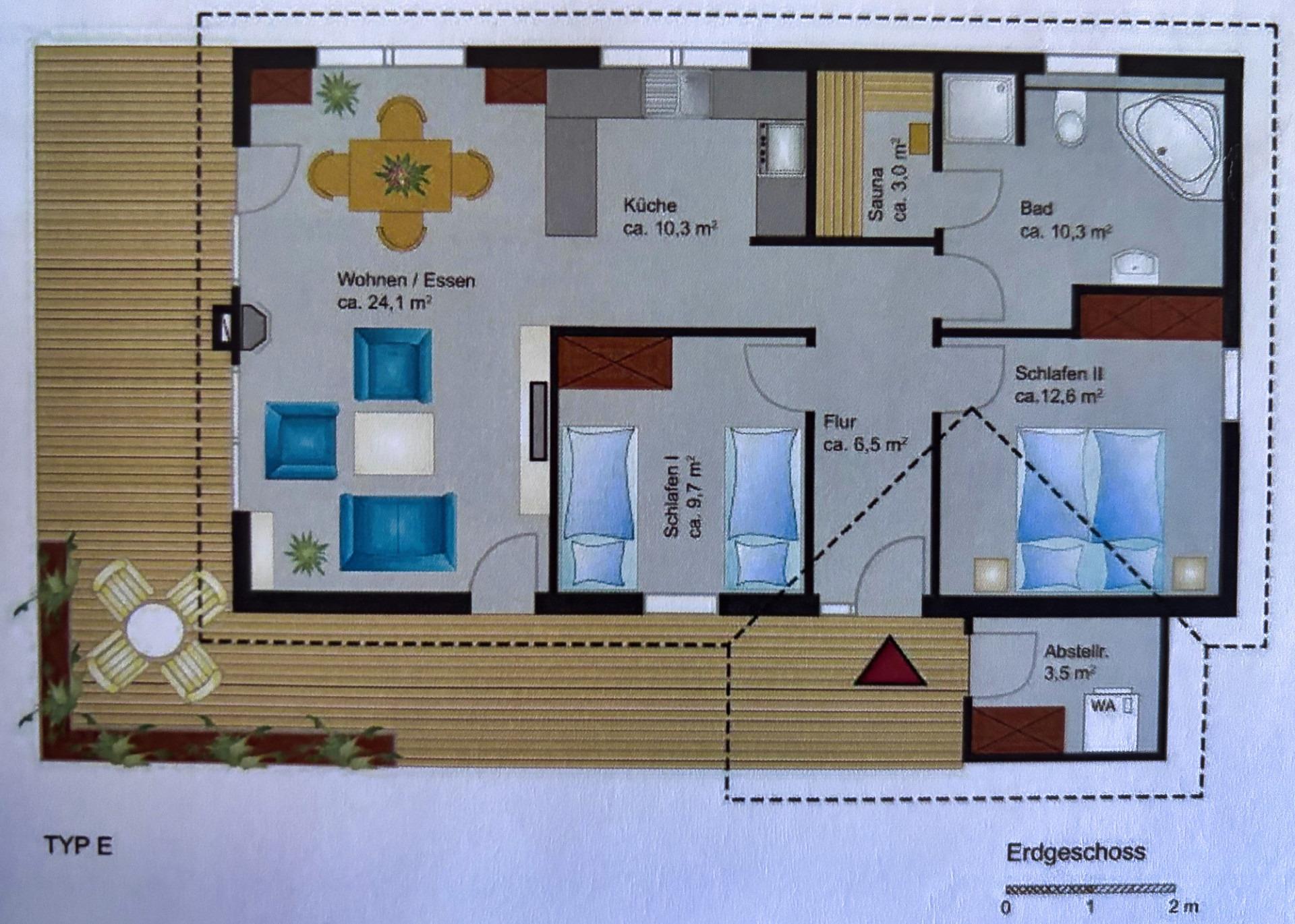 2 Schlafzimmer, Wohnzimmer mit Kamin, Bad mit Sauna und Whirlpool, Terrasse