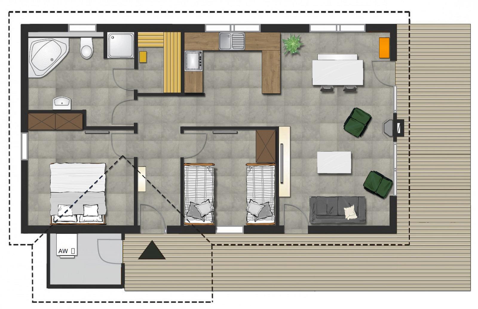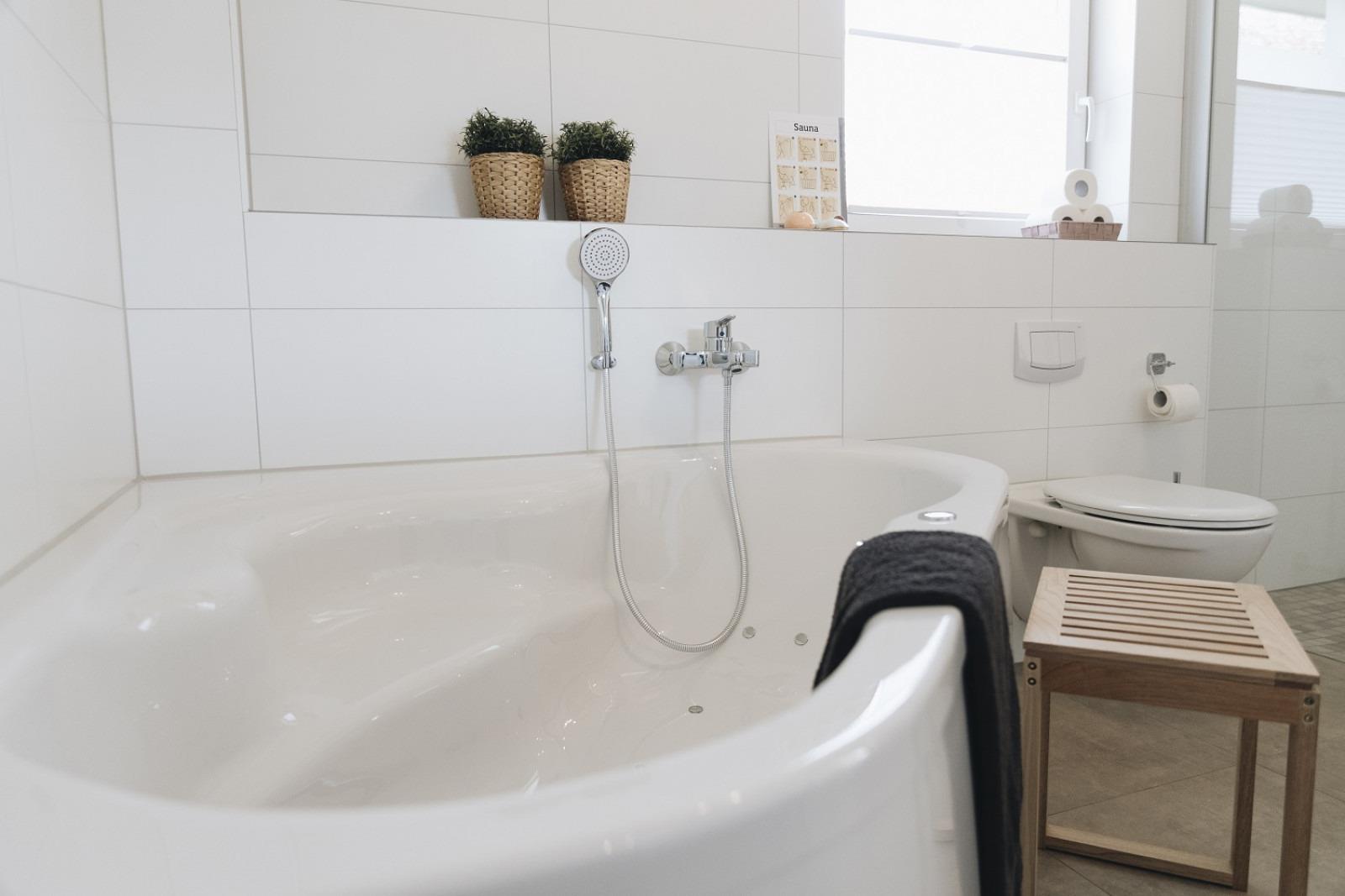 Gönnen Sie sich im Wellnessbad mit Sauna, Whirlpool und bodengleicher Dusche nach einem ereignisreichen Tag wohlverdiente Ruhe. Entspannung pur in modernem Ambiente!