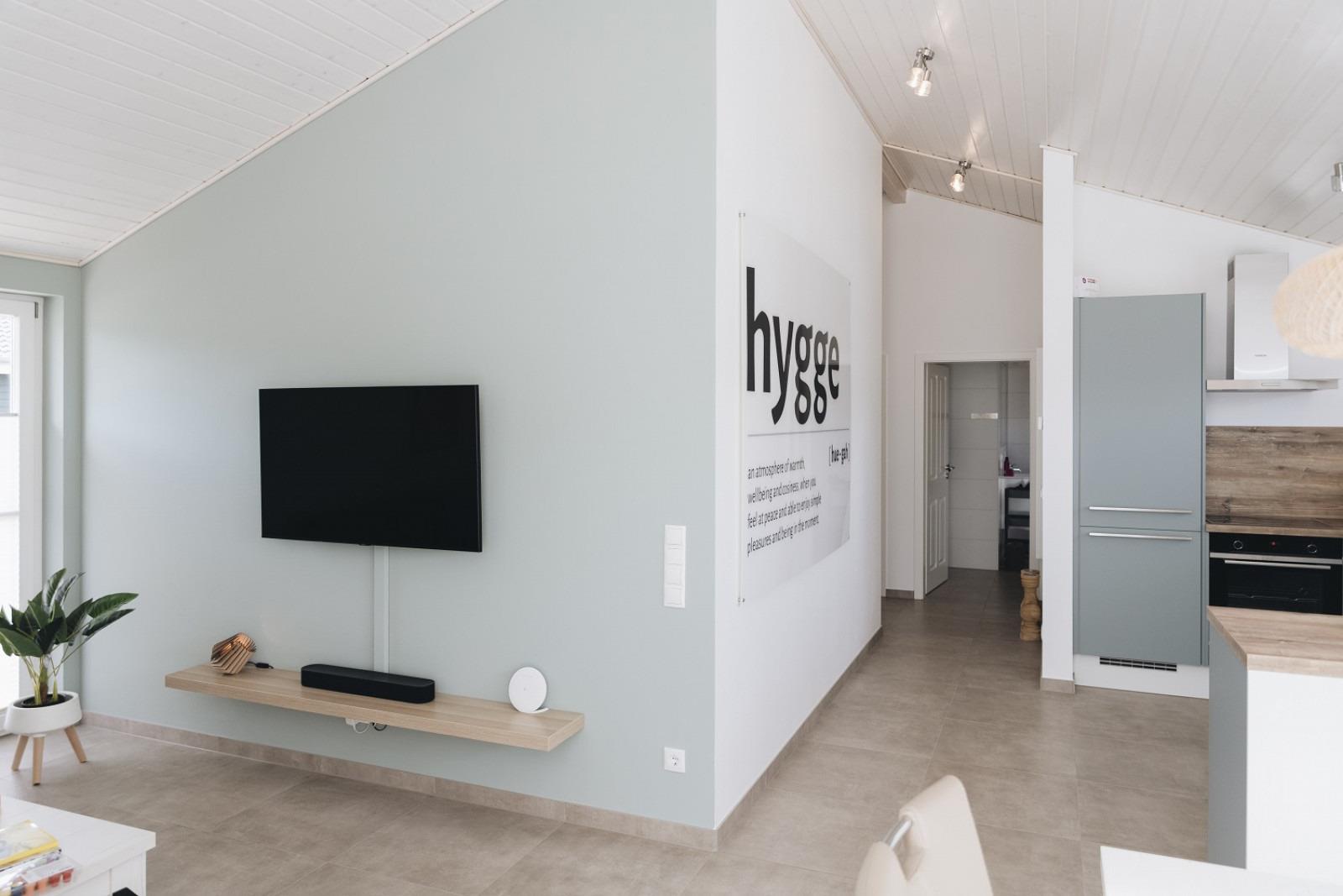 Der einladende Wohnbereich ist perfekt, um entspannte Urlaubsabende vor einem knisternden Kaminfeuer zu verbringen. Ein Flachbild-TV mit Soundbar von Sonos Beam und kostenfreies WLAN stehen Ihnen selbstverständlich zur Verfügung.