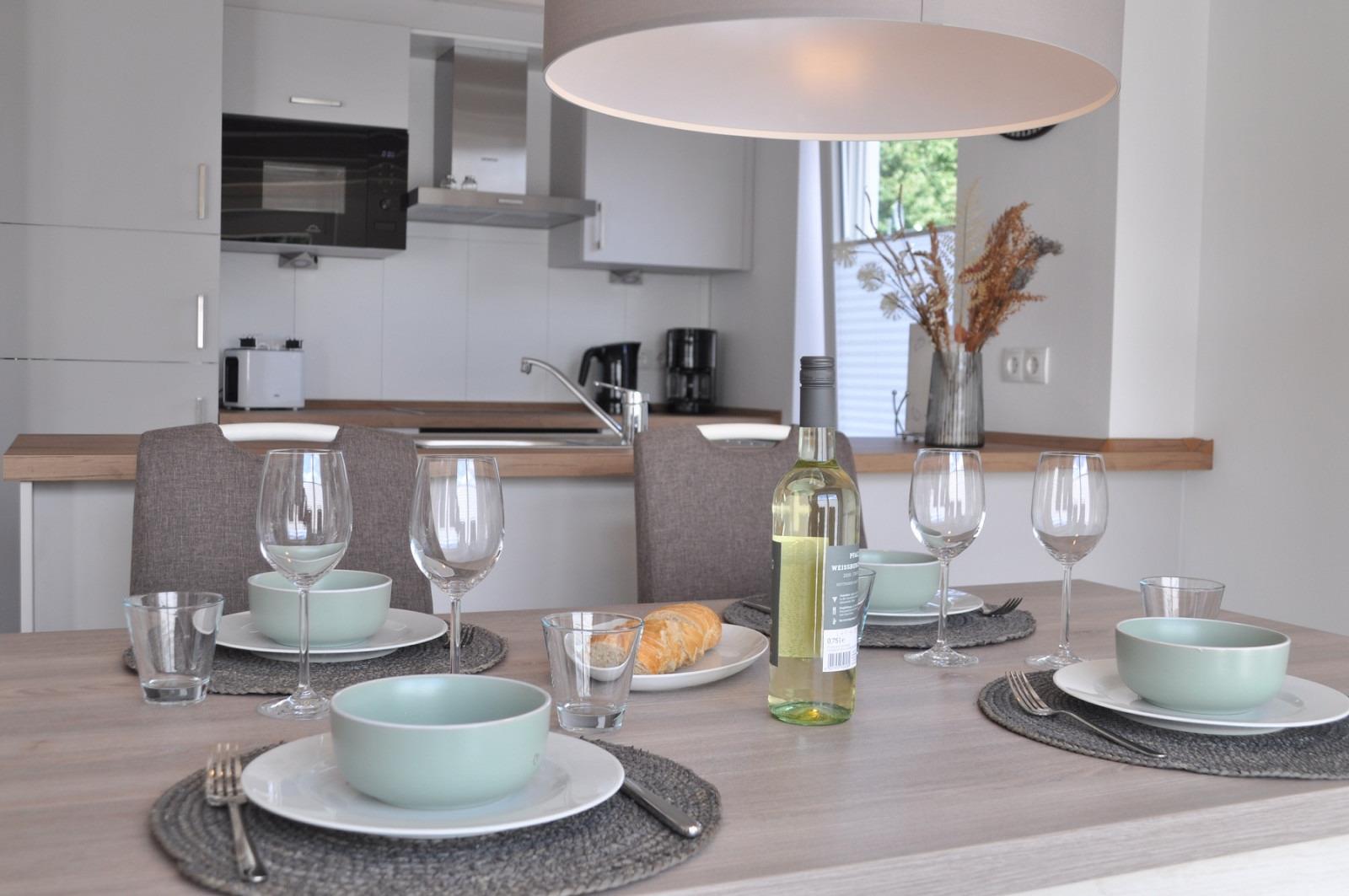 Mit einem gemütlichen Frühstück, zubereitet in der voll ausgestatteten Küche, starten Sie entspannt in den Tag. Der helle Essbereich bietet angenehmes Ambiente mit viel Platz.