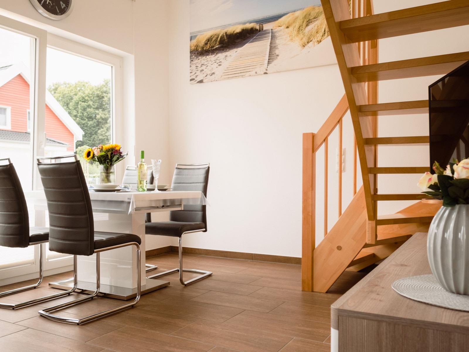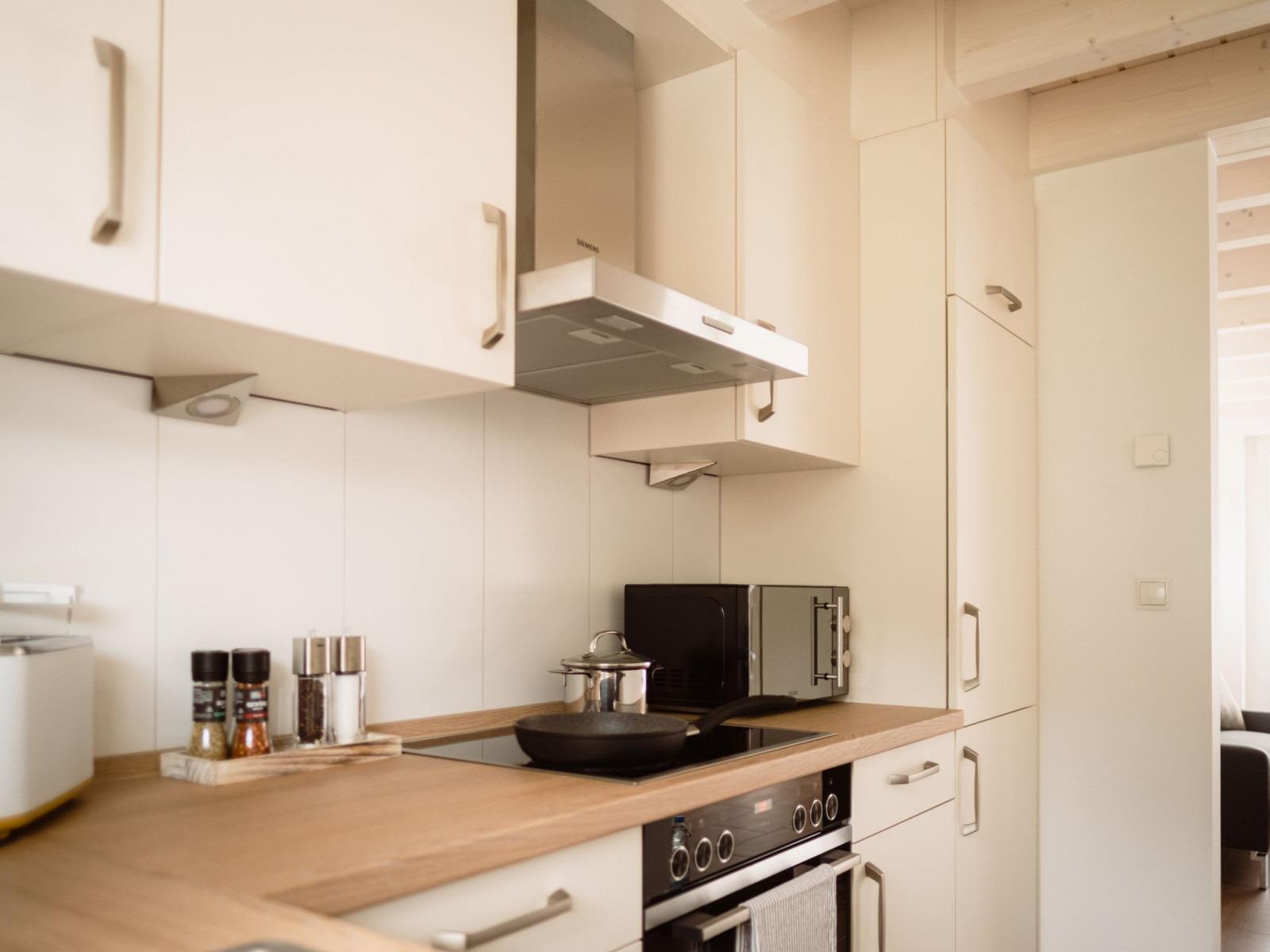 Im Erdgeschoss finden Sie einen Wohnbereich mit gemütlicher Sitzecke mit Kaminofen, einen Esstisch und eine komplett ausgestattete Küche mit Spülmaschine, Kühlschrank, Mikrowelle, Toaster, Handmixer, Wasserkocher und Kaffeemaschine. Für angenehme Temperaturen zu jeder Jahreszeit sorgt eine moderne Klimaanlage.
