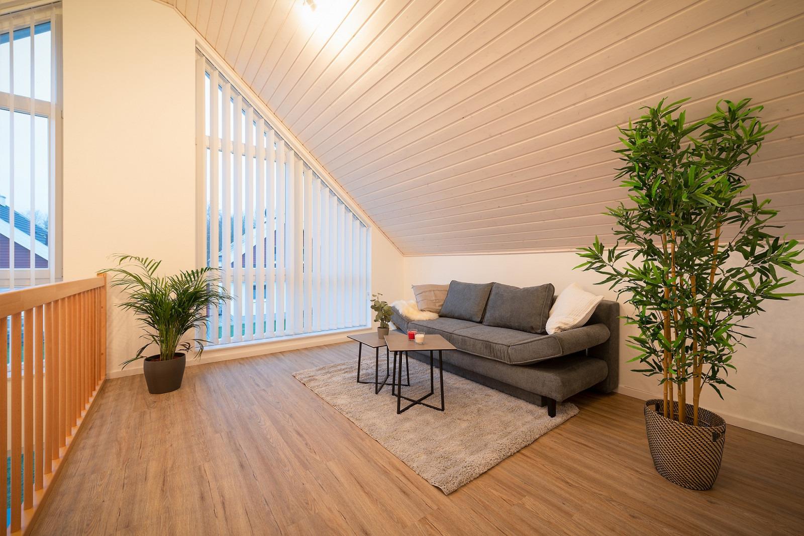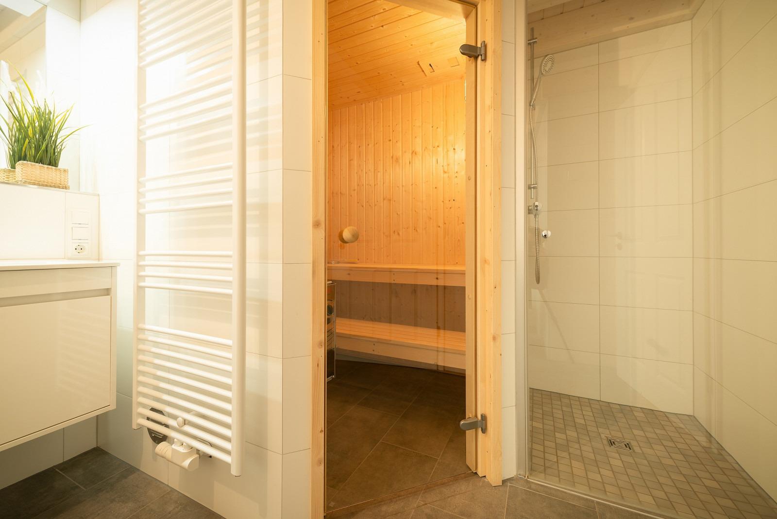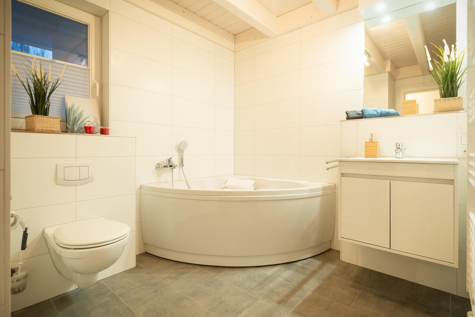 Verbringen Sie einen gemütlichen Abend im großzügigen Wohnbereich vor dem Kamin oder gönnen sich einen Aufenthalt im Wellnessbad mit Sauna, Whirlpool und bodenebener Dusche.