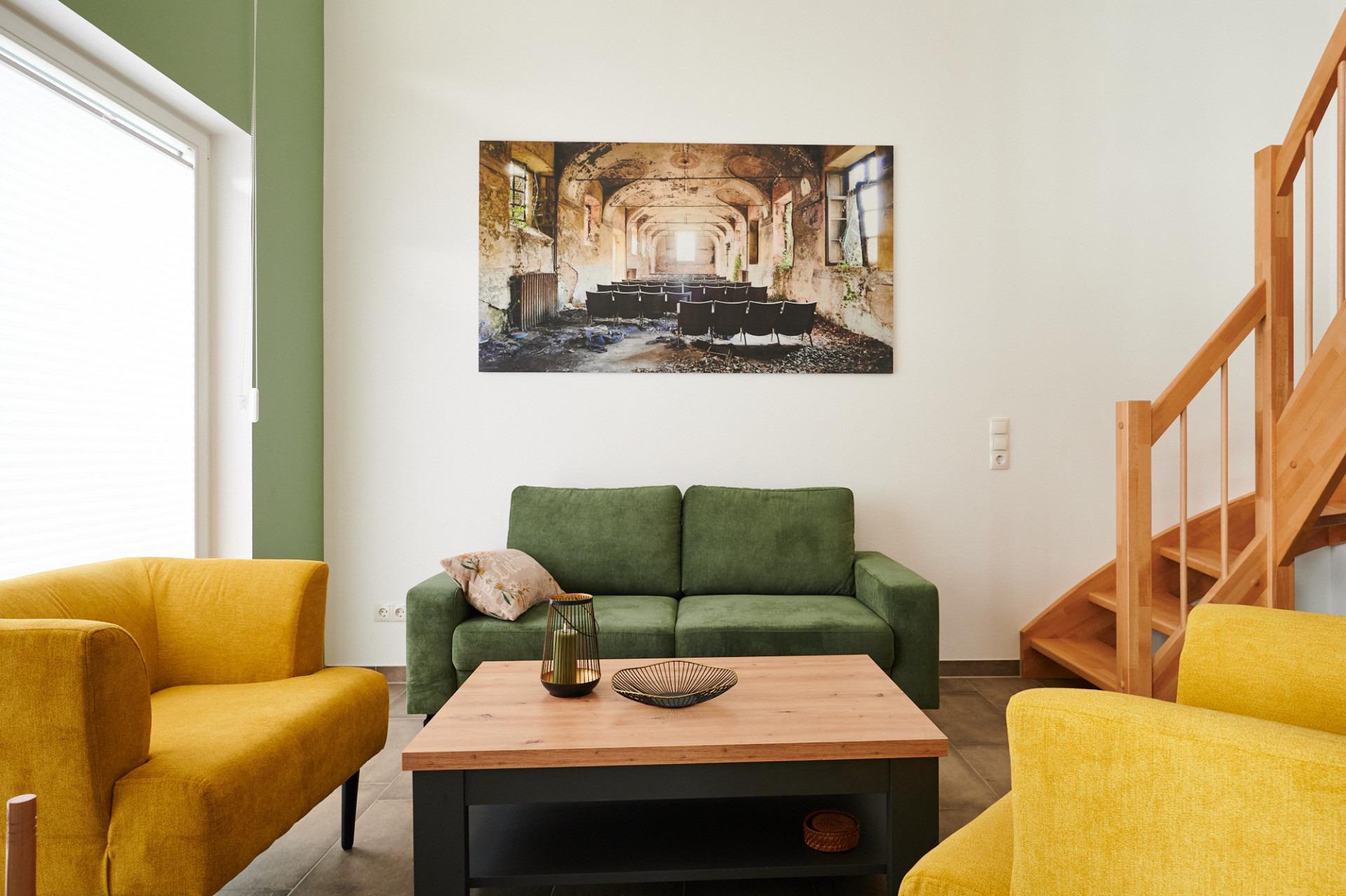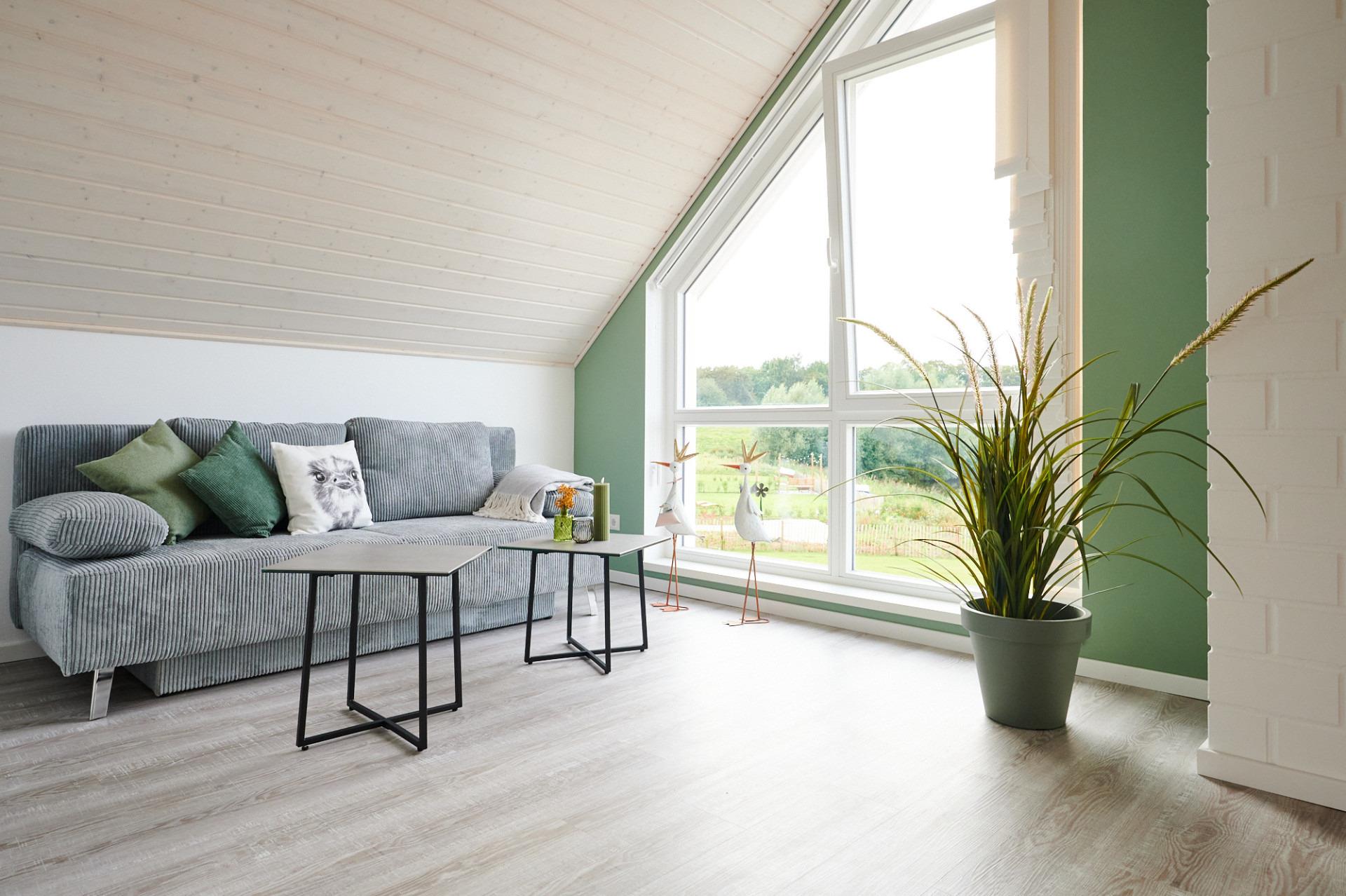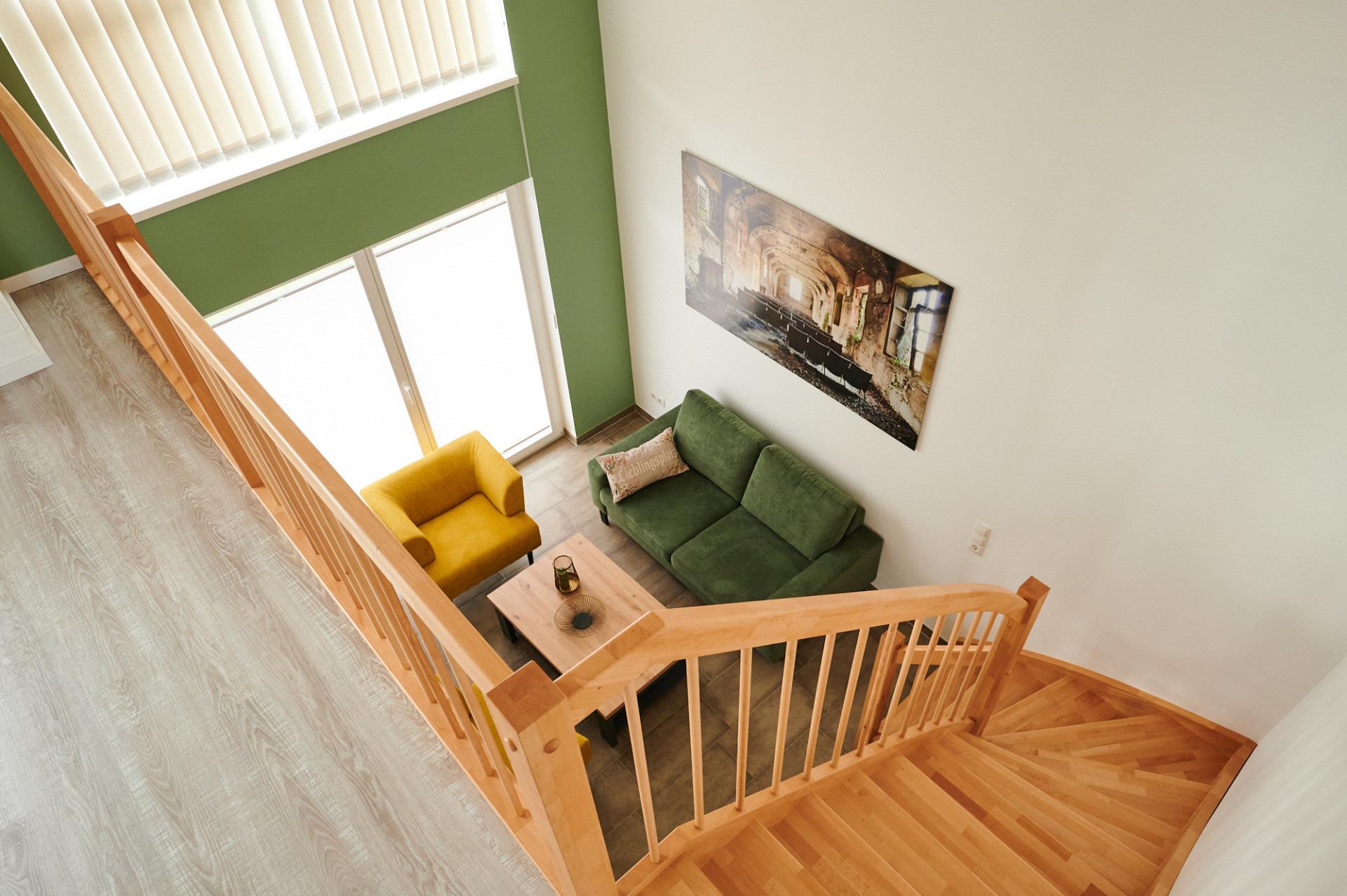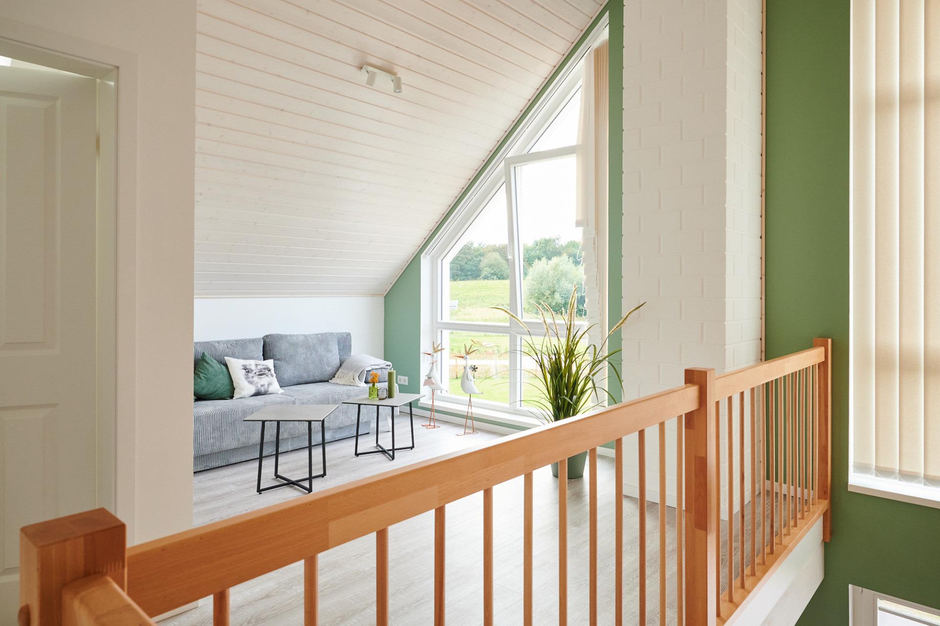 Im Obergeschoss auf der Galerie erwartet Sie ein bequemes Sofa mit Blick auf den Seepark.