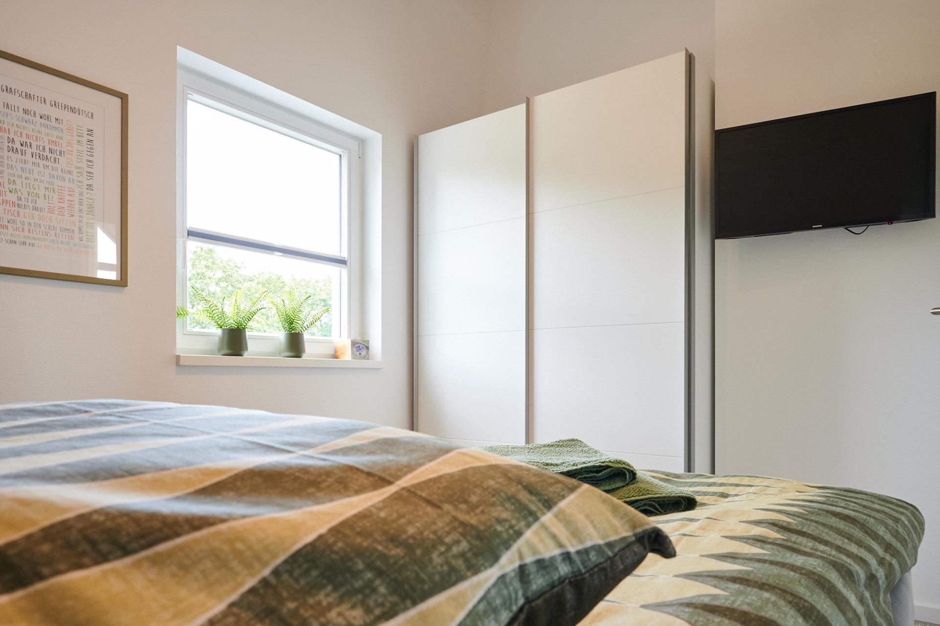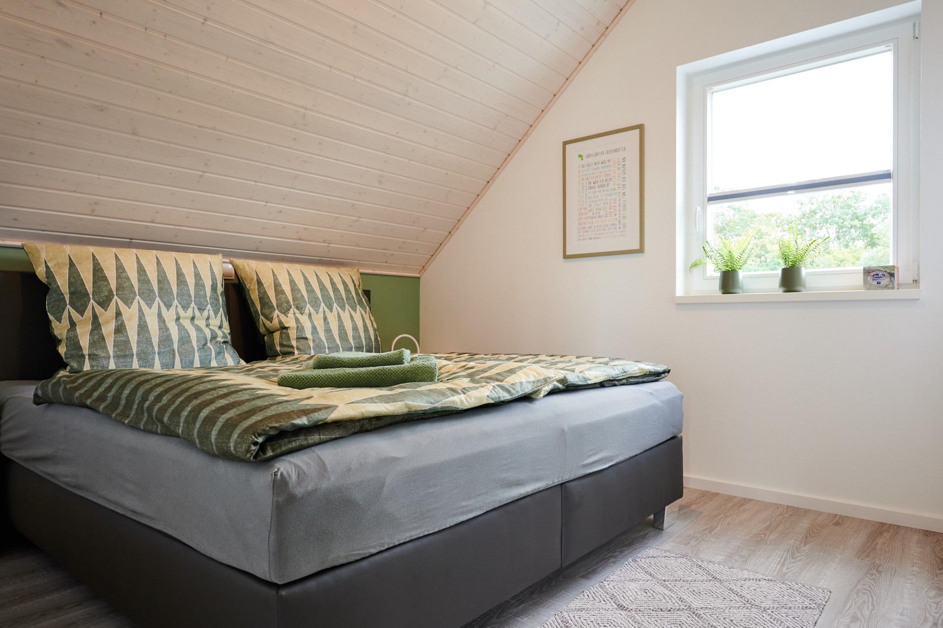 Zudem befinden sich im Obergeschoss beide Schlafzimmer, jeweils mit Boxspringbett, gemütlich eingerichtet und perfekt für erholsame Nächte.