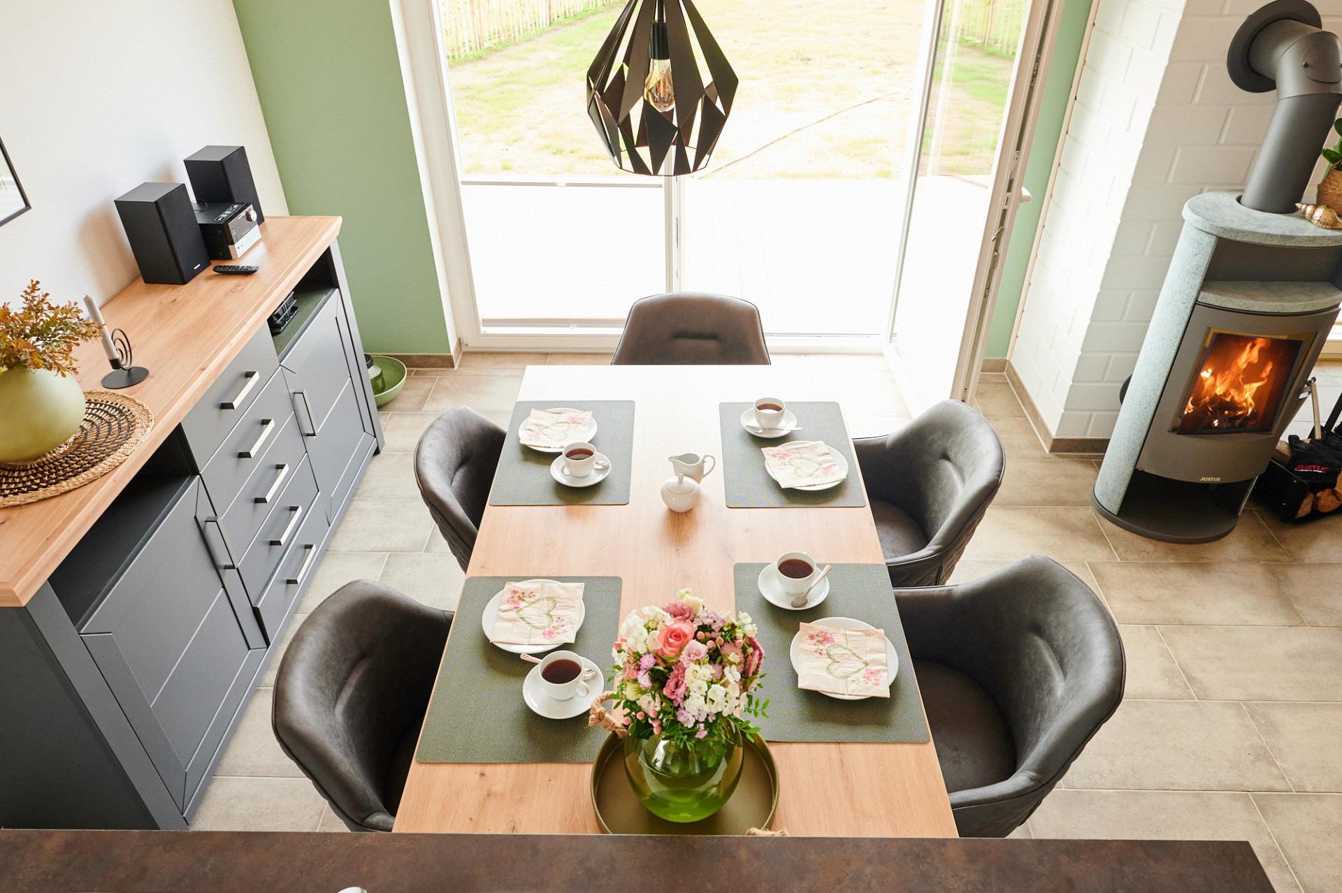 Ein großzügiger Esstisch bietet Platz für gemeinsame Mahlzeiten und Spielabende.