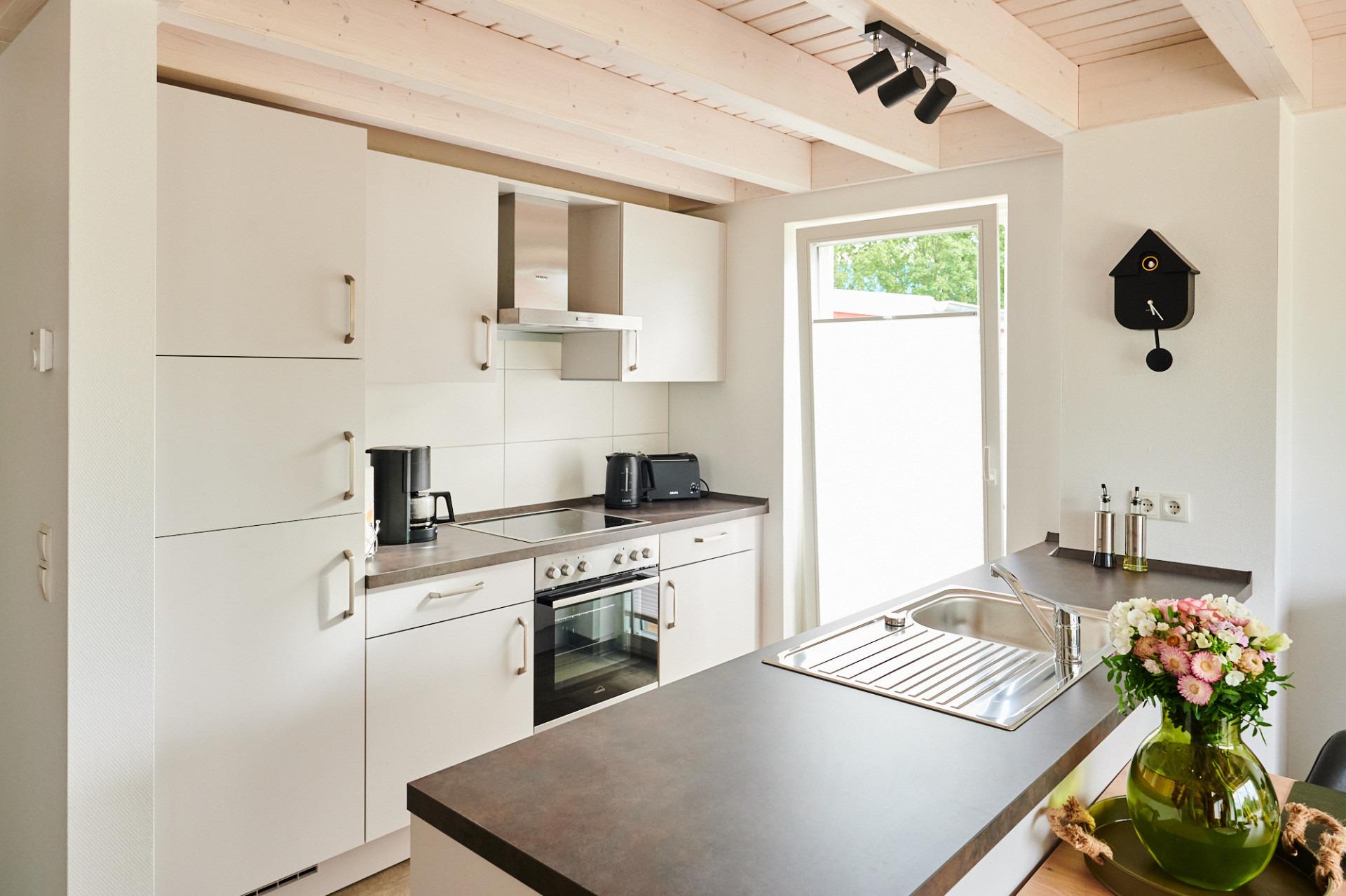 Die gut ausgestattete Küche mit einem Tresen direkt am Essbereich ermöglicht das Zubereiten köstlicher Mahlzeiten, ohne gemeinsame Zeit zu verlieren.