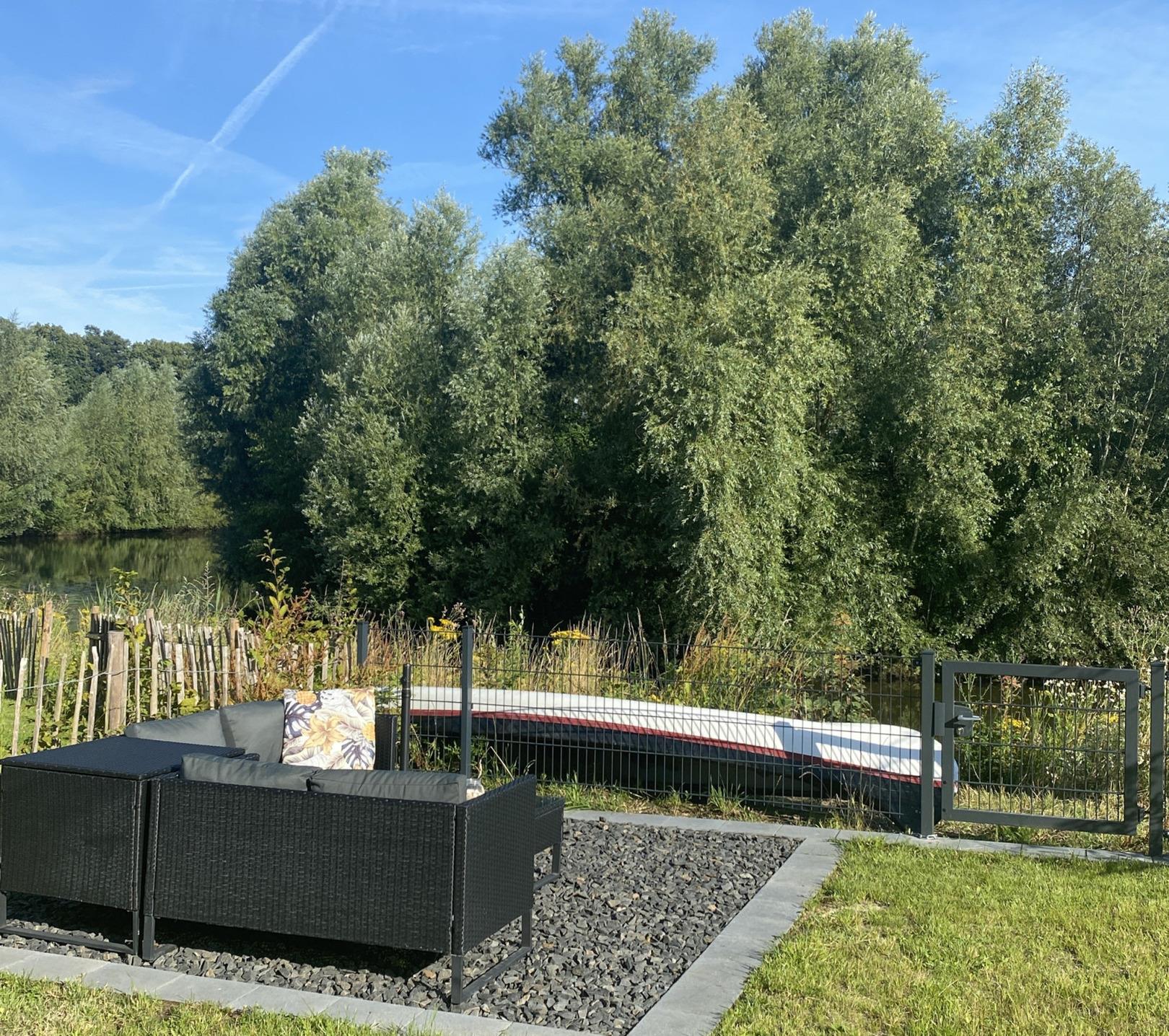 Aus dem Wohn- und Essbereich heraus gelangen Sie auf die Terrasse, wo Sie in Liegestühlen entspannen und die ruhige Umgebung genießen können. Zusätzlich lädt im Garten eine Lounge mit einem Solar-Sonnenschirm am Wasser zum Verweilen ein.