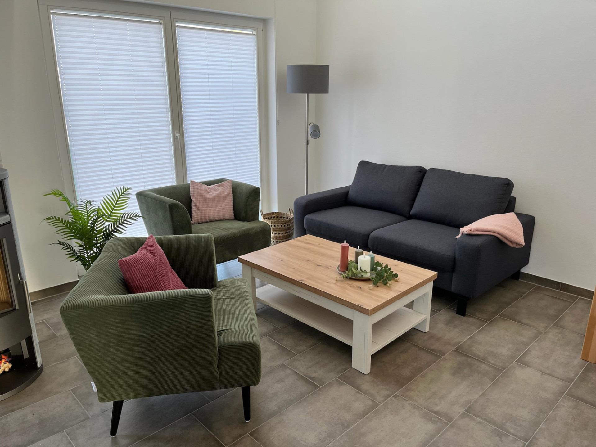 Der Wohnbereich bietet mit einem Sofa und zwei gemütlichen Sesseln die perfekte Umgebung, um in kalten Stunden vor dem knisternden Kamin zu verweilen.
