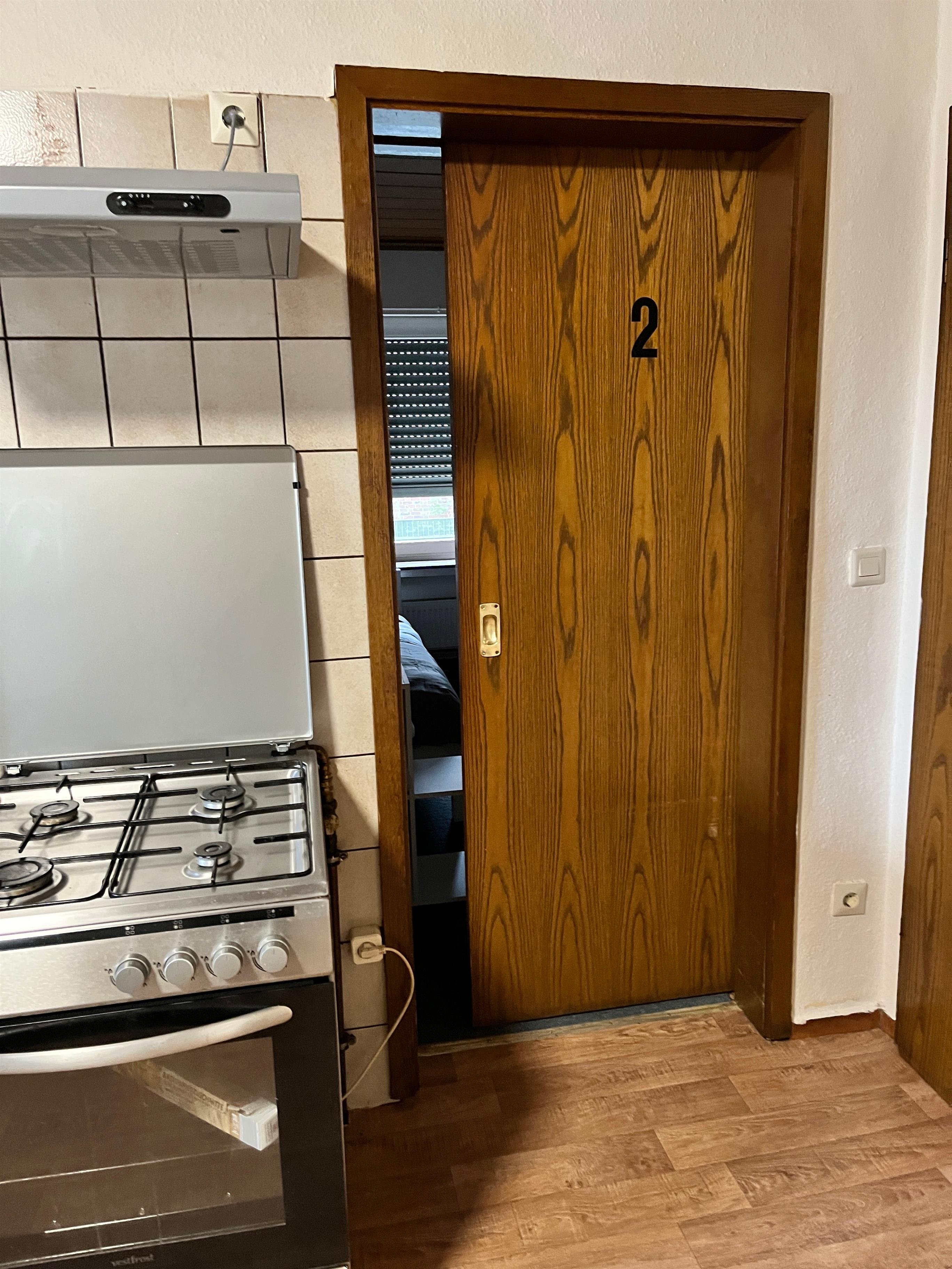 -Geradeaus finden Sie die geschlossene Zugangstür, die über ein Codeschloss geöffnet werden kann. Der Code wird Ihnen nach der Buchung/Zahlung per E-Mail oder SMS zugesandt.