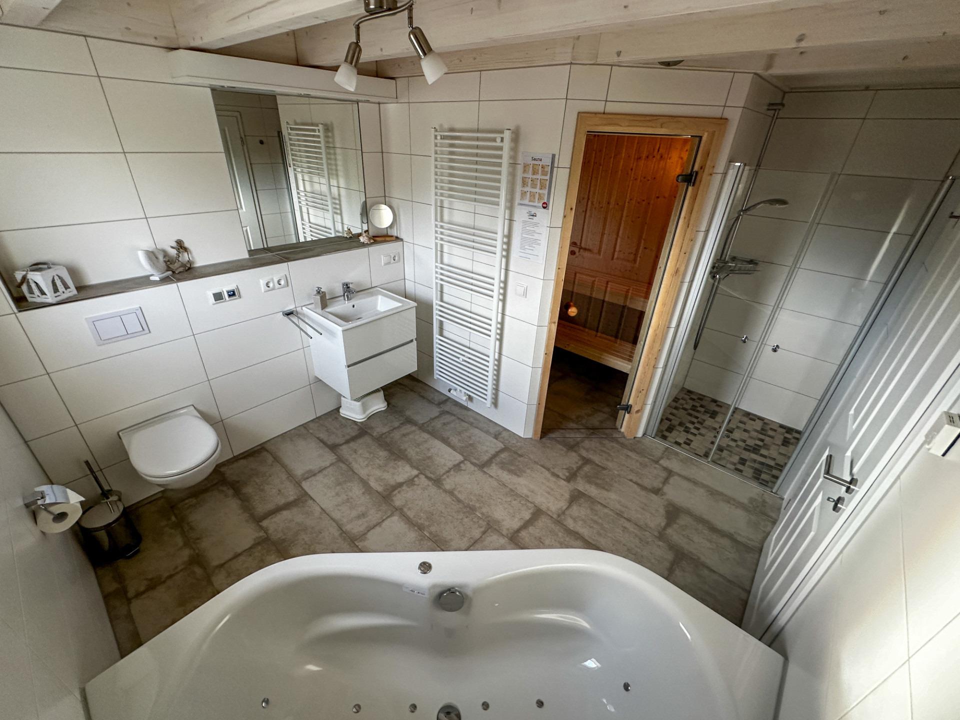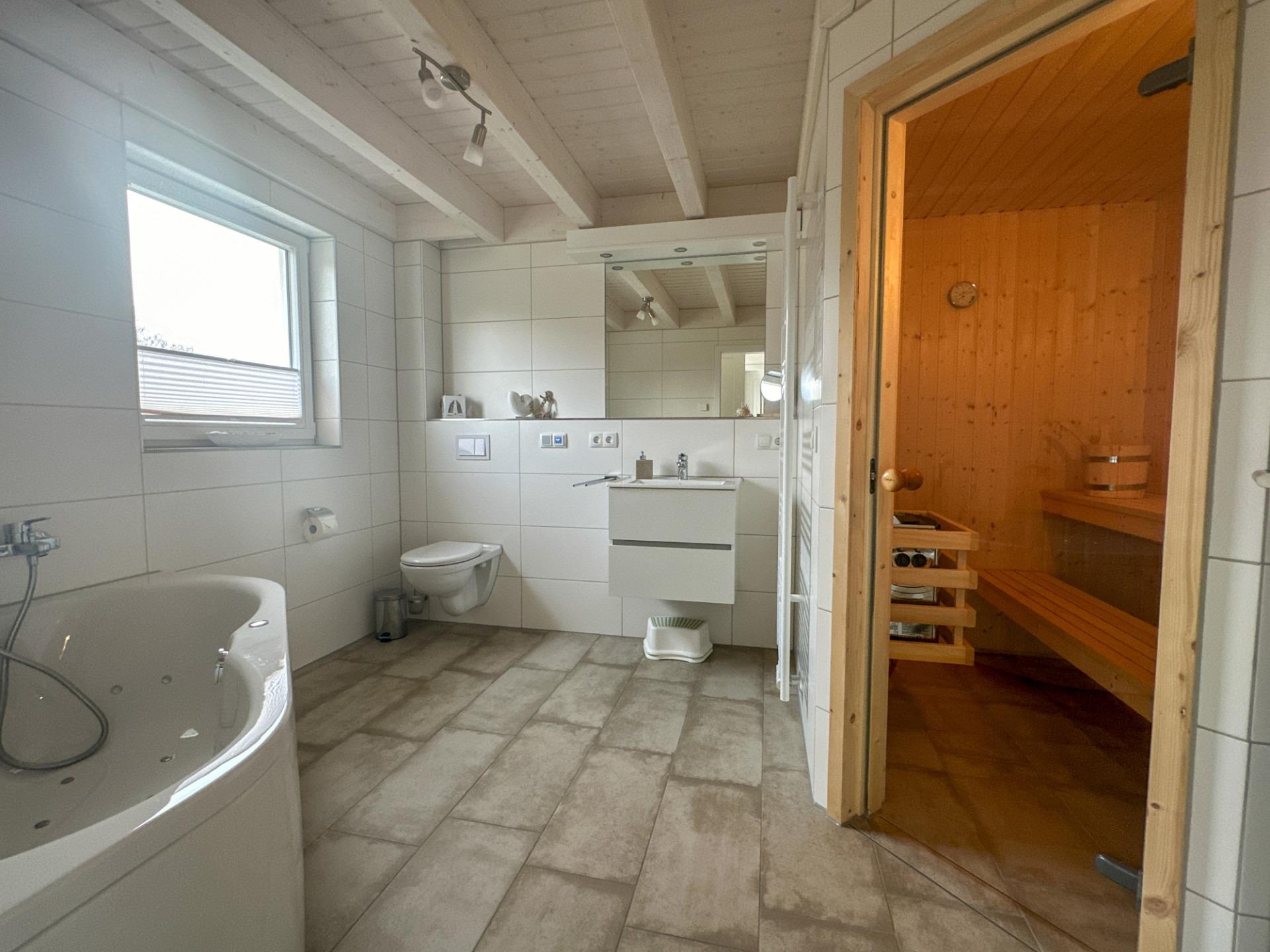 Im Erdgeschoss finden Sie Ihr eigenes Wellnessbad mit Sauna, Whirlpool und bodengleicher Dusche. Hier können Sie pure Entspannung erleben und den Stress des Alltags hinter sich lassen. Die Fußbodenheizung rundet den Wohlfühleffekt ab.