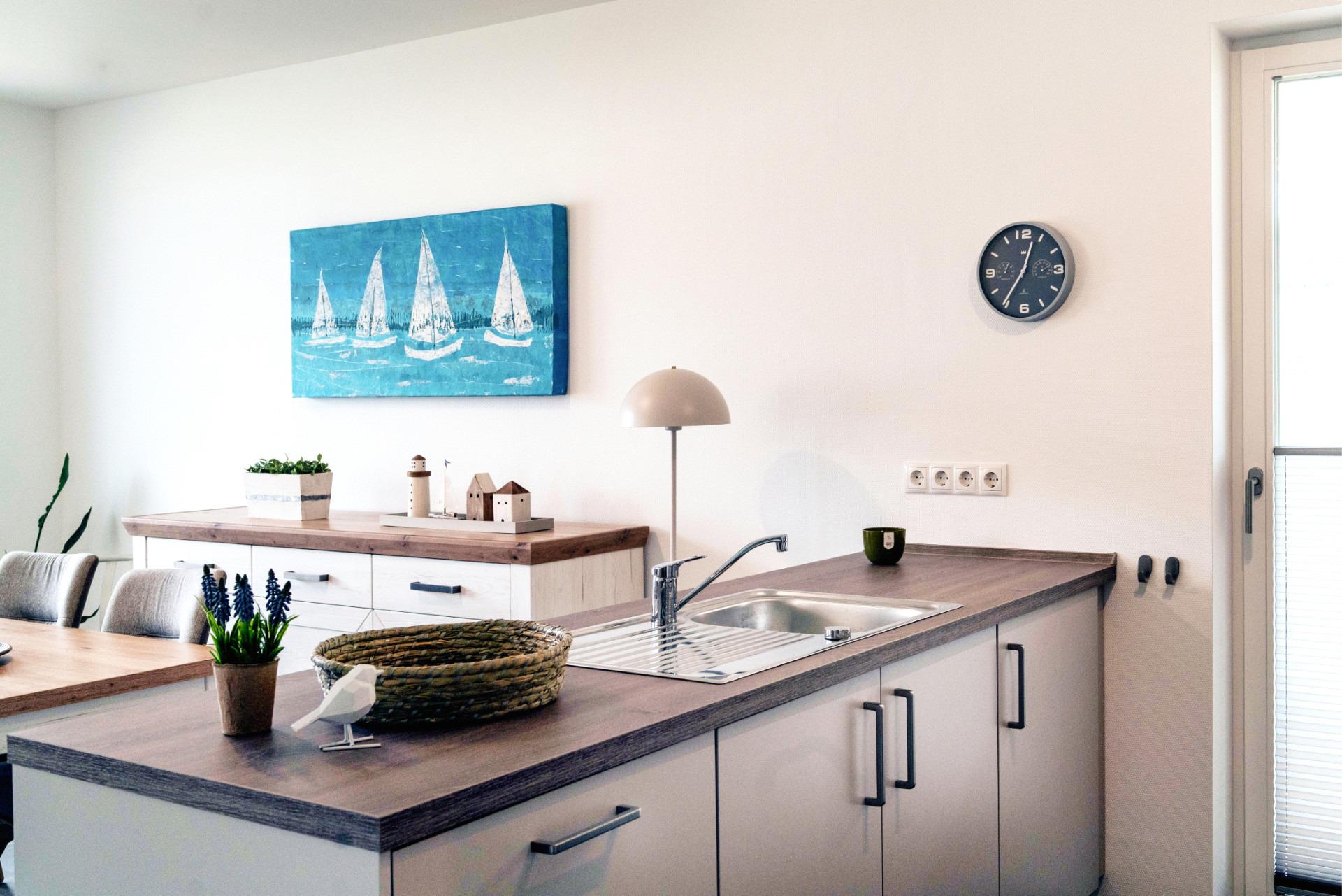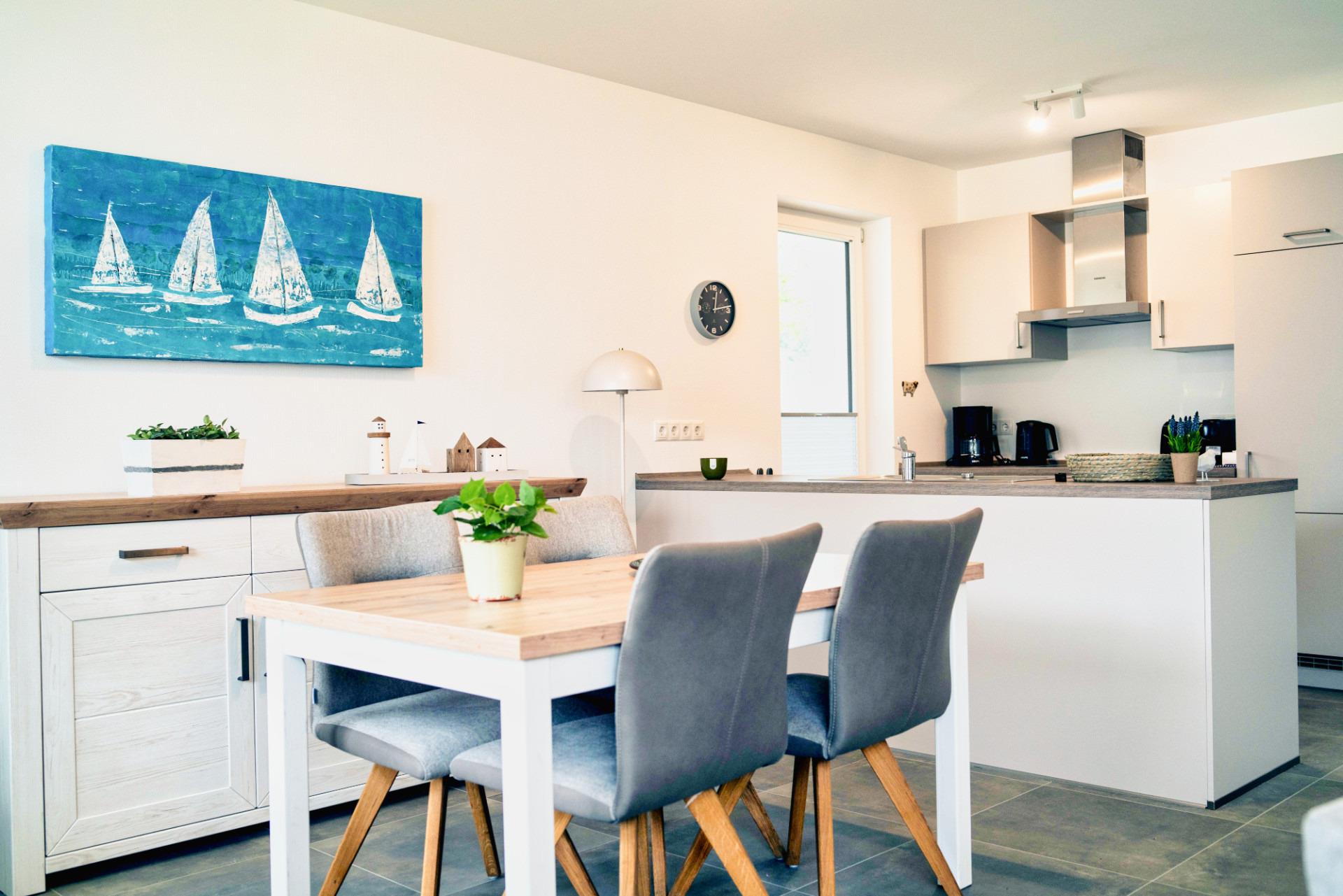 Der offene Wohn- und Essbereich ist hell, modern und gemütlich gestaltet. Die voll ausgestattete Küche bietet alles, was Sie für den täglichen Bedarf benötigen - vom Geschirrspüler bis zum Waffeleisen.