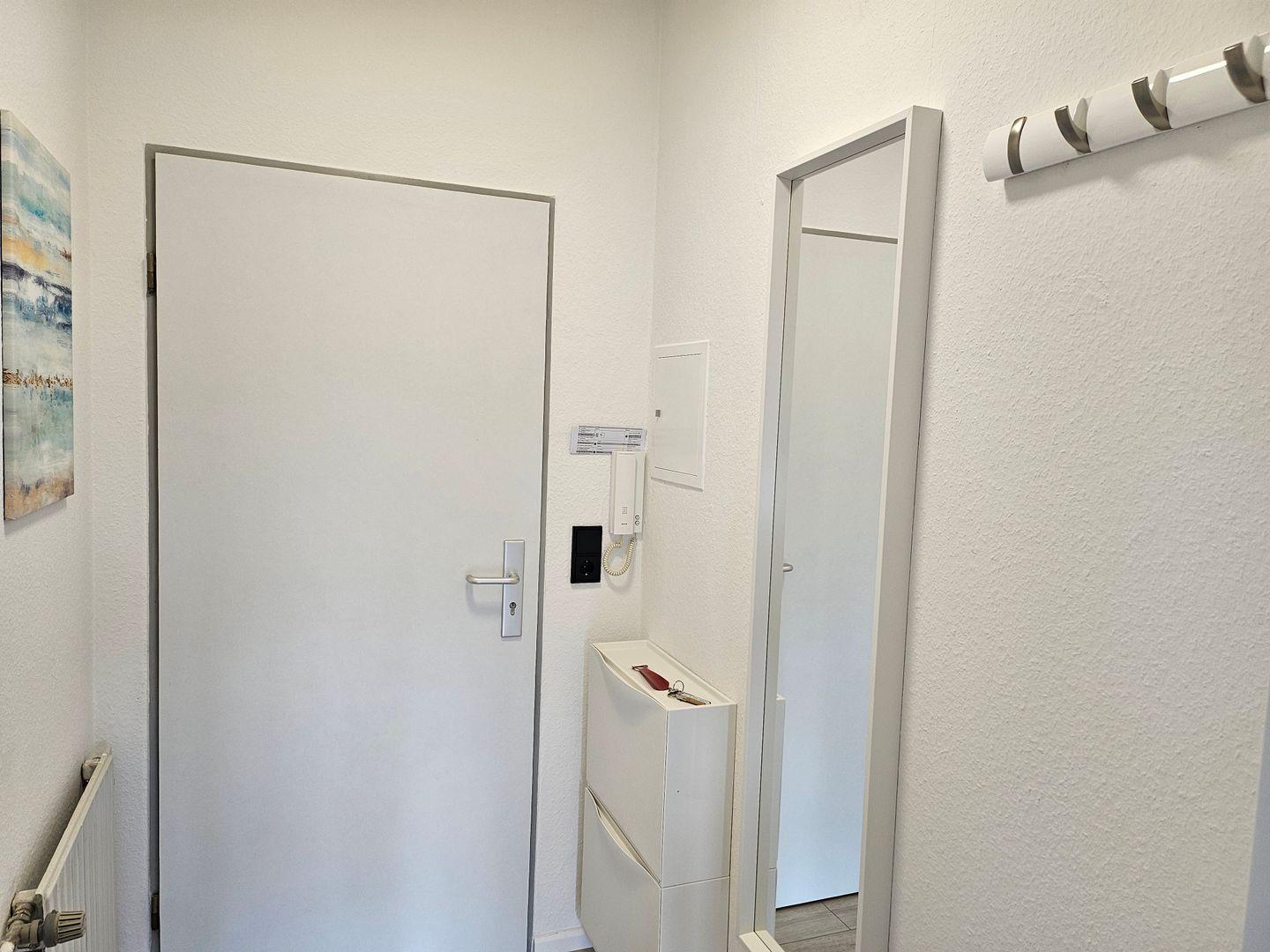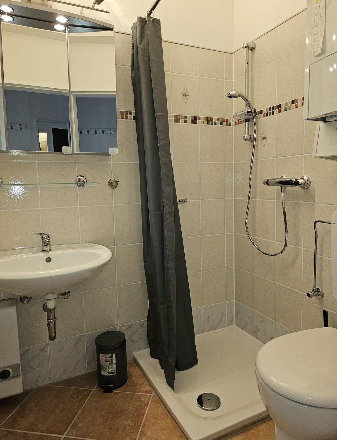 Das Badezimmer ist mit einer Dusche, modernem Handtuchheizkörper und einem Lüftungsabzug ausgestattet. Diese Wohnung wurde vollständig renoviert und mit viel Liebe zum Detail eingerichtet.