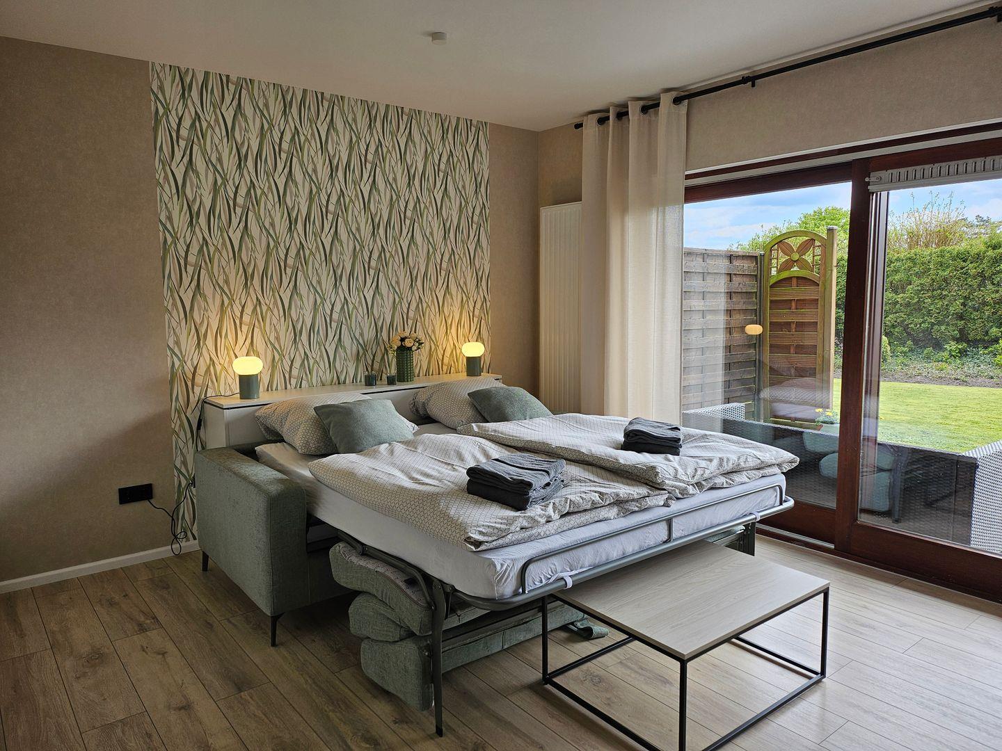 Ein leicht bedienbares hochwertiges Schlafsofa mit Lattenrost (180 x 200) bietet zusätzlichen Komfort und Flexibilität für das Zuhause auf Zeit.