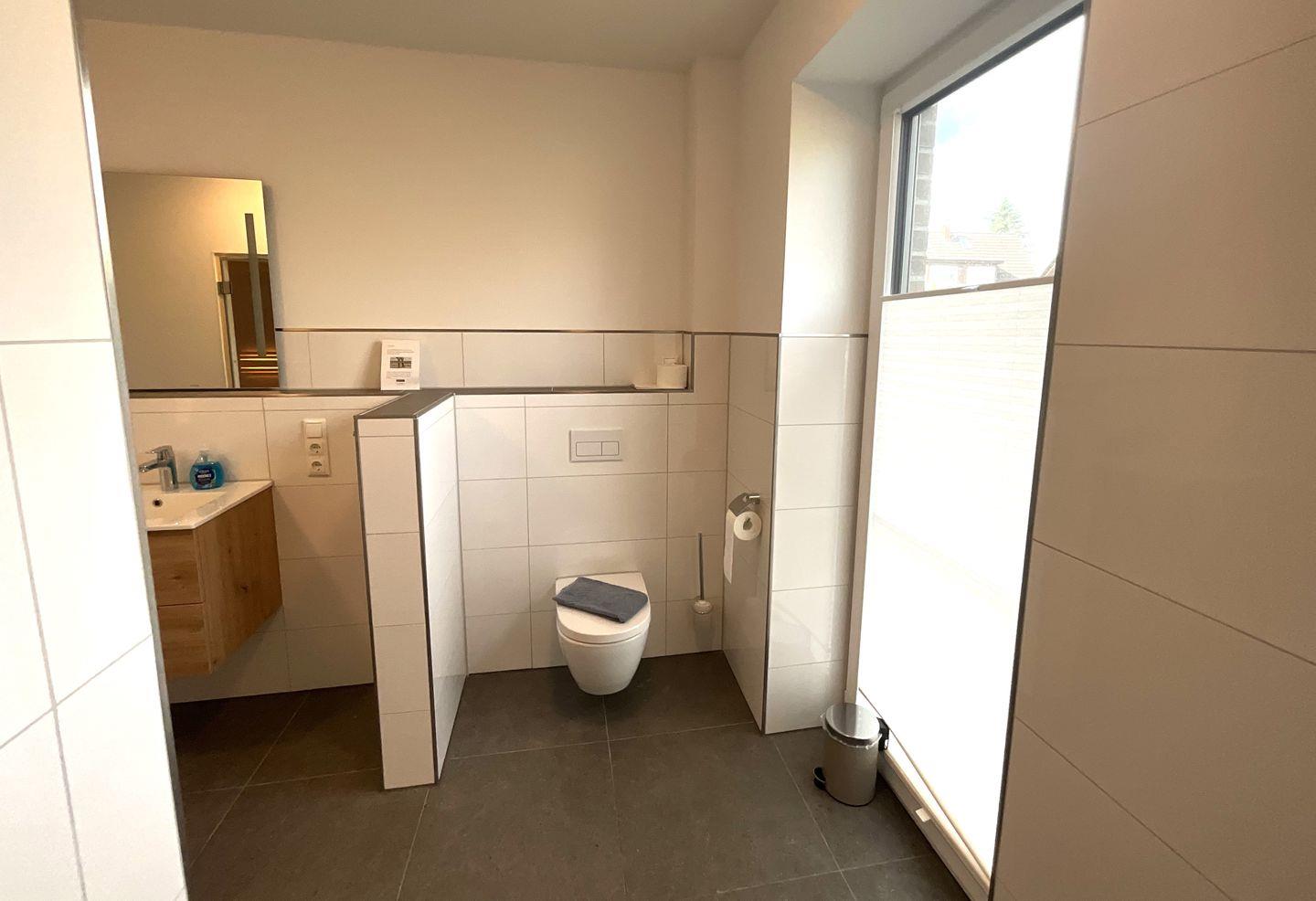 Das hochwertige Badezimmer ist mit eigener Sauna, bodengleicher Dusche, WC, Waschbecken, Spiegel, Fenster, Haartrockner und allen notwendigen Annehmlichkeiten eingerichtet. Eine Waschmaschine und ein Trockner stehen zur Eigennutzung bereit.