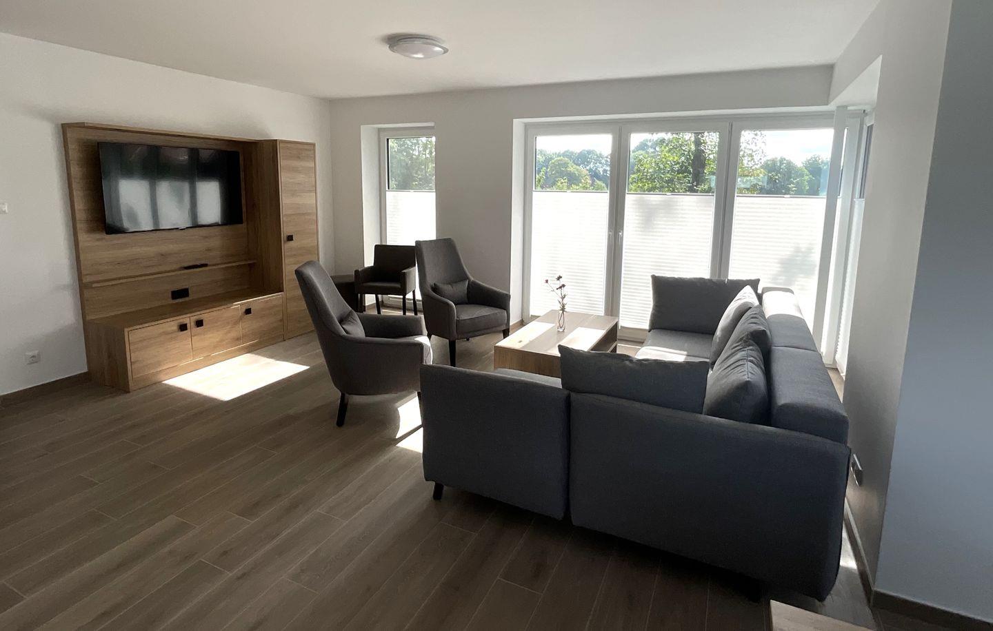 Wohnzimmer: gemütliche Sitzecke mit Sessel, Sofa, Flachbildfernseher, Empfang deutschsprachiger TV-Programme